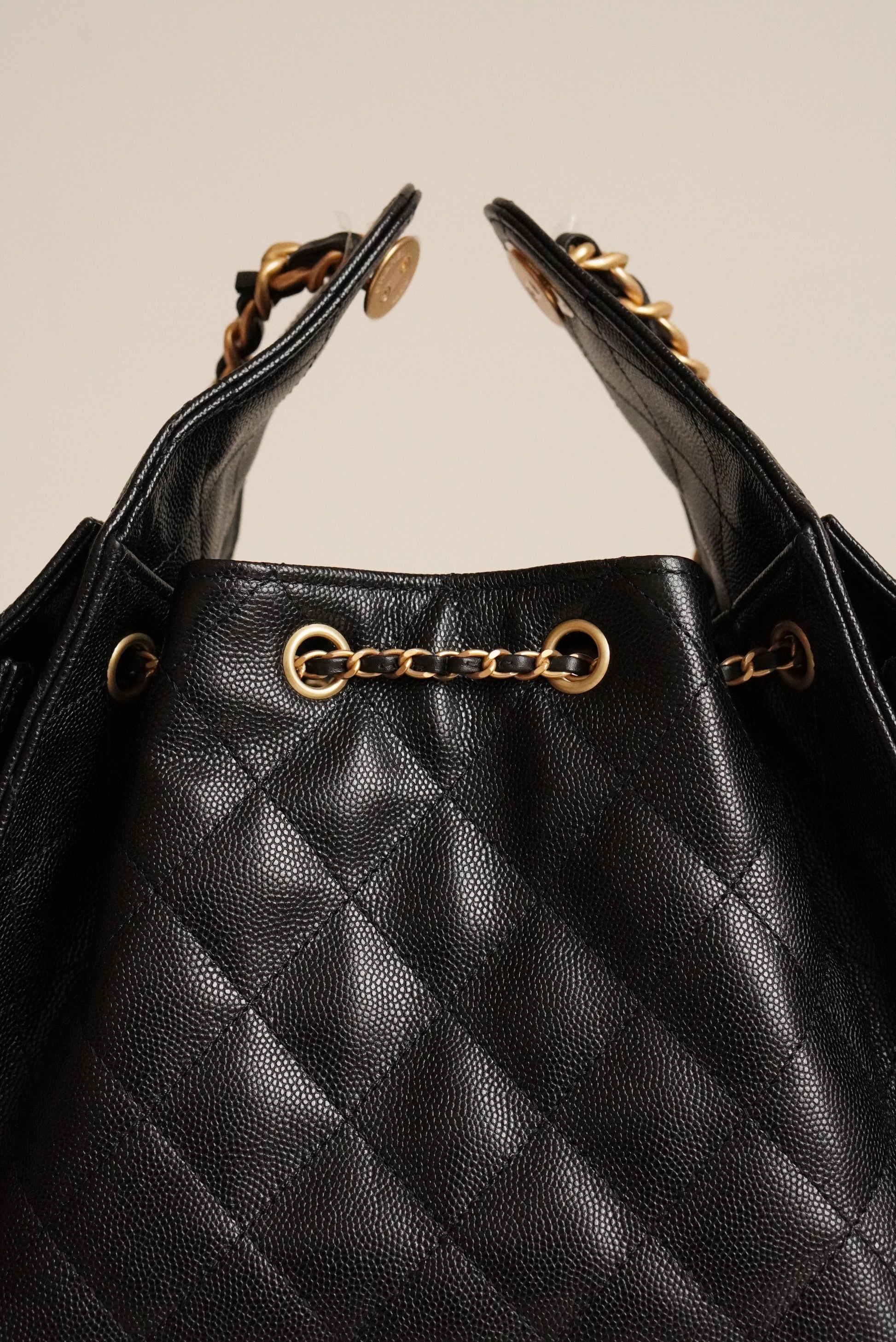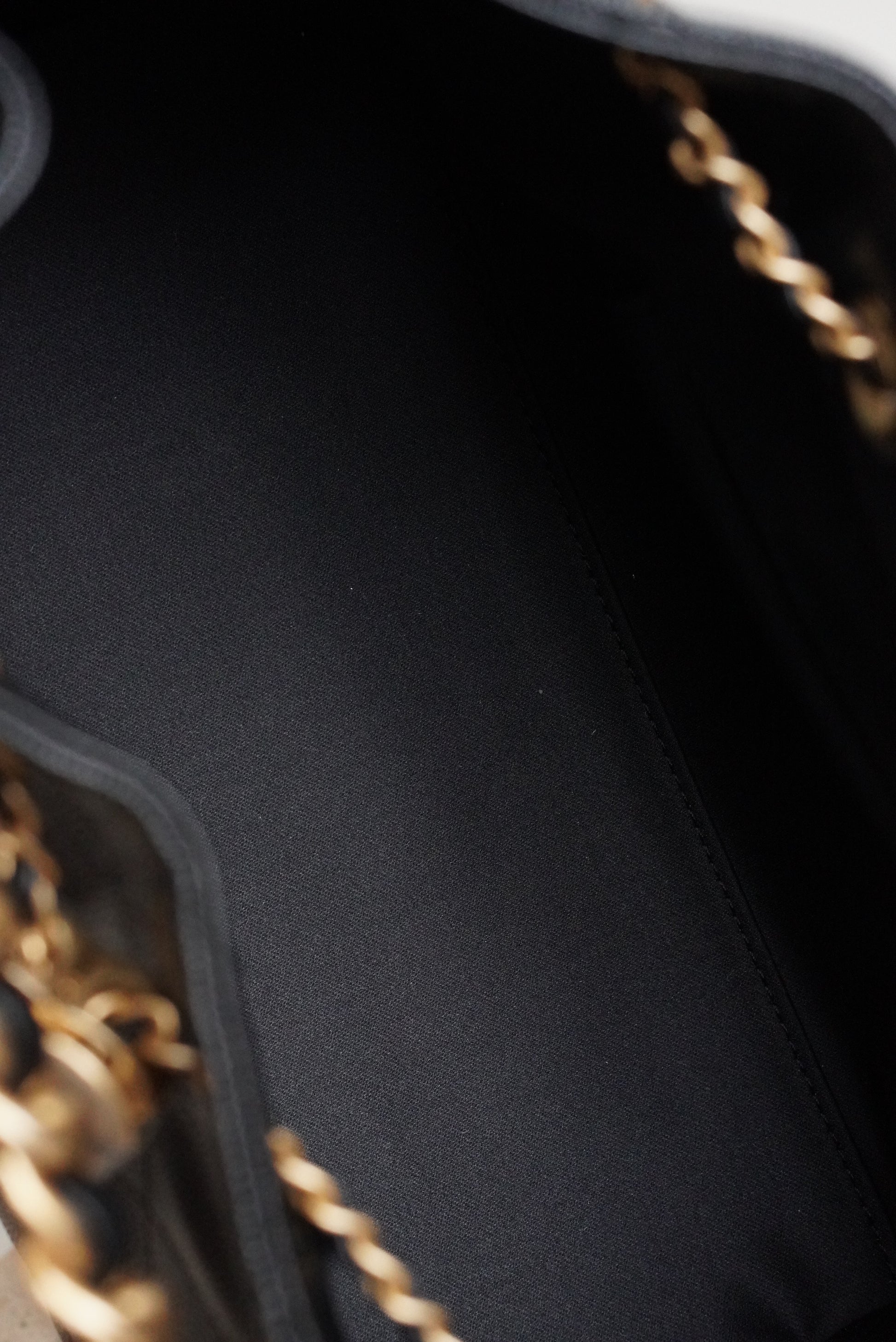 The Chanel 25 Small is a highly sought-after hobo-style handbag that blends everyday practicality with the timeless elegance of the Chanel aesthetic. Crafted in luxurious black caviar leather, the bag features a softly structured silhouette with a subtle slouch, giving it a relaxed yet polished look. The gold-tone hardware adds a classic touch, while the leather-interlaced chain strap offers comfortable shoulder wear. A drawstring closure allows the bag to open and close gracefully and discreet magnetic side pockets provide easy access for essentials. The interior is thoughtfully designed for daily organization, making the Chanel 25 both stylish and functional.