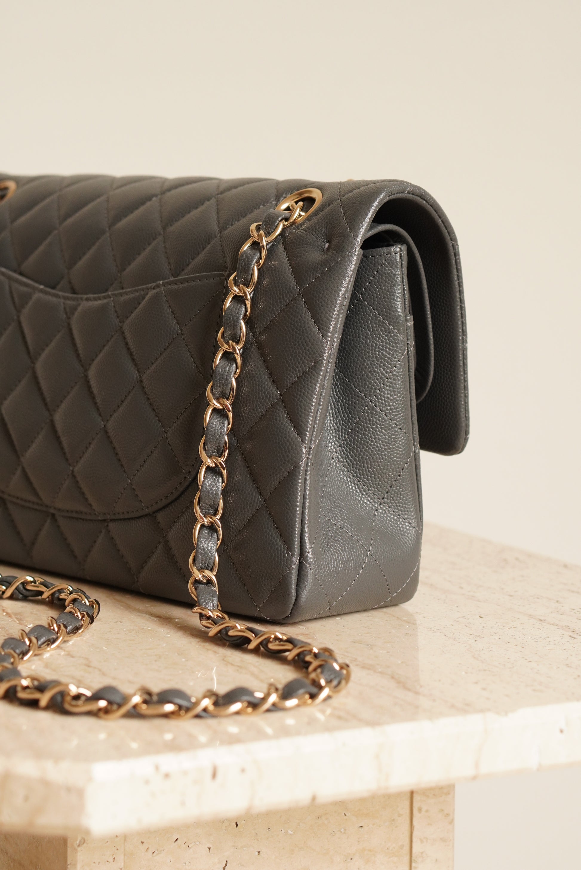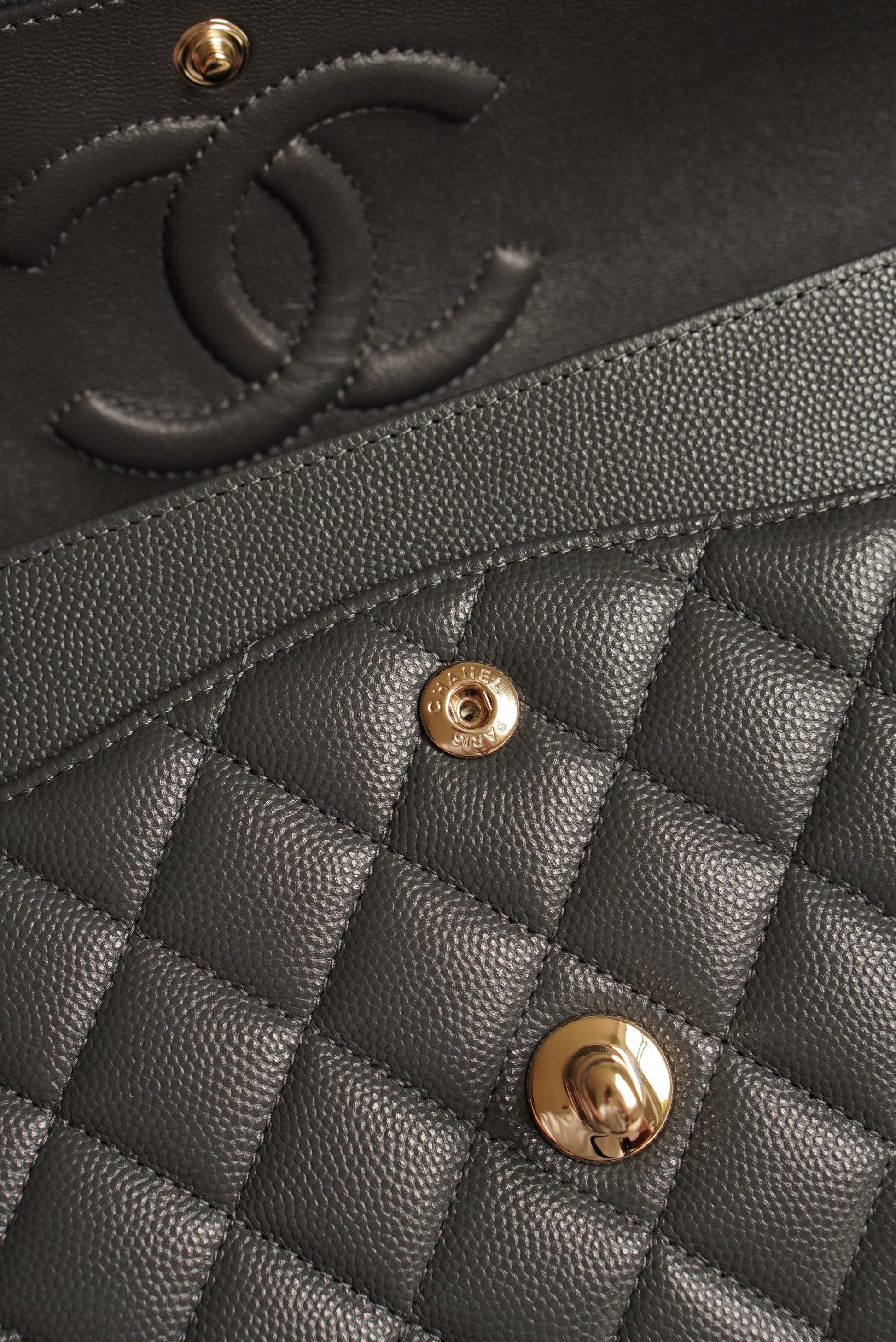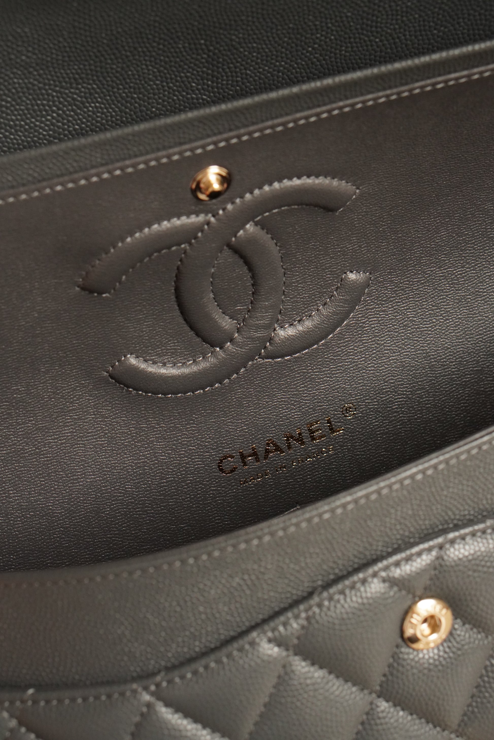 The Chanel Classic Medium double flap in dark grey caviar leather with light gold hardware is rare and a true classic. A Chanel Classic flap bag always refers to the flap bags with the CC lock and a leather-woven chain. This Chanel comes with a double flap. This means that the bag has an exterior flap closure, as well as an interior flap compartment. Other than the "main" pockets in the interior of this classic, there are a couple of extra pockets. First off, the biggest flap, that is used to close the bag, has a small inner pocket that can be closed with a zipper. Second, in between the two internal pockets, there is a space designed to hold a single lipstick. And third, on the outside of the bag there is a slip-in pocket. Inside of these Chanel Classic Medium in dark grey caviar leather you will find grey leather with a Chanel logo on the biggest flap. The Chanel Classic Medium comes with a gold-toned metal chain, that can be used to wear the bag on the shoulder. The chain is not adjustable, but can also be worn folded to make the chain shorter. It's spacious enough to hold essentials including keys, a card holder and a smartphone.