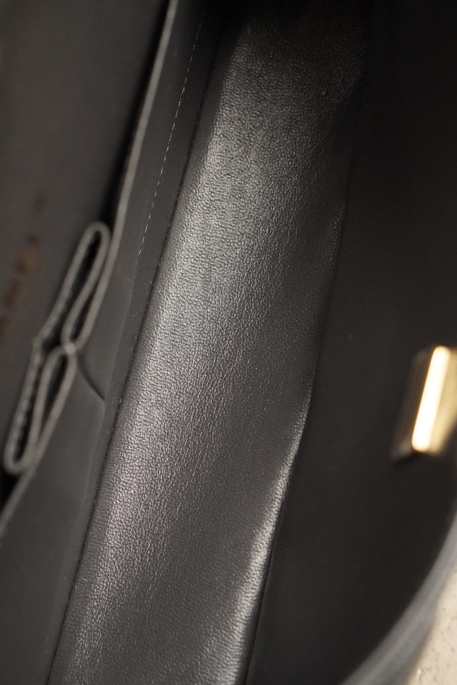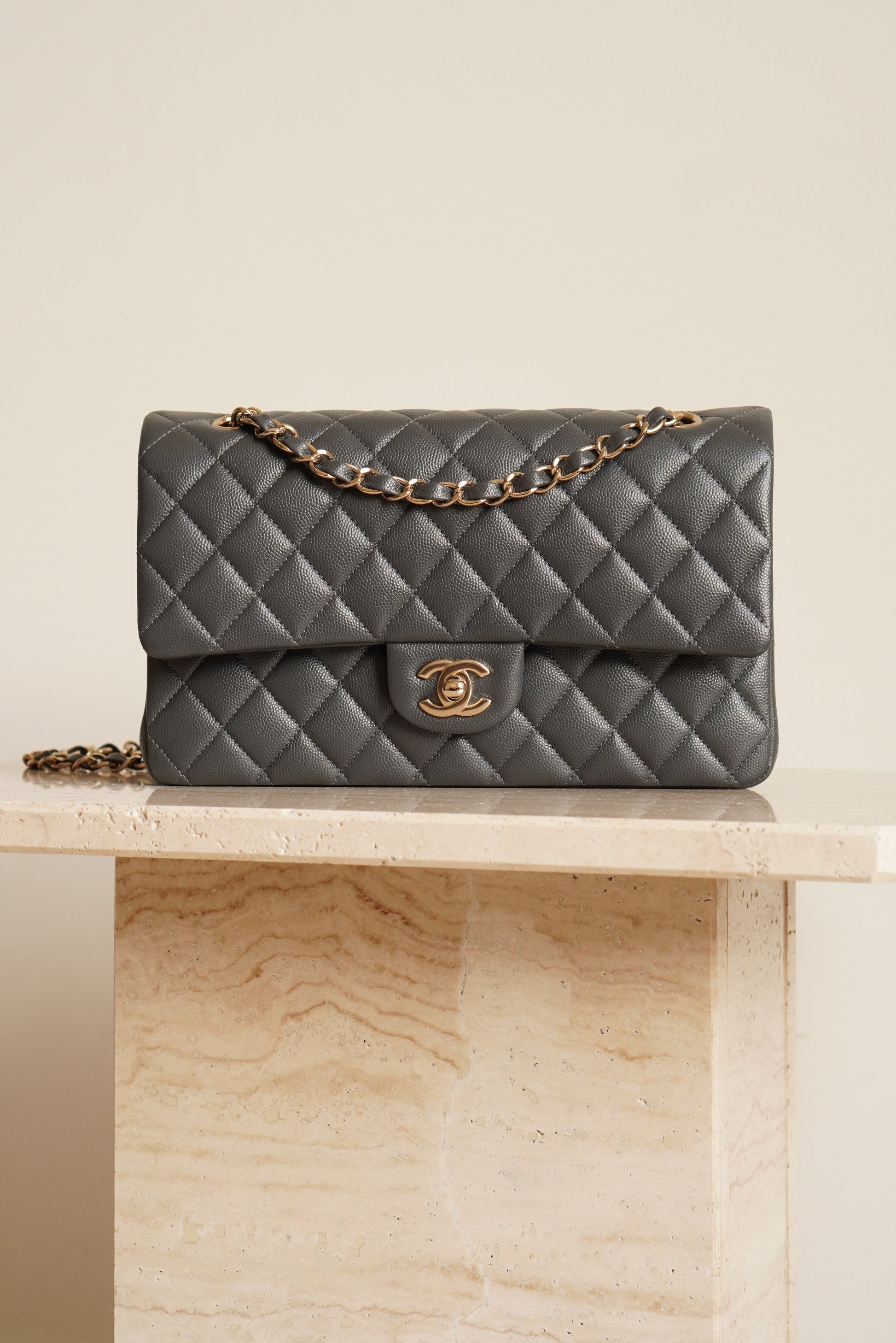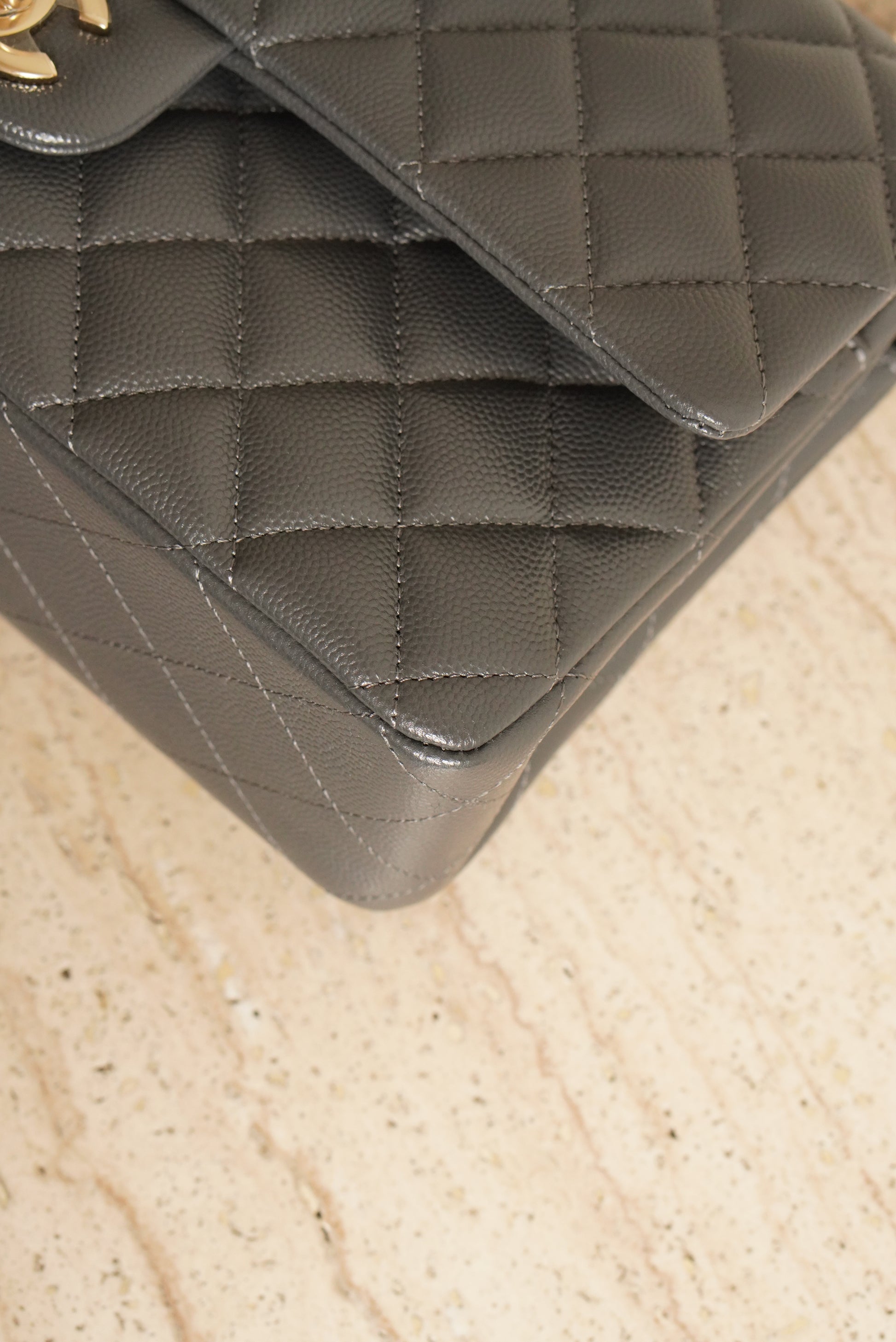 The Chanel Classic Medium double flap in dark grey caviar leather with light gold hardware is rare and a true classic. A Chanel Classic flap bag always refers to the flap bags with the CC lock and a leather-woven chain. This Chanel comes with a double flap. This means that the bag has an exterior flap closure, as well as an interior flap compartment. Other than the "main" pockets in the interior of this classic, there are a couple of extra pockets. First off, the biggest flap, that is used to close the bag, has a small inner pocket that can be closed with a zipper. Second, in between the two internal pockets, there is a space designed to hold a single lipstick. And third, on the outside of the bag there is a slip-in pocket. Inside of these Chanel Classic Medium in dark grey caviar leather you will find grey leather with a Chanel logo on the biggest flap. The Chanel Classic Medium comes with a gold-toned metal chain, that can be used to wear the bag on the shoulder. The chain is not adjustable, but can also be worn folded to make the chain shorter. It's spacious enough to hold essentials including keys, a card holder and a smartphone.