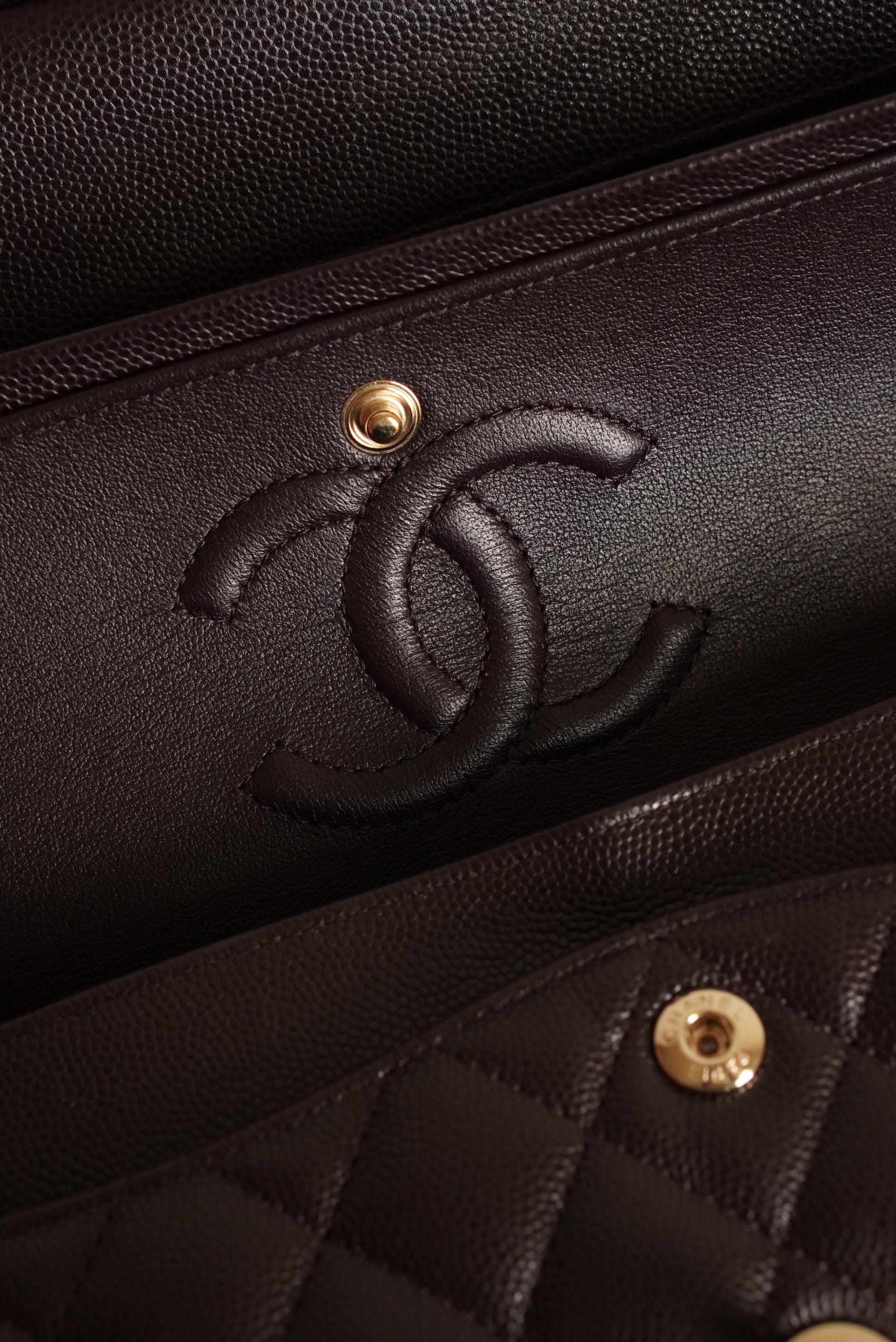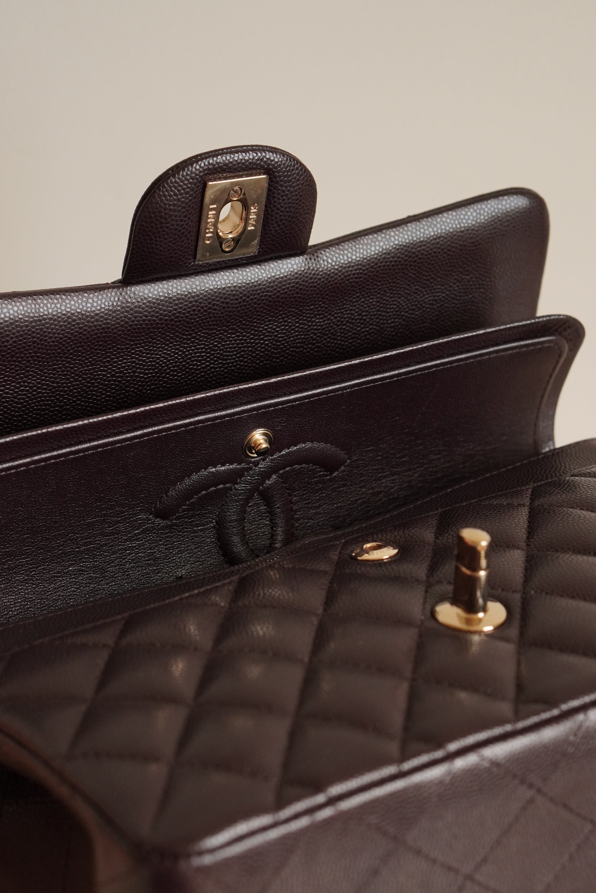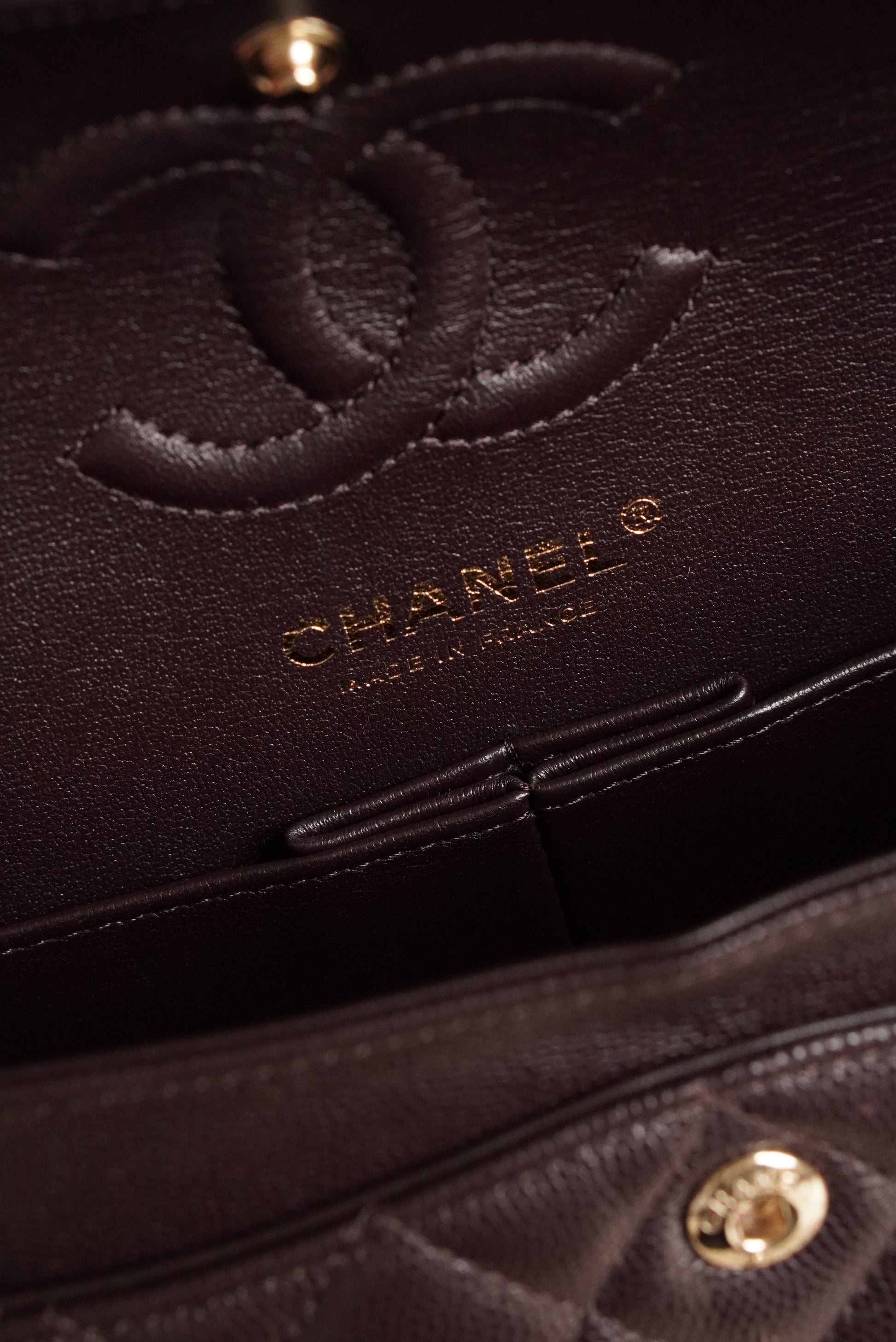 The Chanel Classic Small double flap in dark brown caviar leather with light gold hardware is rare and a true classic. A Chanel Classic flap bag always refers to the flap bags with the CC lock and a leather-woven chain. This Chanel comes with a double flap. This means that the bag has an exterior flap closure, as well as an interior flap compartment. Other than the "main" pockets in the interior of this classic, there are a couple of extra pockets. First off, the biggest flap, that is used to close the bag, has a small inner pocket that can be closed with a zipper. Second, in between the two internal pockets, there is a space designed to hold a single lipstick. And third, on the outside of the bag there is a slip-in pocket. Inside of these Chanel Classic Small in dark brown caviar leather you will find brown leather with a Chanel logo on the biggest flap. The Chanel Classic Small comes with a gold-toned metal chain, that can be used to wear the bag on the shoulder. The chain is not adjustable, but can also be worn folded to make the chain shorter. It's spacious enough to hold essentials including keys, a card holder and a smartphone.