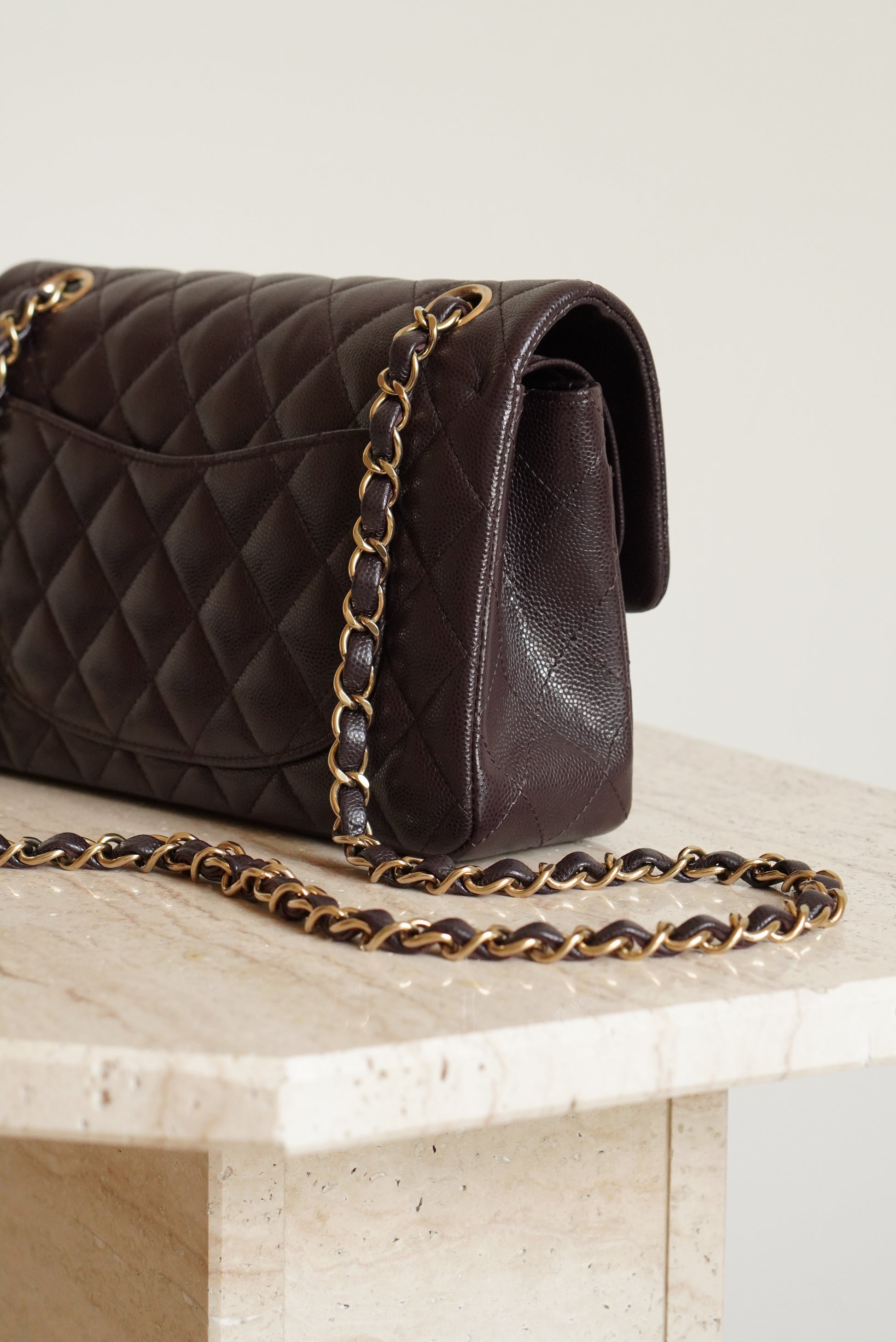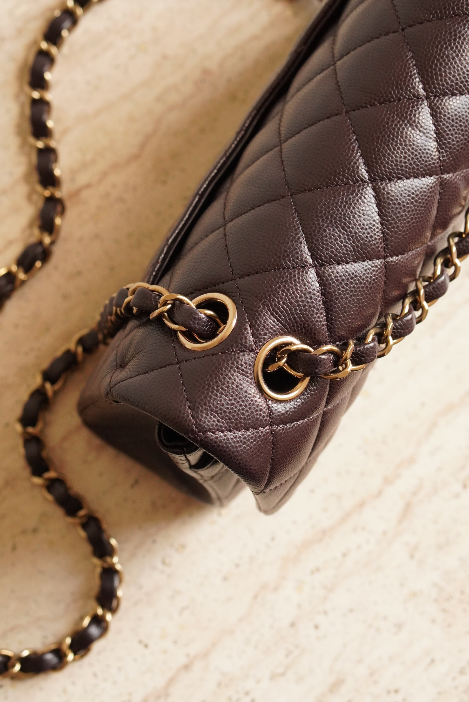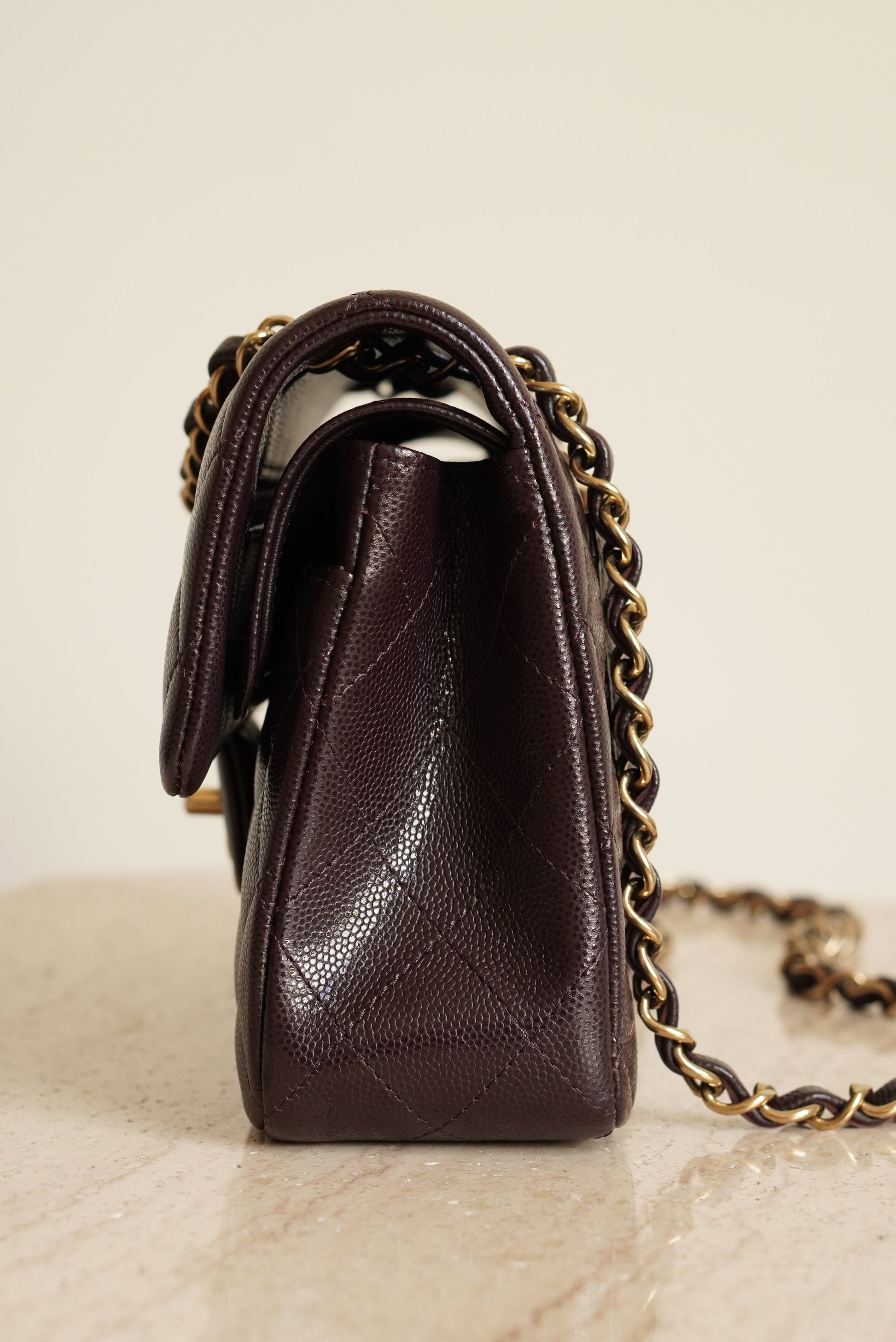 The Chanel Classic Small double flap in dark brown caviar leather with light gold hardware is rare and a true classic. A Chanel Classic flap bag always refers to the flap bags with the CC lock and a leather-woven chain. This Chanel comes with a double flap. This means that the bag has an exterior flap closure, as well as an interior flap compartment. Other than the "main" pockets in the interior of this classic, there are a couple of extra pockets. First off, the biggest flap, that is used to close the bag, has a small inner pocket that can be closed with a zipper. Second, in between the two internal pockets, there is a space designed to hold a single lipstick. And third, on the outside of the bag there is a slip-in pocket. Inside of these Chanel Classic Small in dark brown caviar leather you will find brown leather with a Chanel logo on the biggest flap. The Chanel Classic Small comes with a gold-toned metal chain, that can be used to wear the bag on the shoulder. The chain is not adjustable, but can also be worn folded to make the chain shorter. It's spacious enough to hold essentials including keys, a card holder and a smartphone.