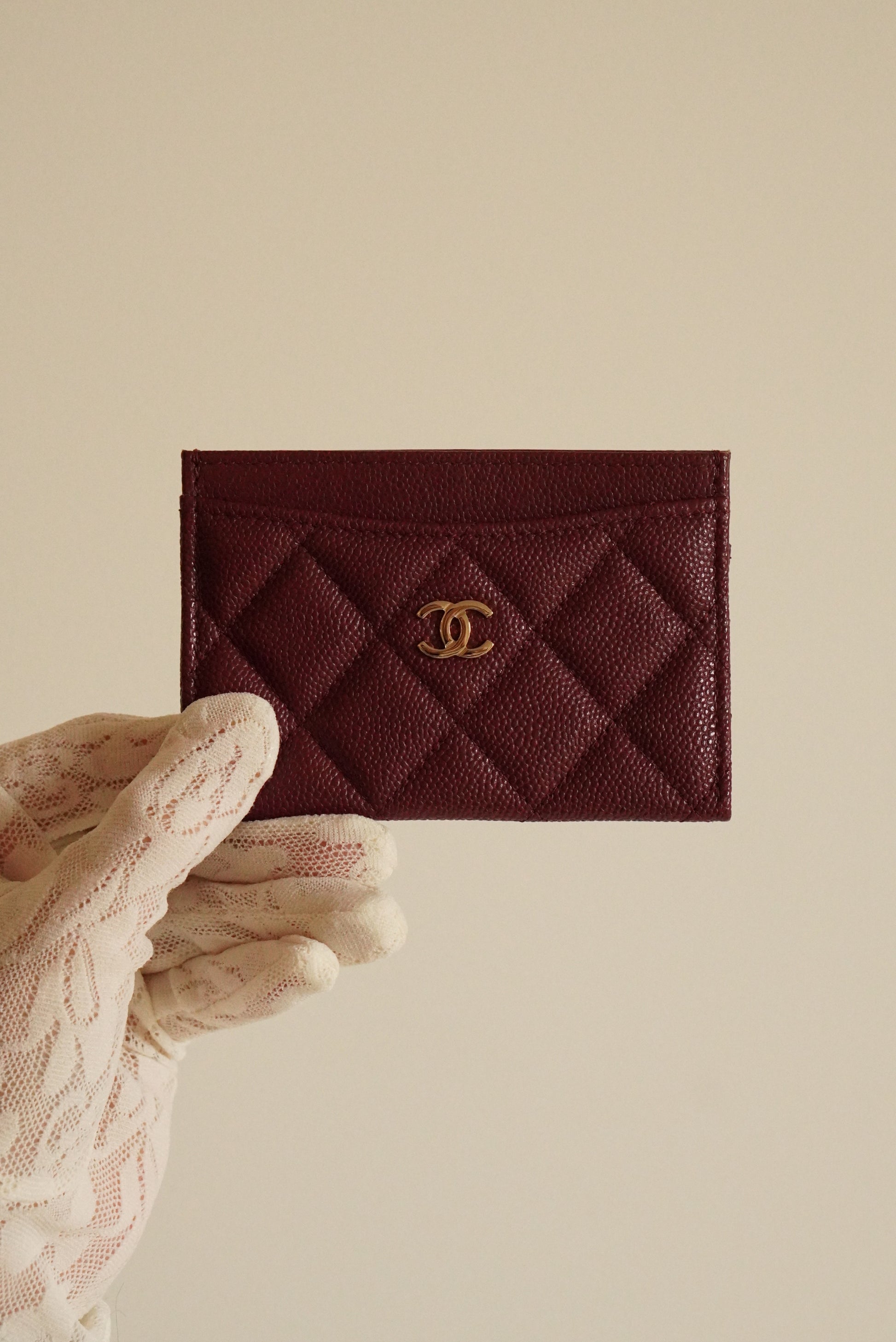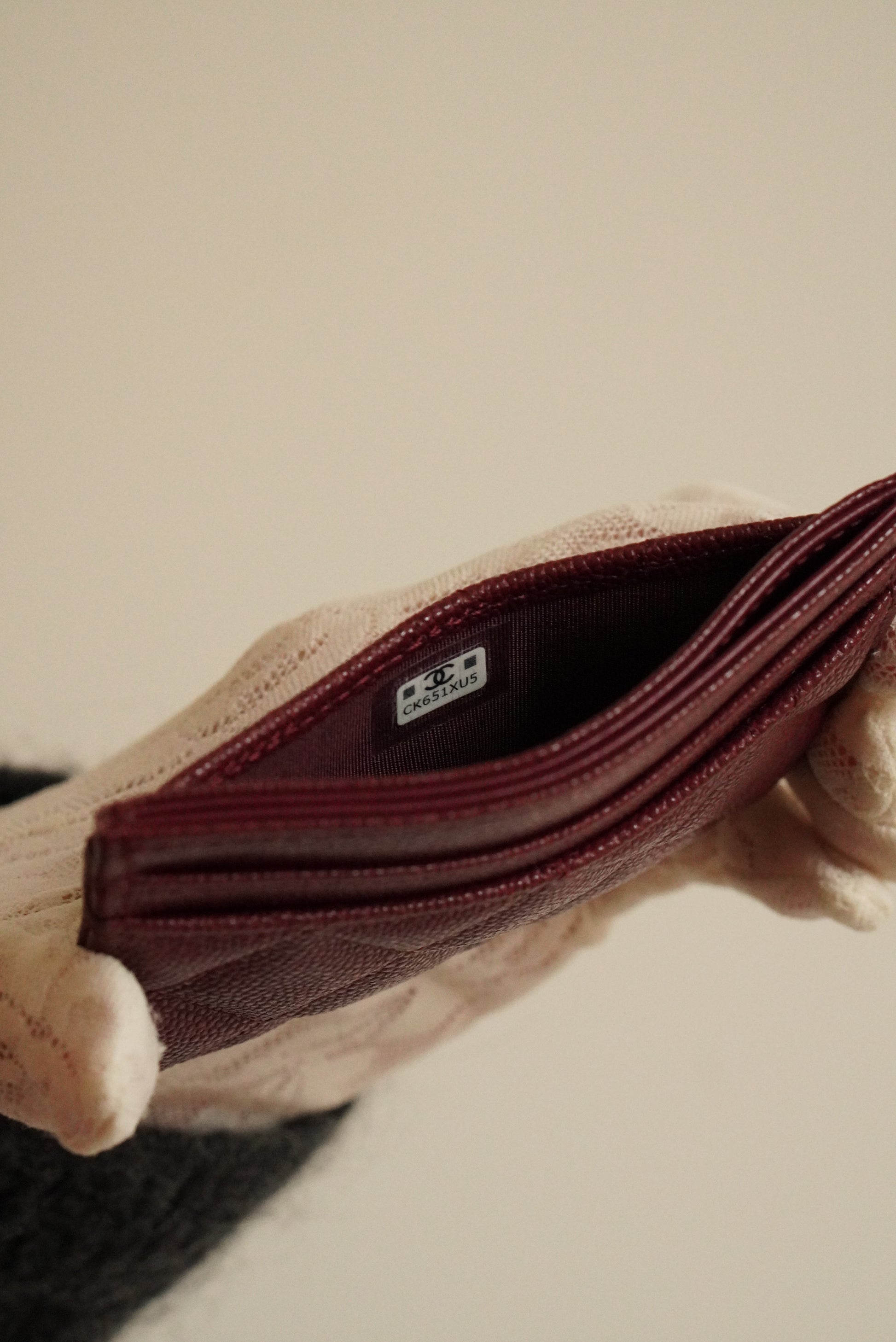 This Chanel Classic Card Holder in burgundy caviar leather is small but very practical. It emanates quality and sophistication, just like the Classic handbags. The card holder can help organize your bankcards, credit cards and/or business cards. It has 4 card slots and is crafted from burgundy caviar leather with gold hardware.
