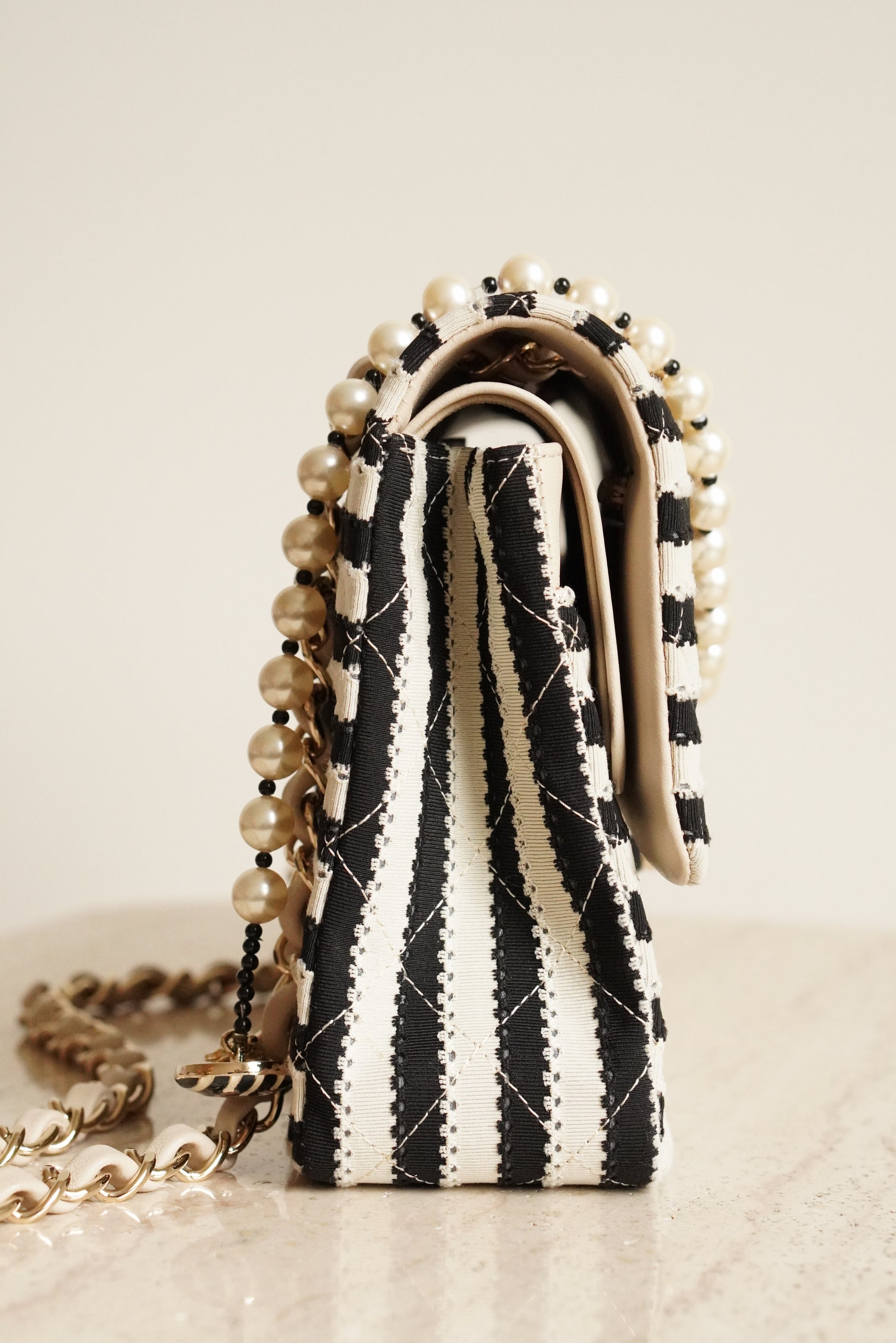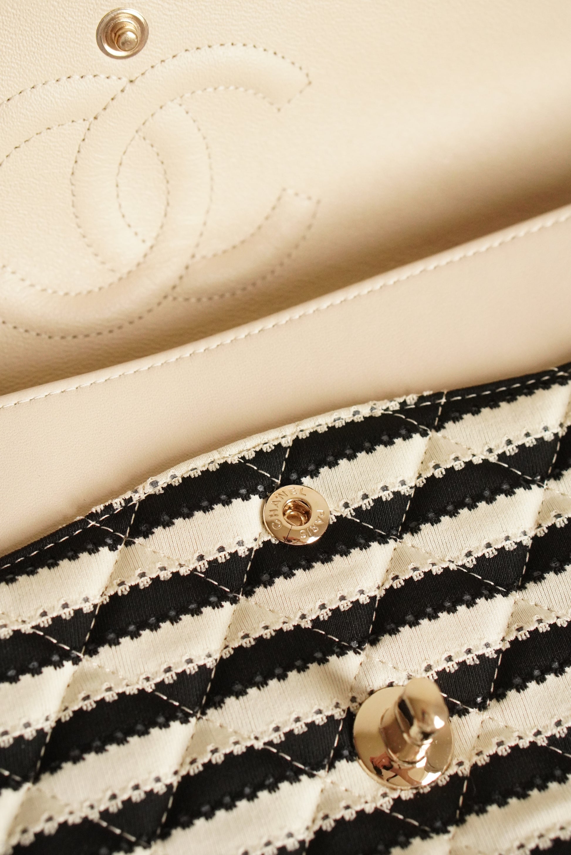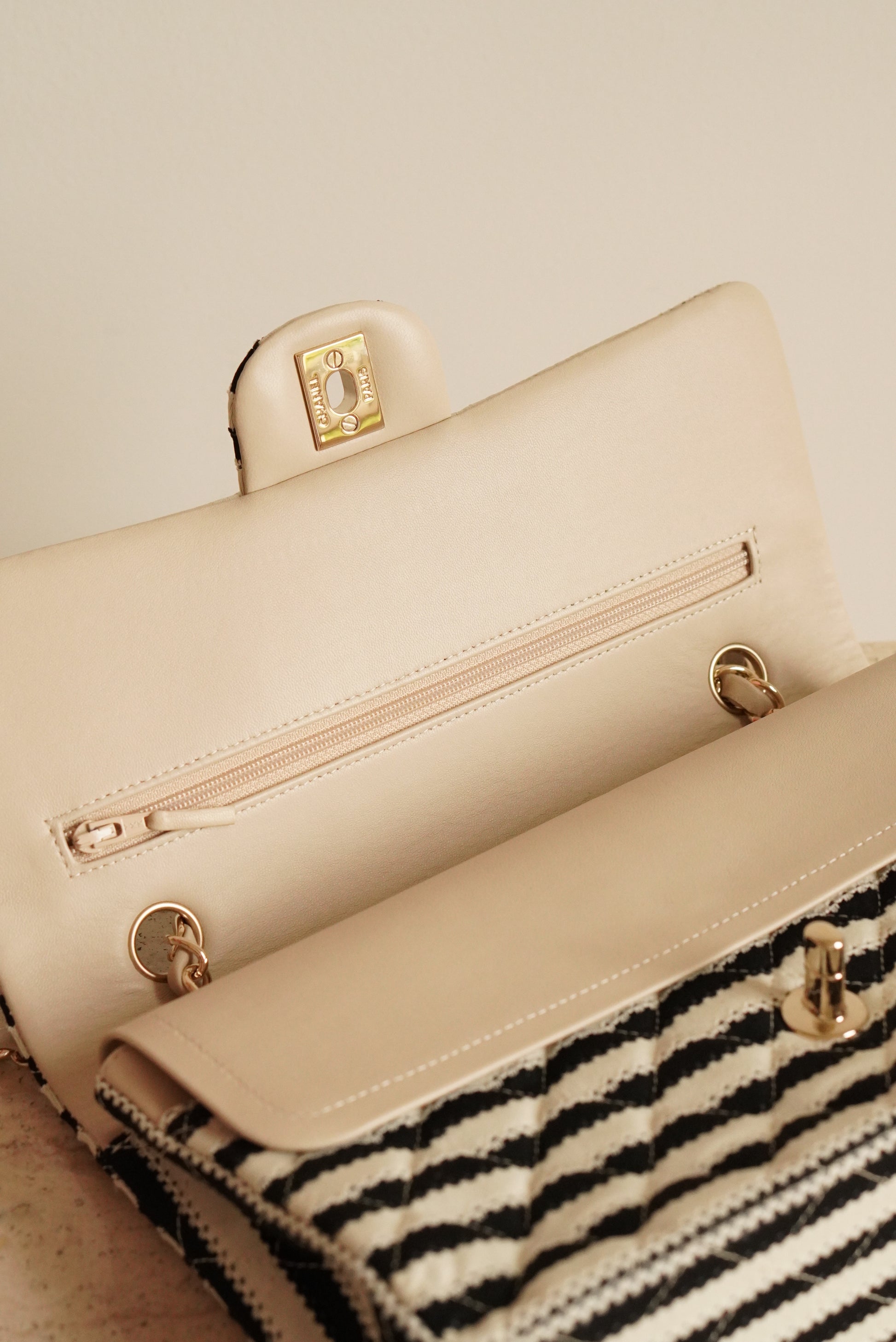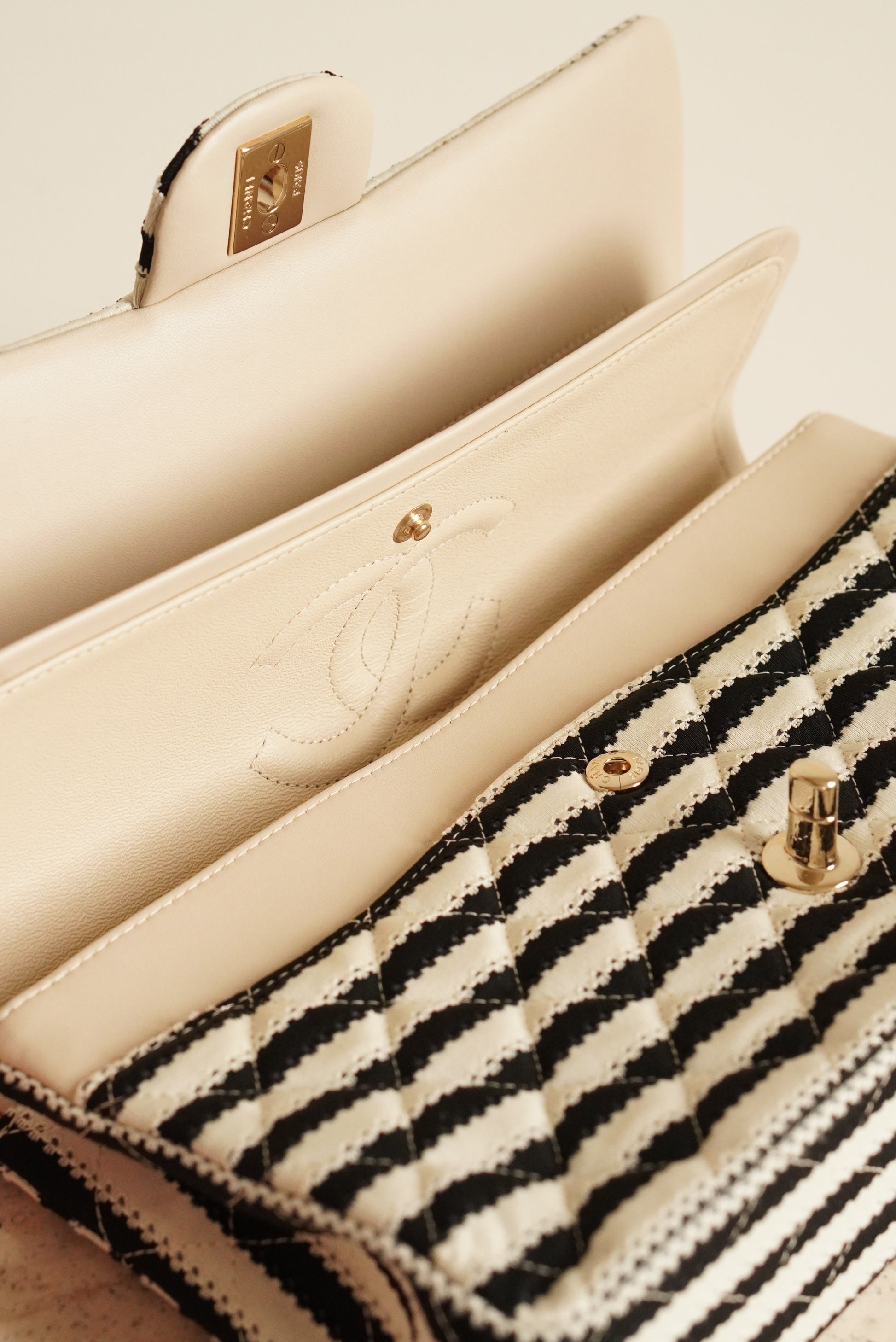 The Chanel Classic Medium in striped black and ivory jersey with gold hardware is rare and a true classic from the 2014 collection. A Chanel Classic flap bag always refers to the flap bags with the CC lock and a leather-woven chain. This Chanel comes with a double flap. This means that the bag has an exterior flap closure as well as an interior flap compartment. Other than the main pockets in the interior of this classic, there are a couple of extra pockets. First, the biggest flap that is used to close the bag has a small inner pocket that can be closed with a zipper. Second, in between the two internal pockets, there is a space designed to hold a single lipstick. Third, on the outside of the bag, there is a slip-in pocket. Inside this Chanel Classic Medium in striped black and ivory jersey, you will find beige leather with a Chanel logo on the biggest flap. The Chanel Classic Medium comes with a gold metal chain that can be used to wear the bag on the shoulder. The chain is not adjustable but can also be worn folded to make the chain shorter. Additionally, it includes a removable pearl strand strap with faux pearls and CC logo buttons, offering versatility in styling. It is spacious enough to hold essentials including keys, a cardholder, and a smartphone.