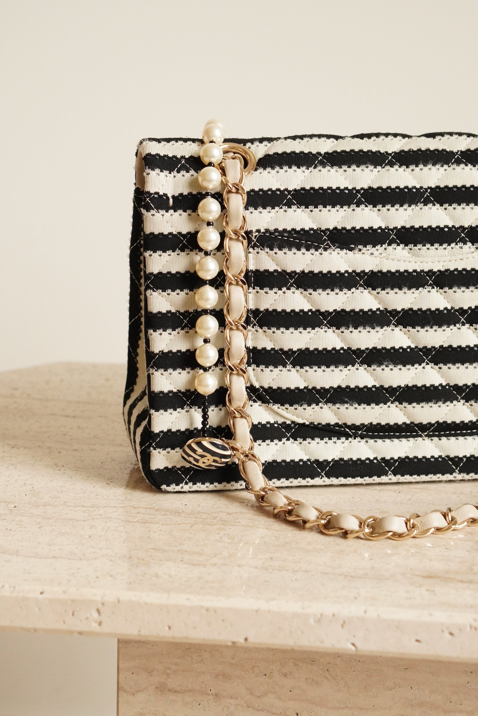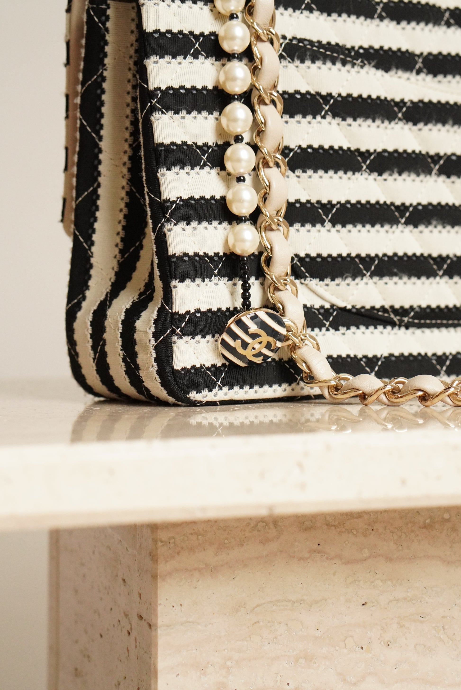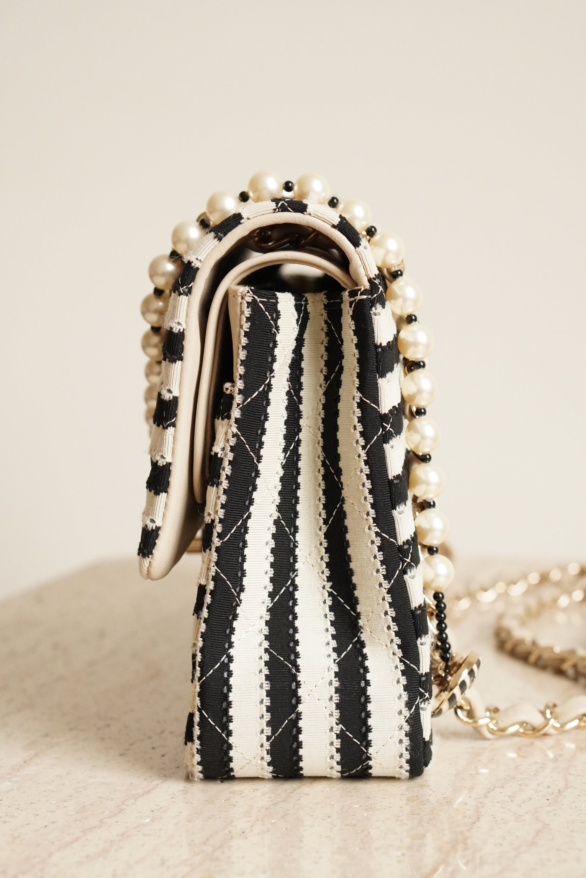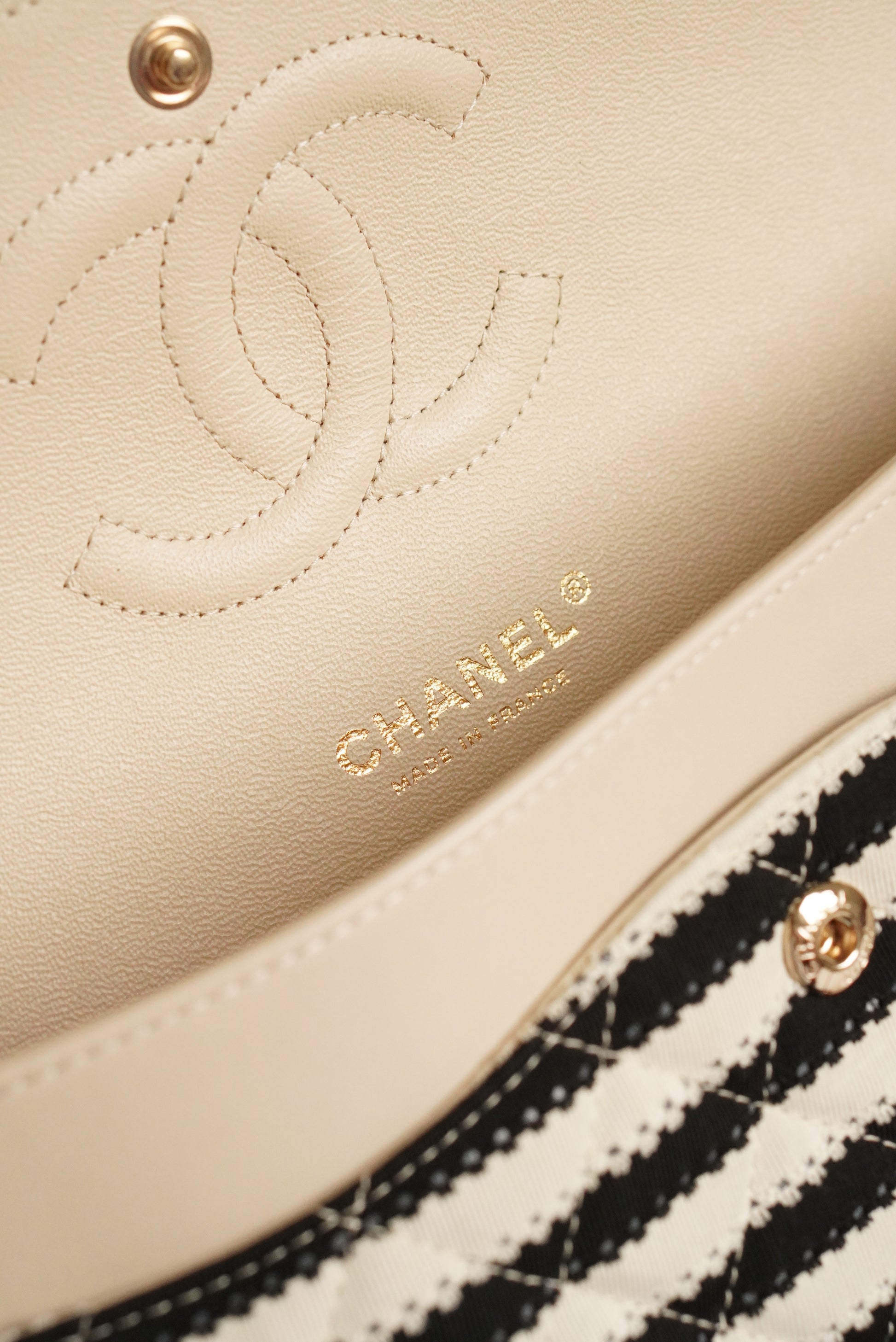 The Chanel Classic Medium in striped black and ivory jersey with gold hardware is rare and a true classic from the 2014 collection. A Chanel Classic flap bag always refers to the flap bags with the CC lock and a leather-woven chain. This Chanel comes with a double flap. This means that the bag has an exterior flap closure as well as an interior flap compartment. Other than the main pockets in the interior of this classic, there are a couple of extra pockets. First, the biggest flap that is used to close the bag has a small inner pocket that can be closed with a zipper. Second, in between the two internal pockets, there is a space designed to hold a single lipstick. Third, on the outside of the bag, there is a slip-in pocket. Inside this Chanel Classic Medium in striped black and ivory jersey, you will find beige leather with a Chanel logo on the biggest flap. The Chanel Classic Medium comes with a gold metal chain that can be used to wear the bag on the shoulder. The chain is not adjustable but can also be worn folded to make the chain shorter. Additionally, it includes a removable pearl strand strap with faux pearls and CC logo buttons, offering versatility in styling. It is spacious enough to hold essentials including keys, a cardholder, and a smartphone.