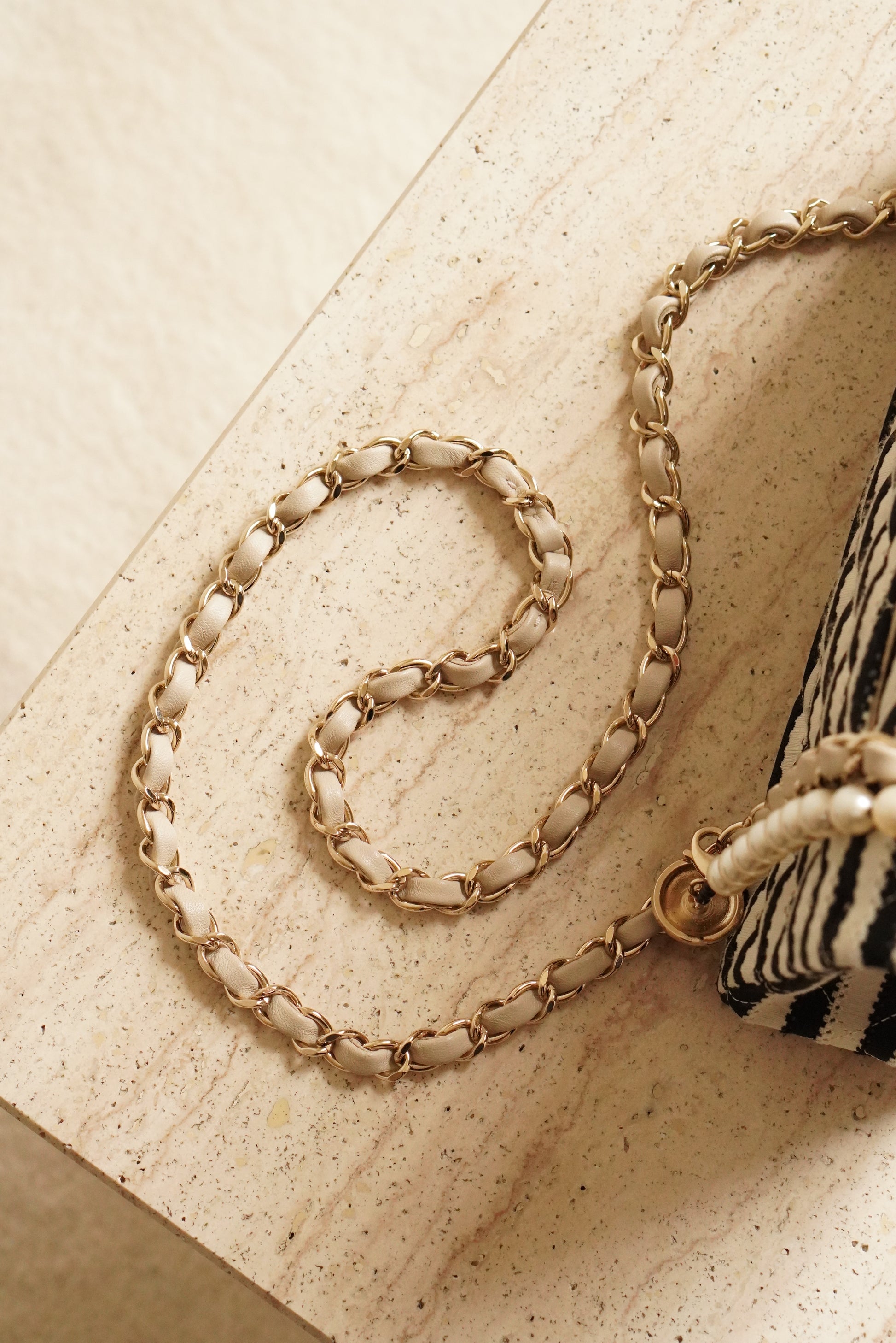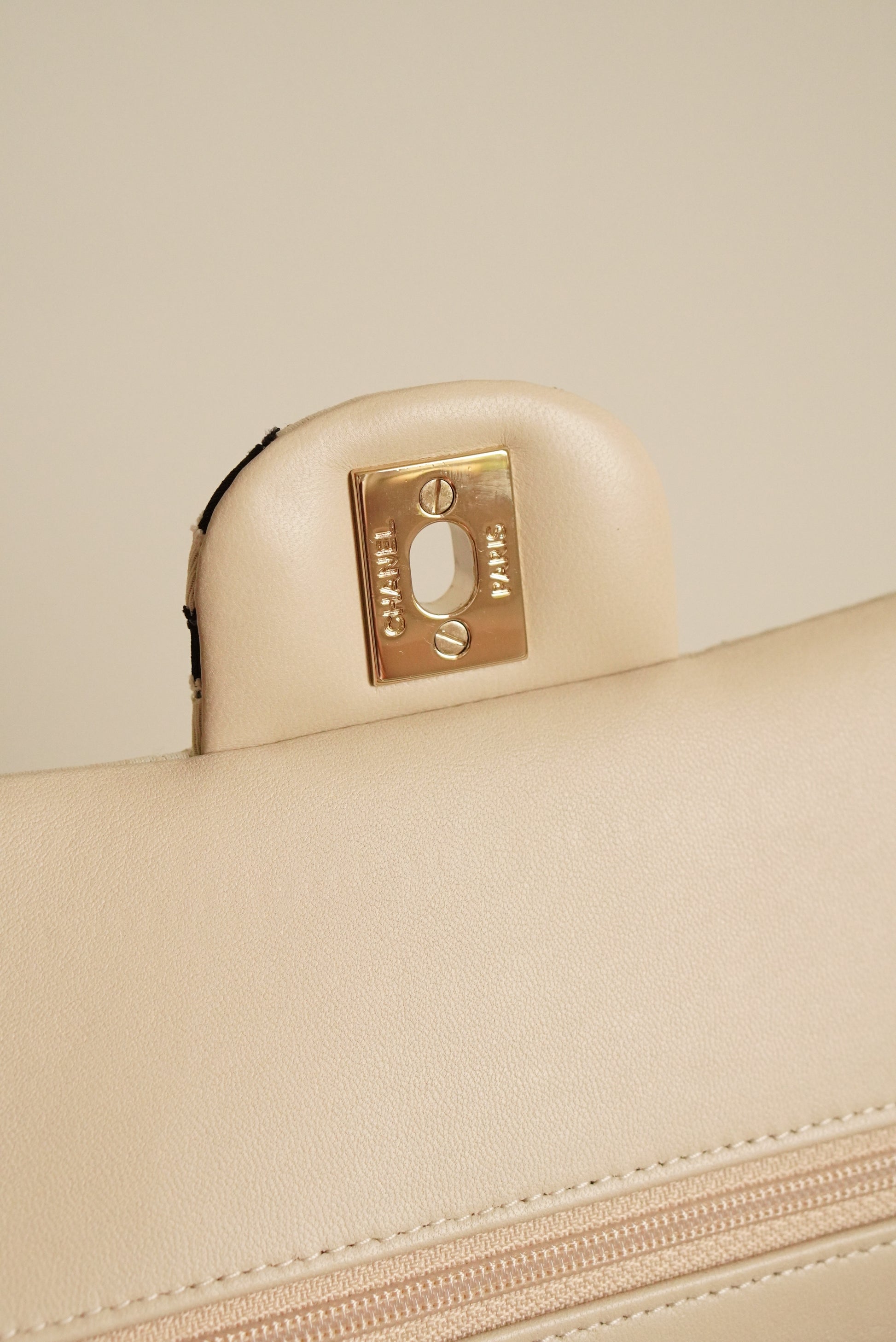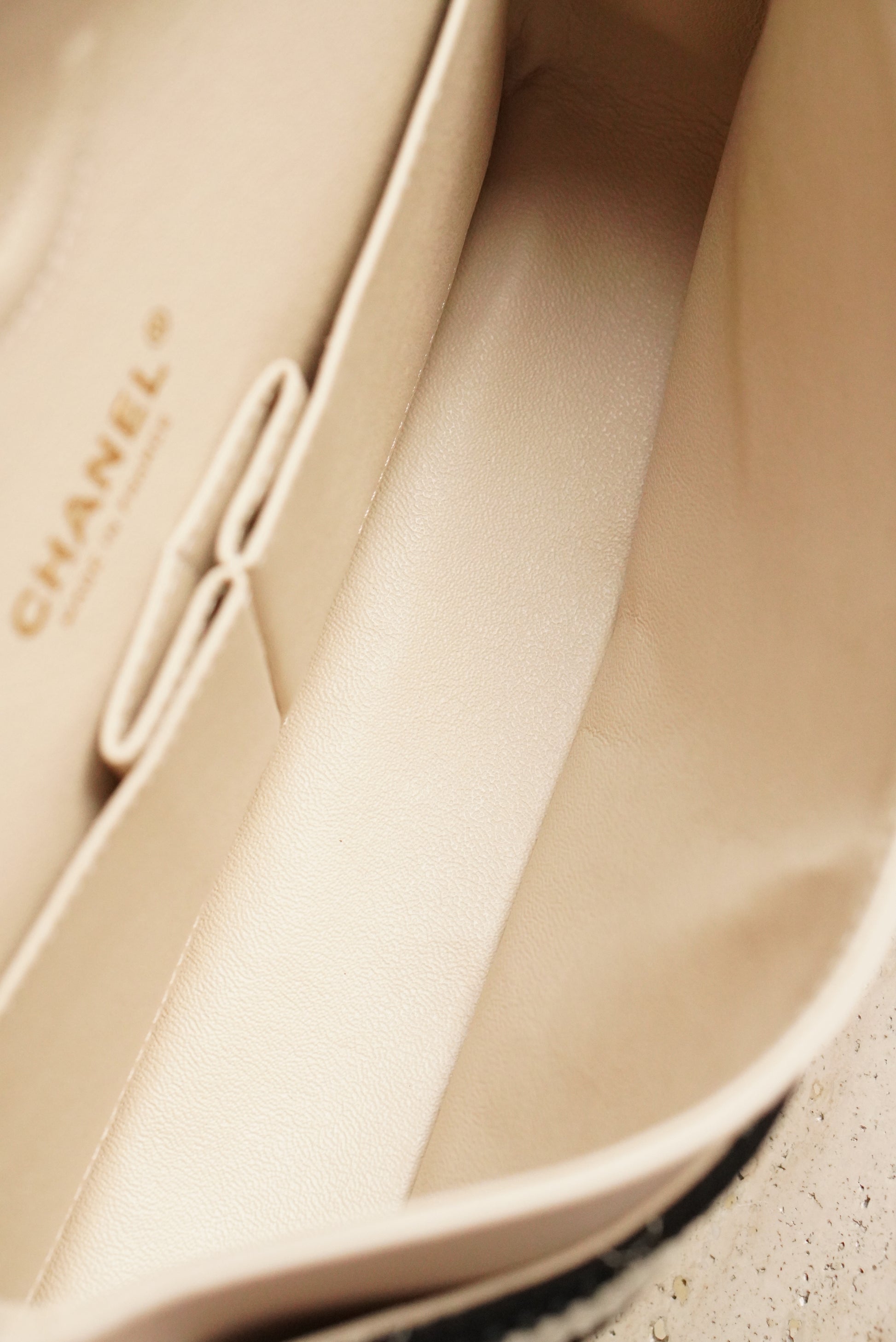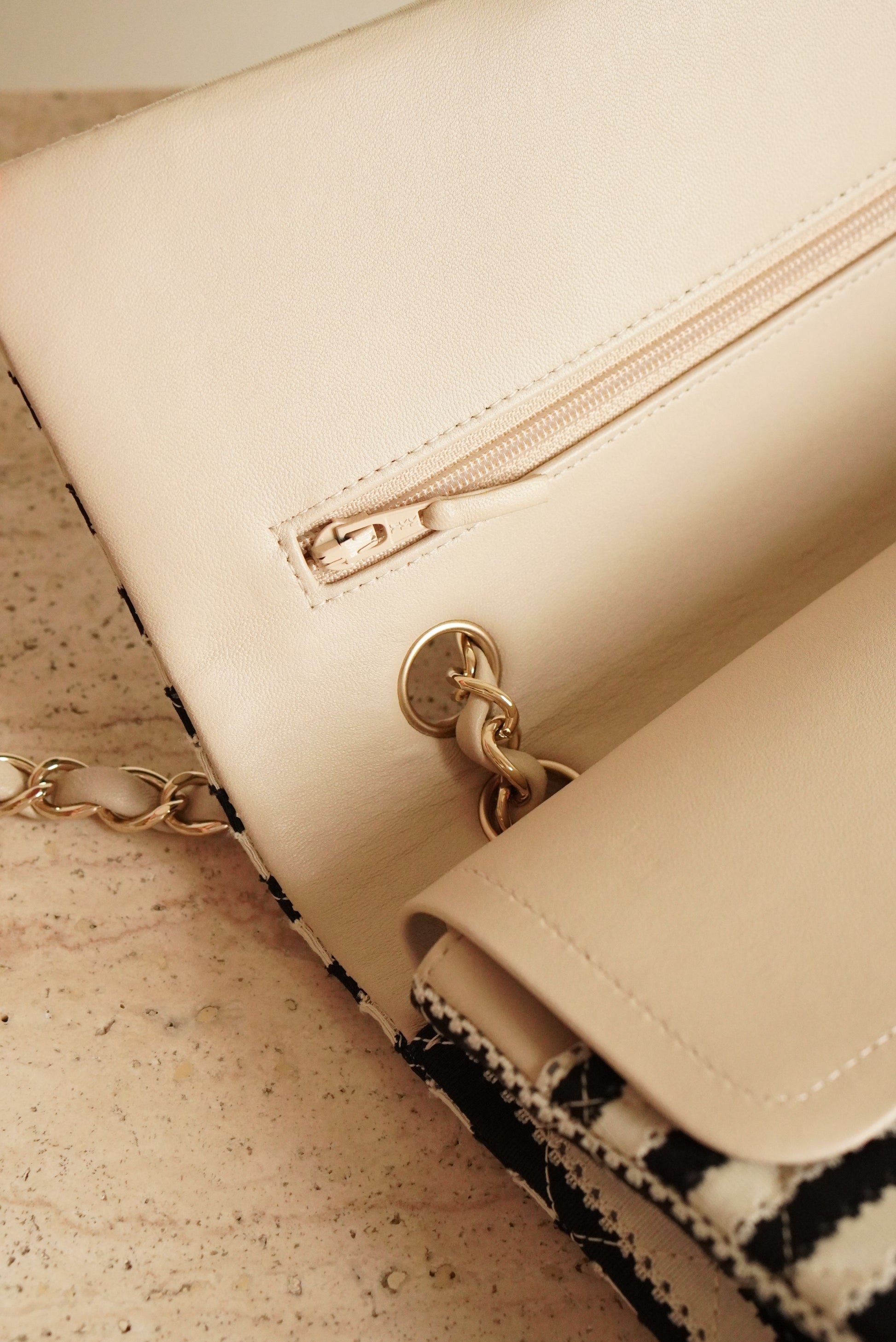 The Chanel Classic Medium in striped black and ivory jersey with gold hardware is rare and a true classic from the 2014 collection. A Chanel Classic flap bag always refers to the flap bags with the CC lock and a leather-woven chain. This Chanel comes with a double flap. This means that the bag has an exterior flap closure as well as an interior flap compartment. Other than the main pockets in the interior of this classic, there are a couple of extra pockets. First, the biggest flap that is used to close the bag has a small inner pocket that can be closed with a zipper. Second, in between the two internal pockets, there is a space designed to hold a single lipstick. Third, on the outside of the bag, there is a slip-in pocket. Inside this Chanel Classic Medium in striped black and ivory jersey, you will find beige leather with a Chanel logo on the biggest flap. The Chanel Classic Medium comes with a gold metal chain that can be used to wear the bag on the shoulder. The chain is not adjustable but can also be worn folded to make the chain shorter. Additionally, it includes a removable pearl strand strap with faux pearls and CC logo buttons, offering versatility in styling. It is spacious enough to hold essentials including keys, a cardholder, and a smartphone.
