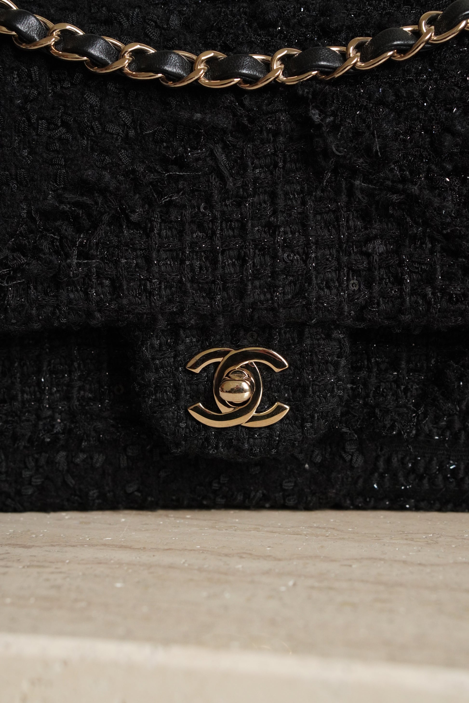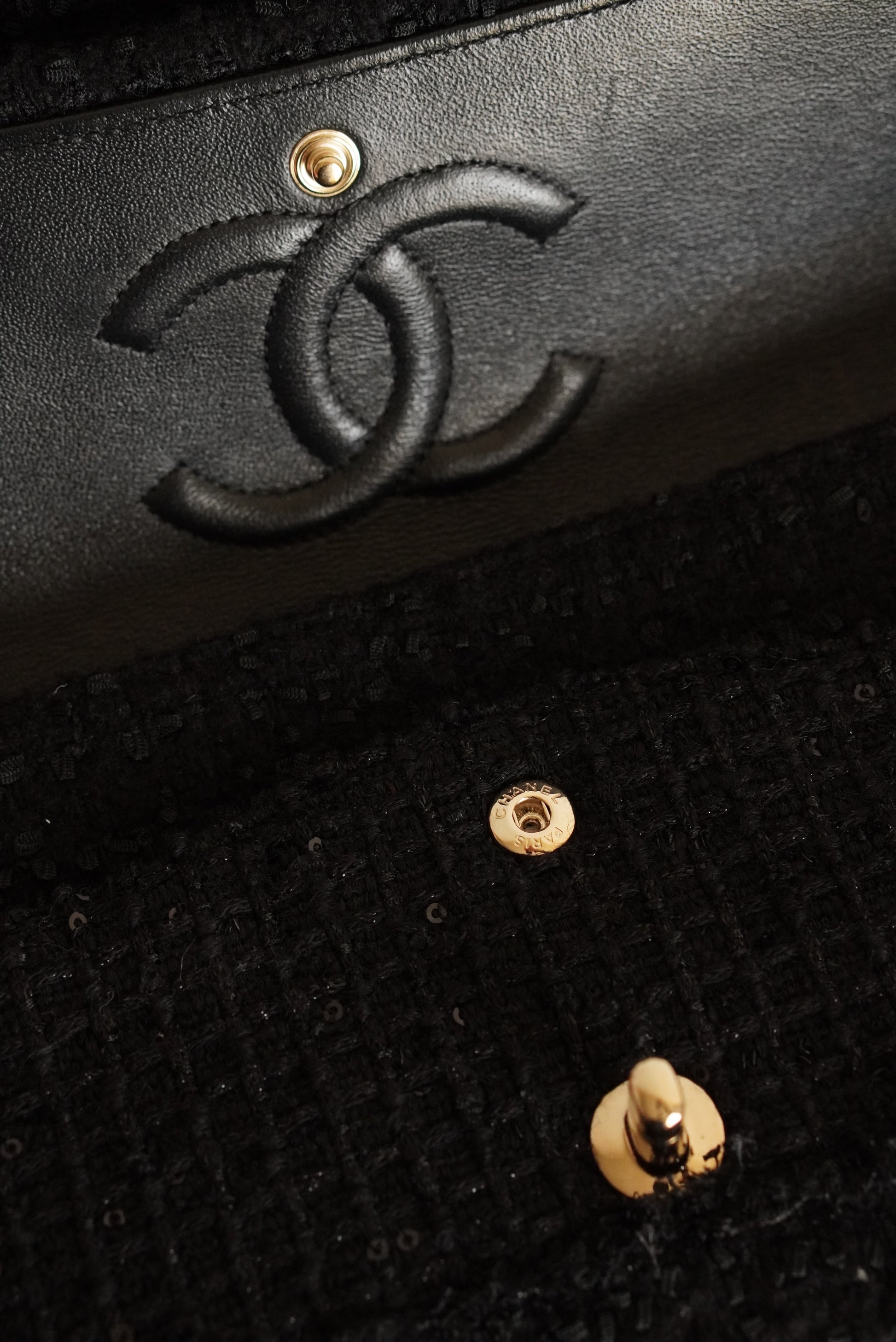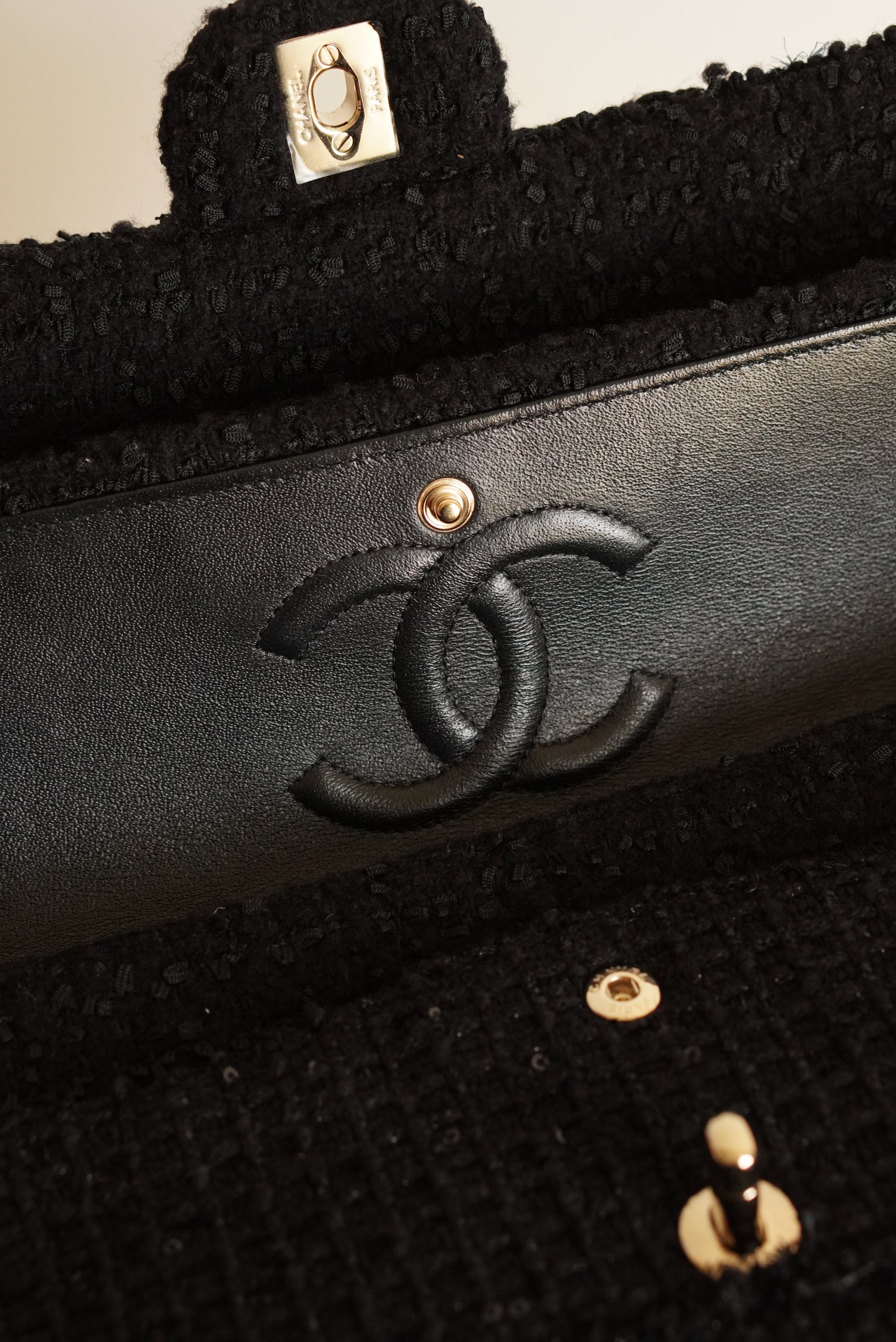 The Chanel Classic Medium double flap in black Tweed Patchwork with light gold hardware is rare and a true classic. A Chanel Classic flap bag always refers to the flap bags with the CC lock and a leather-woven chain. This Chanel comes with a double flap. This means that the bag has an exterior flap closure, as well as an interior flap compartment. Other than the "main" pockets in the interior of this classic, there are a couple of extra pockets. First off, the biggest flap, that is used to close the bag, has a small inner pocket that can be closed with a zipper. Second, in between the two internal pockets, there is a space designed to hold a single lipstick. And third, on the outside of the bag there is a slip-in pocket. Inside of these Chanel Classic Medium in black Tweed Patchwork with beads and sequins, you will find black leather with a Chanel logo on the biggest flap. The Chanel Classic Medium comes with a gold-toned metal chain, that can be used to wear the bag on the shoulder. The chain is not adjustable, but can also be worn folded to make the chain shorter. It's spacious enough to hold essentials including keys, a card holder and a smartphone.