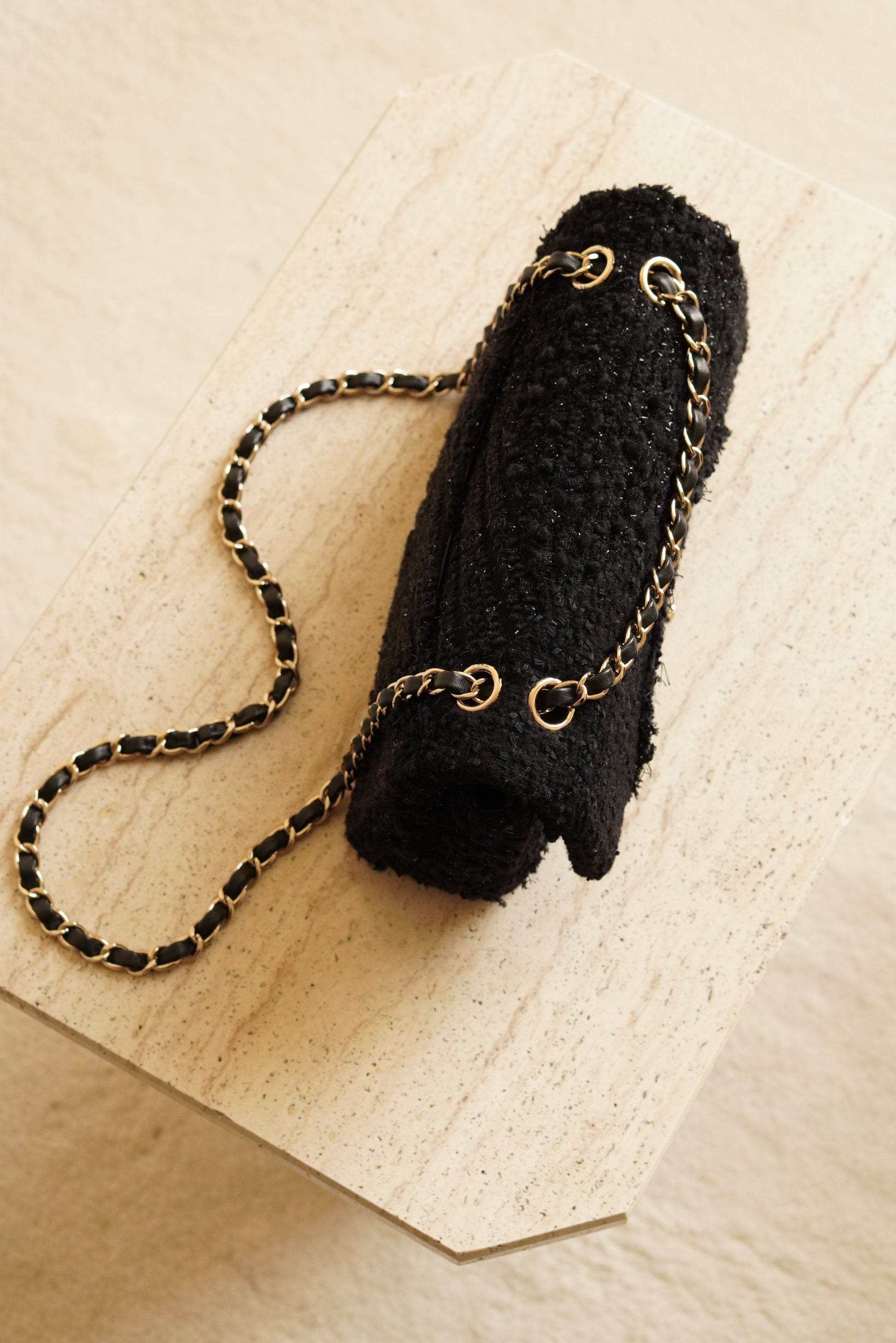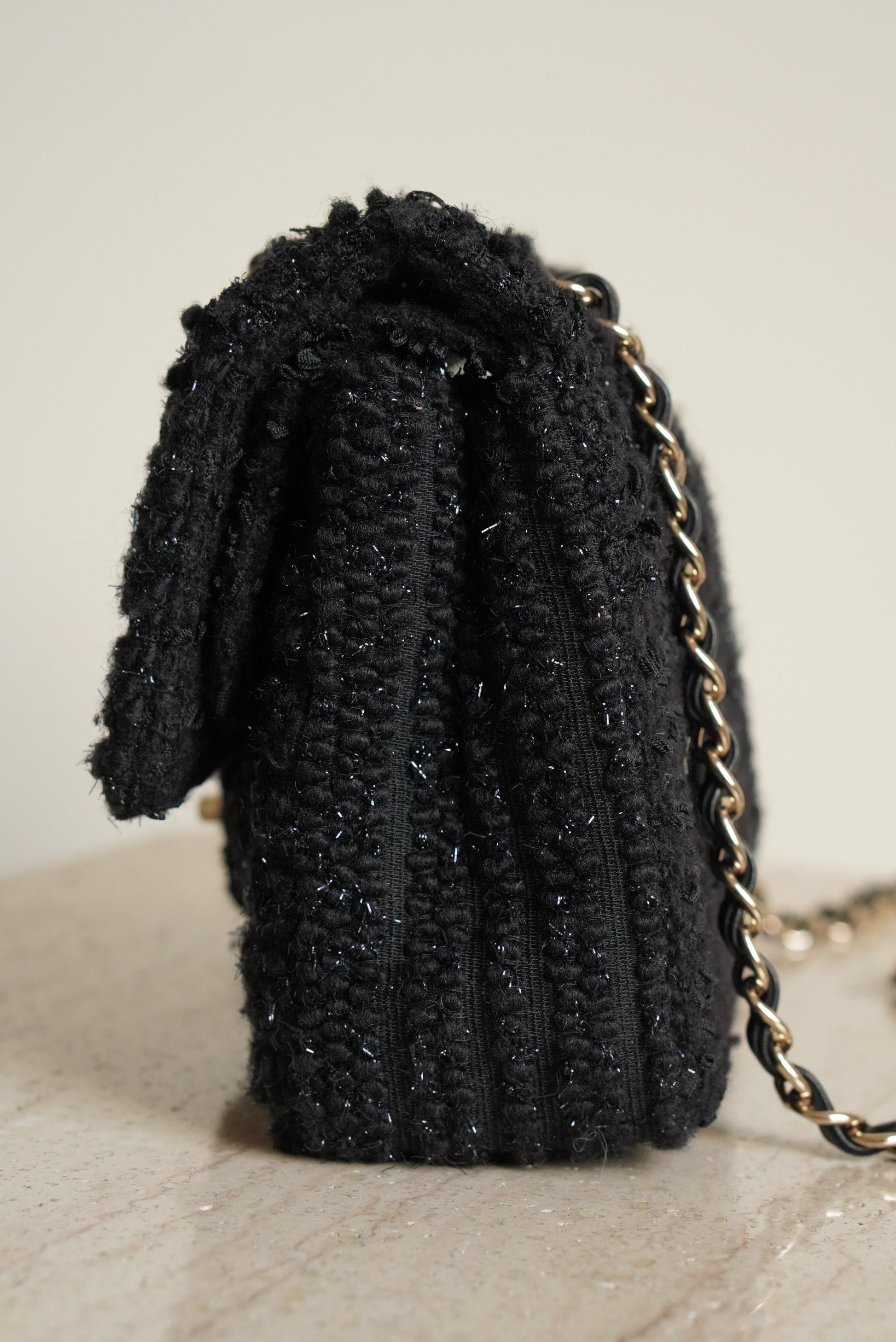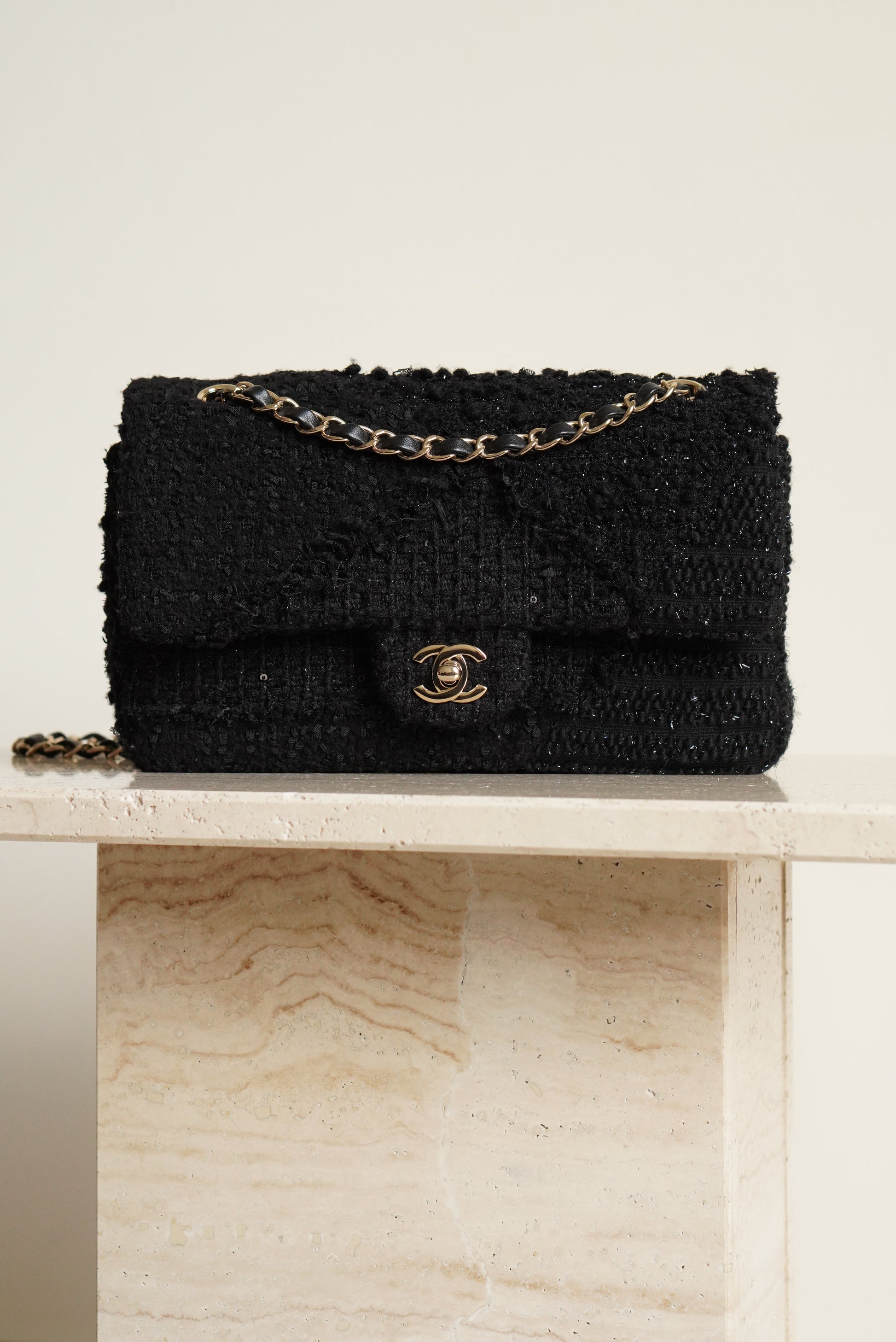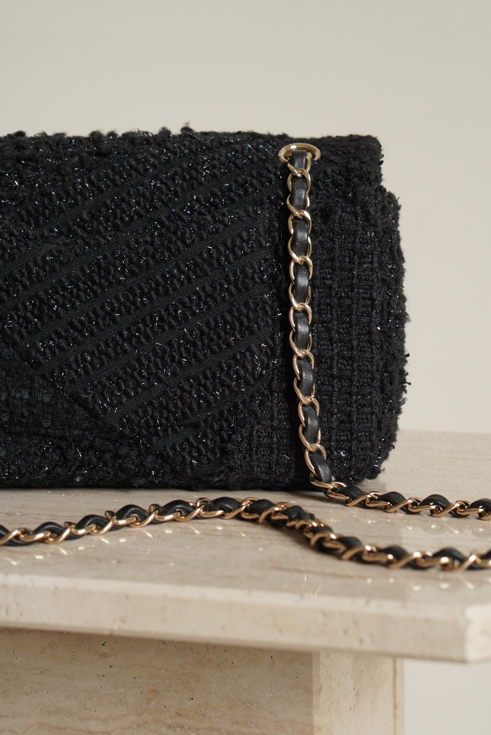 The Chanel Classic Medium double flap in black Tweed Patchwork with light gold hardware is rare and a true classic. A Chanel Classic flap bag always refers to the flap bags with the CC lock and a leather-woven chain. This Chanel comes with a double flap. This means that the bag has an exterior flap closure, as well as an interior flap compartment. Other than the "main" pockets in the interior of this classic, there are a couple of extra pockets. First off, the biggest flap, that is used to close the bag, has a small inner pocket that can be closed with a zipper. Second, in between the two internal pockets, there is a space designed to hold a single lipstick. And third, on the outside of the bag there is a slip-in pocket. Inside of these Chanel Classic Medium in black Tweed Patchwork with beads and sequins, you will find black leather with a Chanel logo on the biggest flap. The Chanel Classic Medium comes with a gold-toned metal chain, that can be used to wear the bag on the shoulder. The chain is not adjustable, but can also be worn folded to make the chain shorter. It's spacious enough to hold essentials including keys, a card holder and a smartphone.