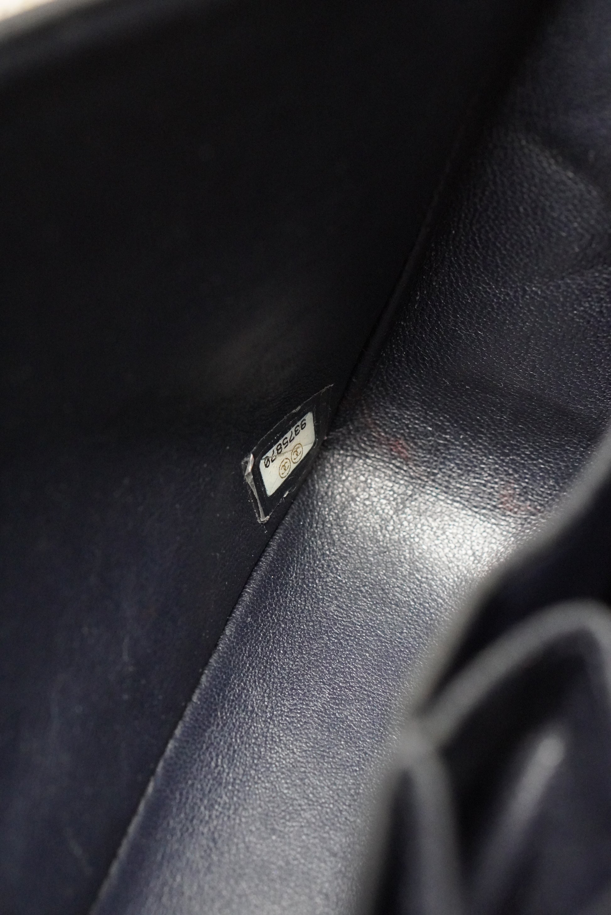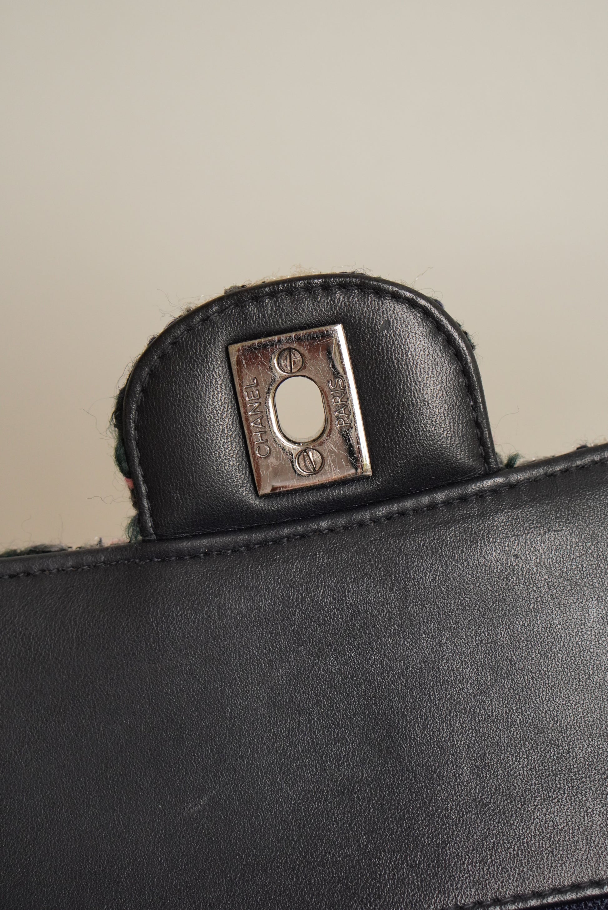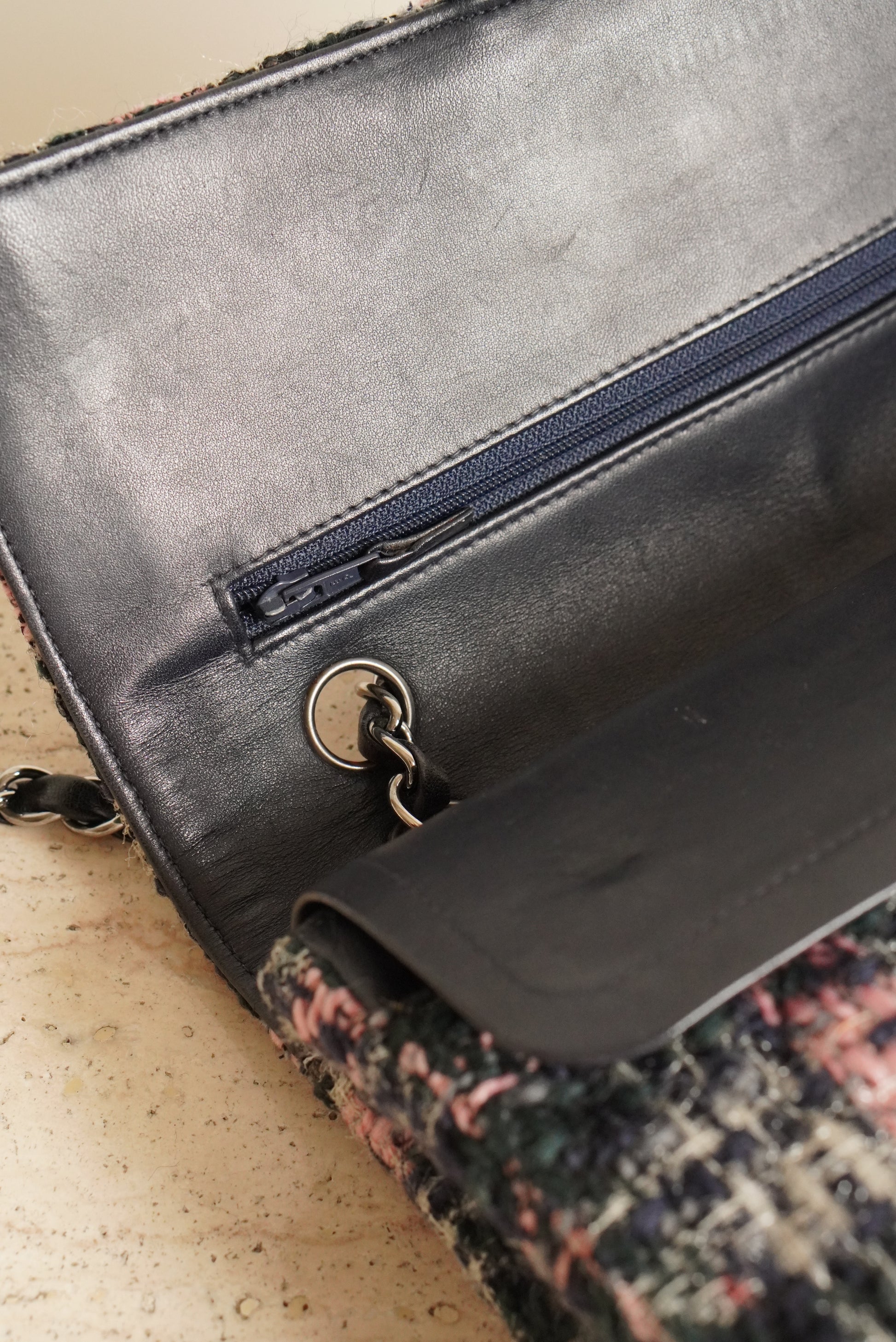 The Chanel Classic Medium in tweed with silver hardware is rare and a true classic. A Chanel Classic flap bag always refers to the flap bags with the CC lock and a leather-woven chain. This Chanel comes with a double flap. This means that the bag has an exterior flap closure, as well as an interior flap compartment. Other than the "main" pockets in the interior of this classic, there are a couple of extra pockets. First off, the biggest flap, that is used to close the bag, has a small inner pocket that can be closed with a zipper. Second, in between the two internal pockets, there is a space designed to hold a single lipstick. And third, on the outside of the bag there is a slip-in pocket. Inside of these Chanel Classic Medium in tweed you will find navy leather with an embossed Chanel logo on the biggest flap. The Chanel Classic Medium comes with a silver chain, that can be used to wear the bag on the shoulder. The chain is not adjustable, but can also be worn folded to make the chain shorter. It's spacious enough to hold essentials including keys, a card holder and a smartphone.