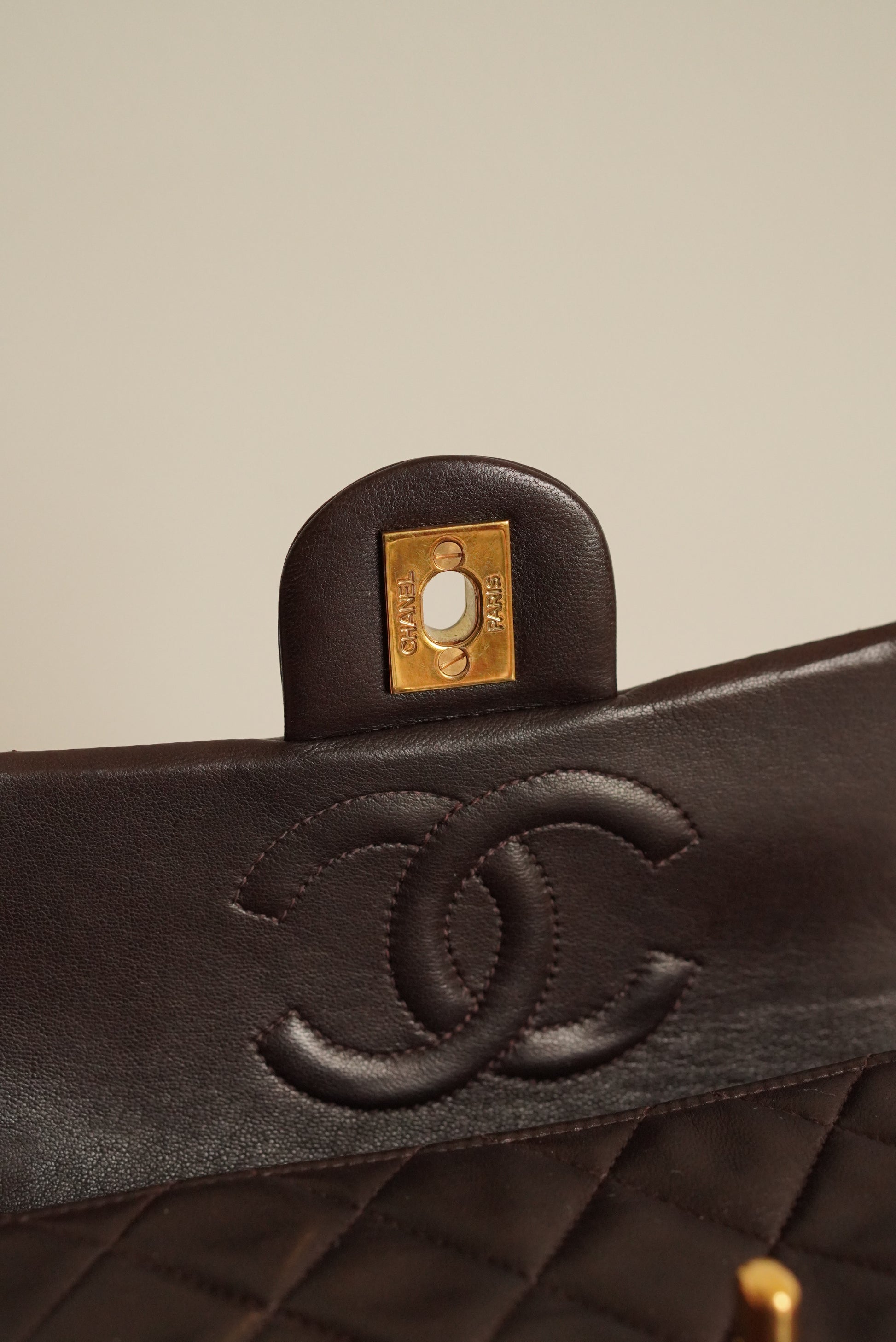 The Chanel Classic Mini Square in dark brown lambskin leather with 24k gold-plated hardware is a timeless, rare and discontinued piece, loved for its iconic design and exceptional quality. Crafted from lambskin leather, it features the signature CC turn-lock, a leather-woven chain strap (non-adjustable) and 24k gold-plated hardware. Inside, the dark brown leather lining includes a main compartment, a zippered pocket and a slip-in pocket. The back of the bag also has a practical slip pocket. Though compact, it fits daily essentials like keys, a cardholder and a smartphone.