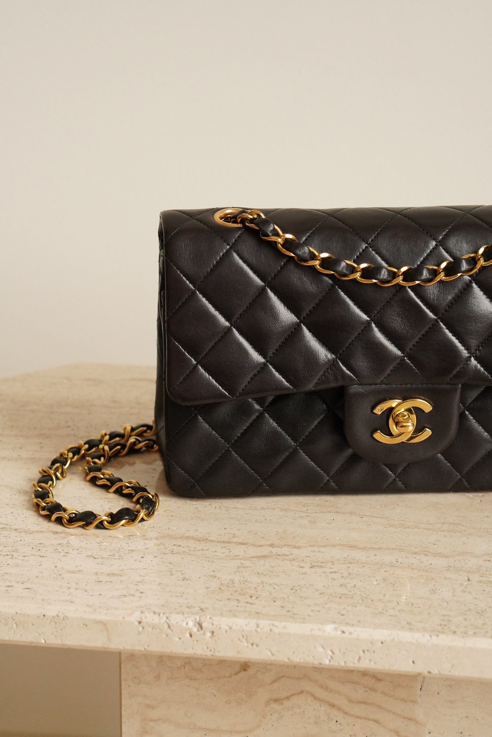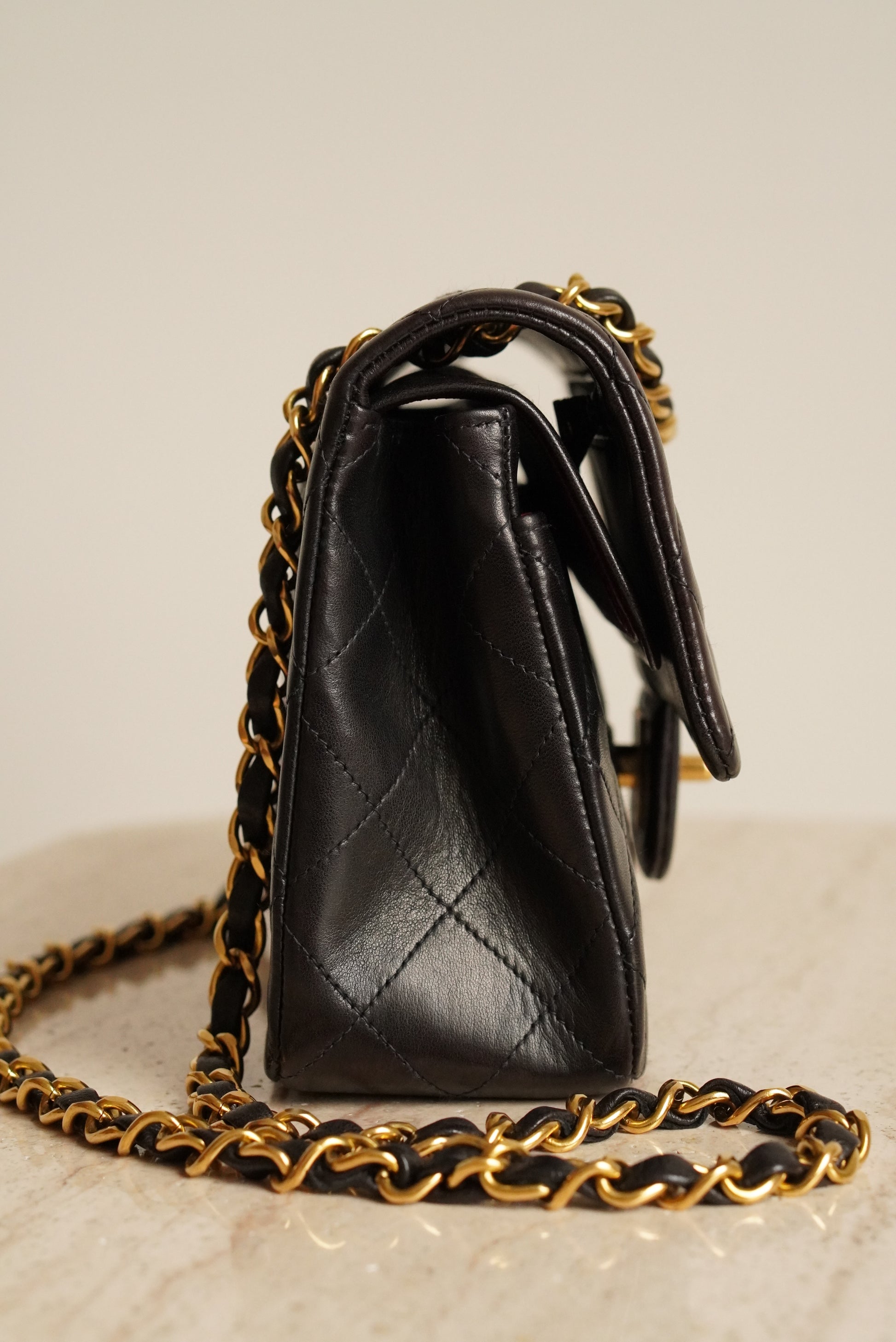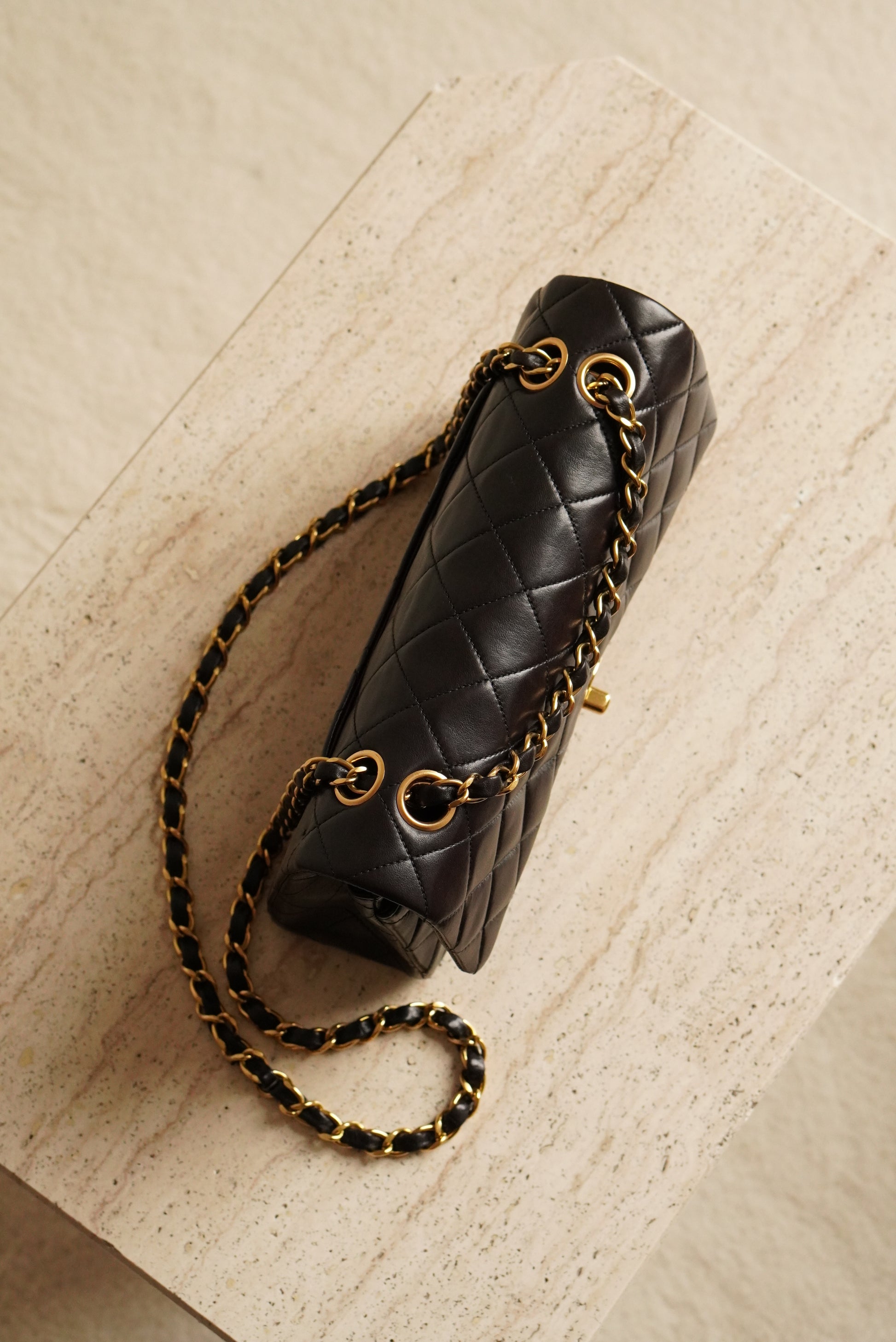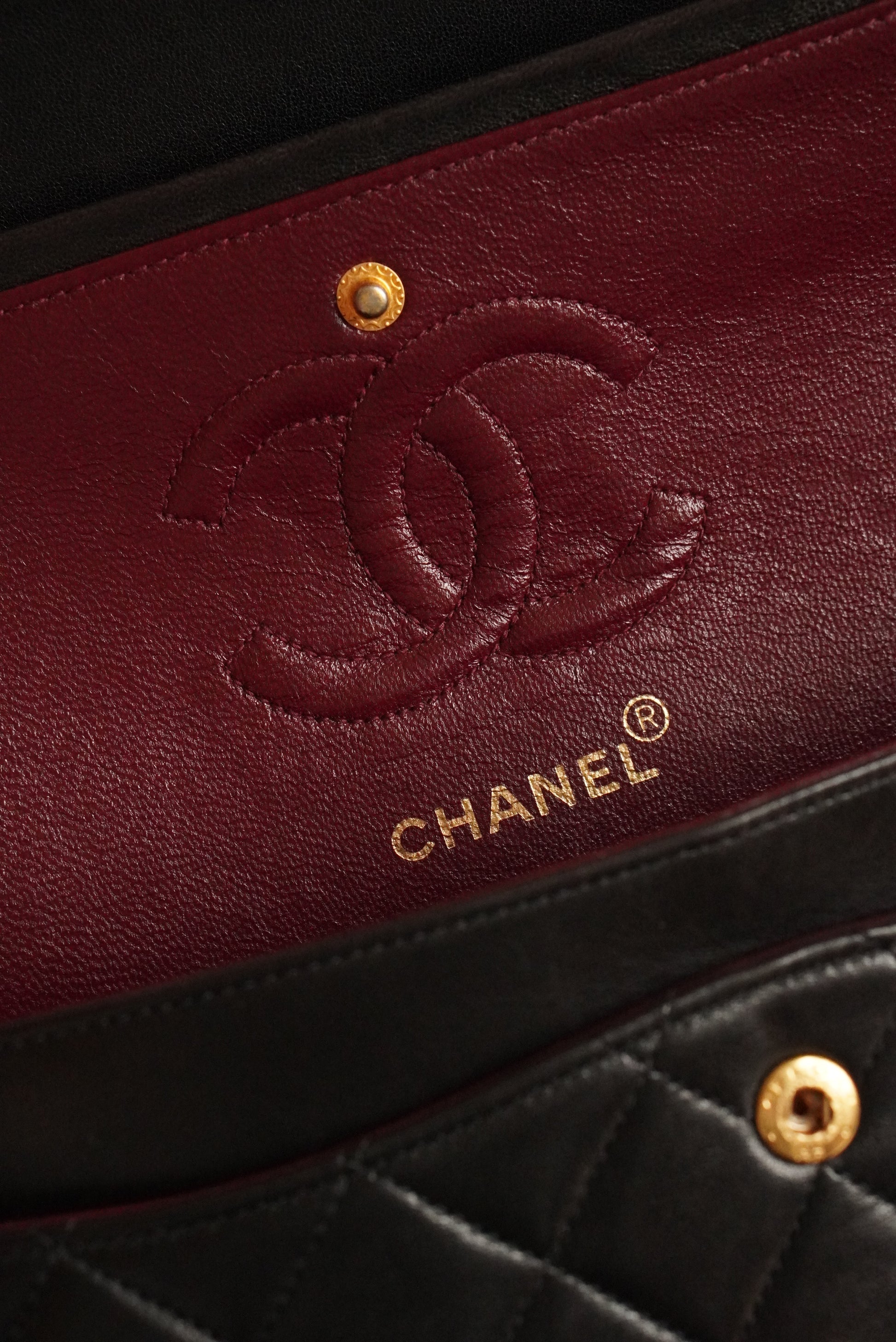 The Chanel Classic Small in black lambskin leather with 24k gold-plated hardware is a true classic. A Chanel Classic flap bag always refers to the flap bags with the CC lock and a leather-woven chain. This Chanel comes with a double flap. This means that the bag has an exterior flap closure, as well as an interior flap compartment. Other than the "main" pockets in the interior of this classic, there are a couple of extra pockets. First off, the biggest flap, that is used to close the bag, has a small inner pocket that can be closed with a zipper. Second, in between the two internal pockets, there is a space designed to hold a single lipstick. And third, on the outside of the bag there is a slip-in pocket. Inside of these Chanel Classic Small in black lambskin leather you will find burgundy leather with a Chanel logo on the biggest flap. The Chanel Classic Small comes with a 24k gold-plated metal chain, that can be used to wear the bag on the shoulder. The chain is not adjustable, but can also be worn folded to make the chain shorter. It's spacious enough to hold essentials including keys, a card holder and a smartphone.