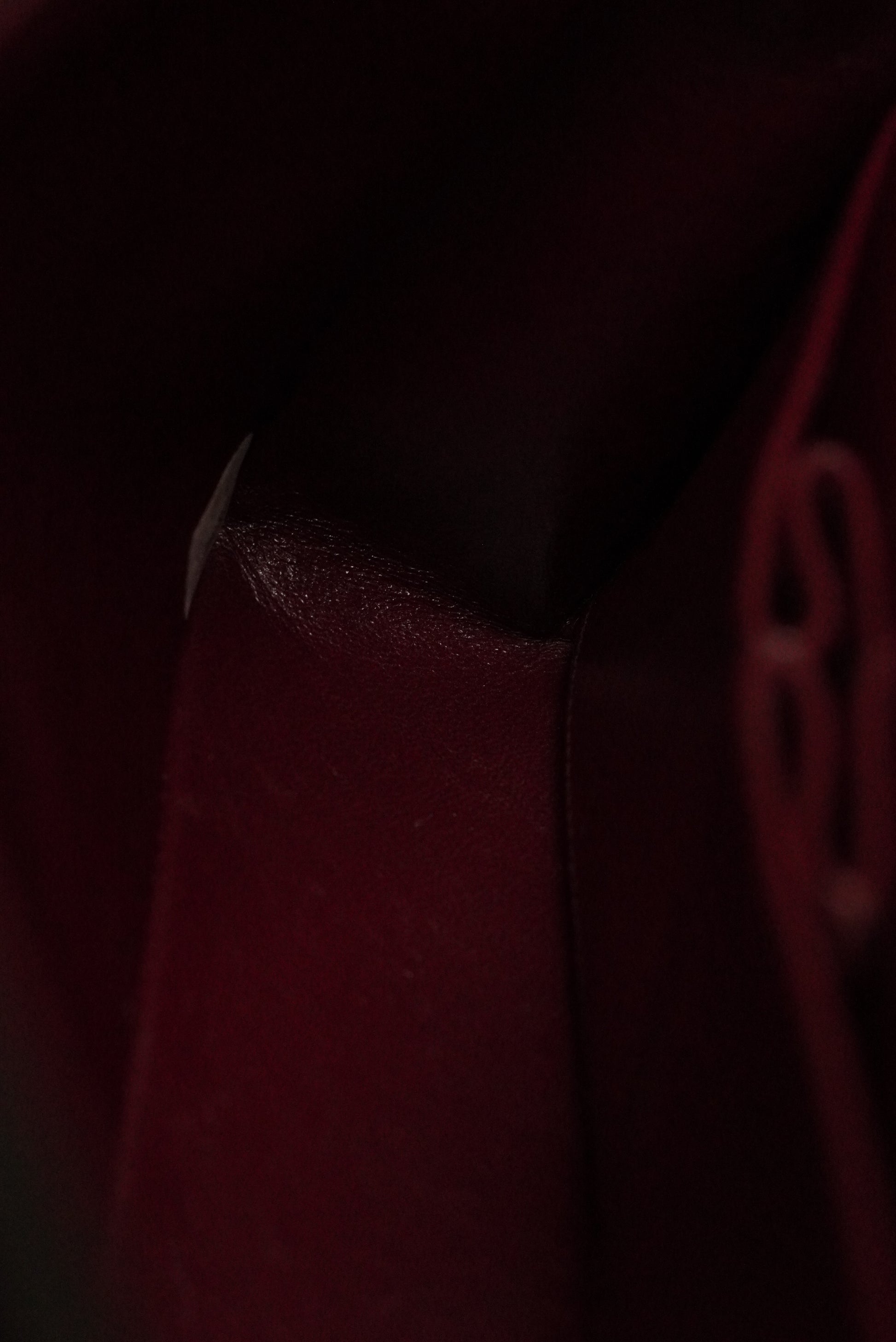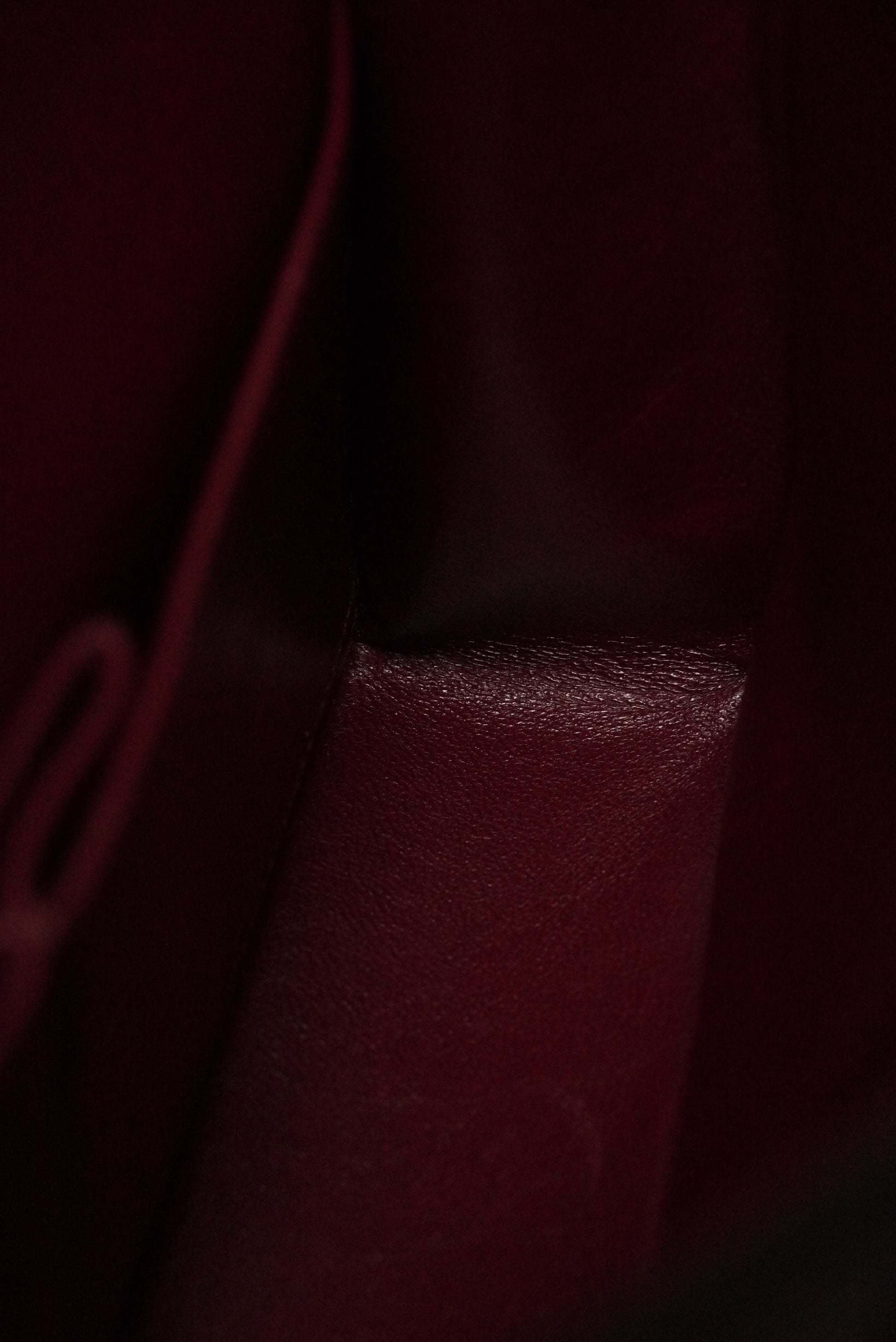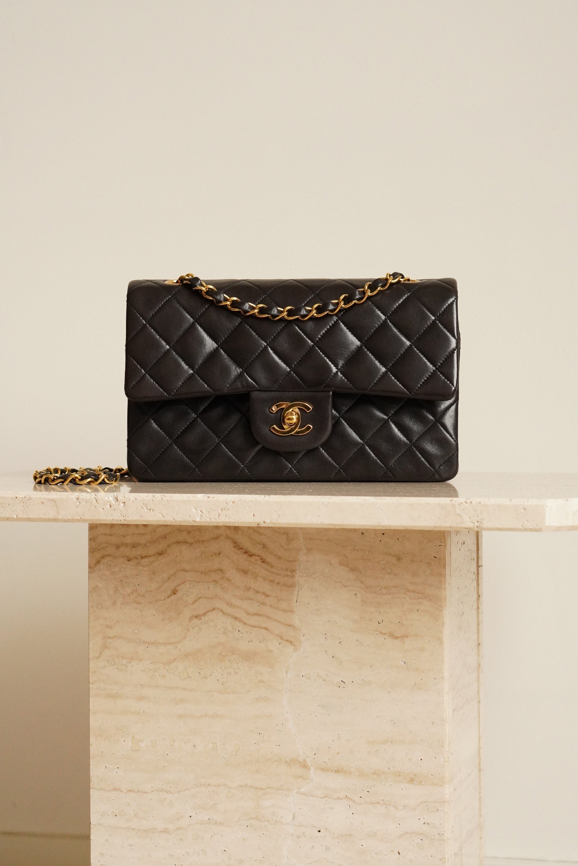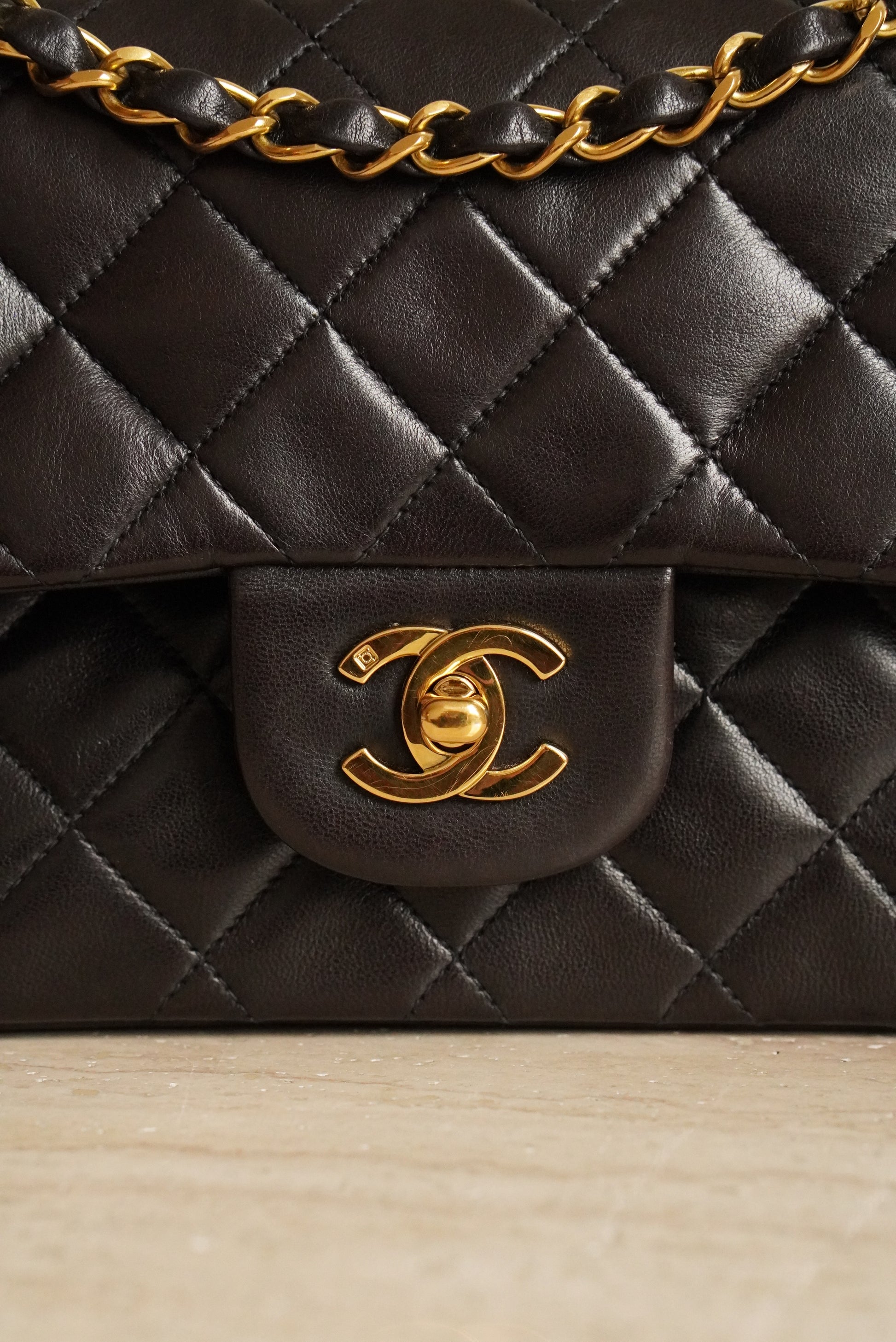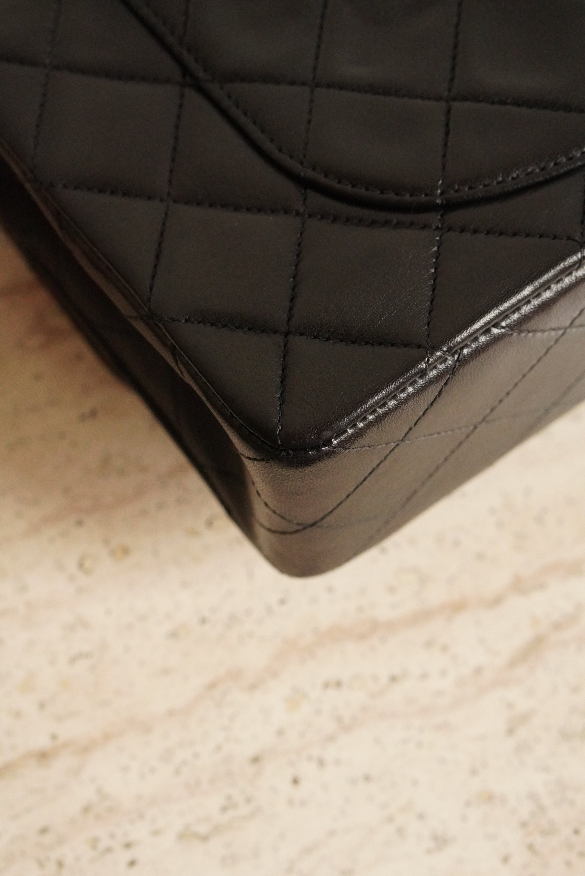 The Chanel Classic Small in black lambskin leather with 24k gold-plated hardware is a true classic. A Chanel Classic flap bag always refers to the flap bags with the CC lock and a leather-woven chain. This Chanel comes with a double flap. This means that the bag has an exterior flap closure, as well as an interior flap compartment. Other than the "main" pockets in the interior of this classic, there are a couple of extra pockets. First off, the biggest flap, that is used to close the bag, has a small inner pocket that can be closed with a zipper. Second, in between the two internal pockets, there is a space designed to hold a single lipstick. And third, on the outside of the bag there is a slip-in pocket. Inside of these Chanel Classic Small in black lambskin leather you will find burgundy leather with a Chanel logo on the biggest flap. The Chanel Classic Small comes with a 24k gold-plated metal chain, that can be used to wear the bag on the shoulder. The chain is not adjustable, but can also be worn folded to make the chain shorter. It's spacious enough to hold essentials including keys, a card holder and a smartphone.