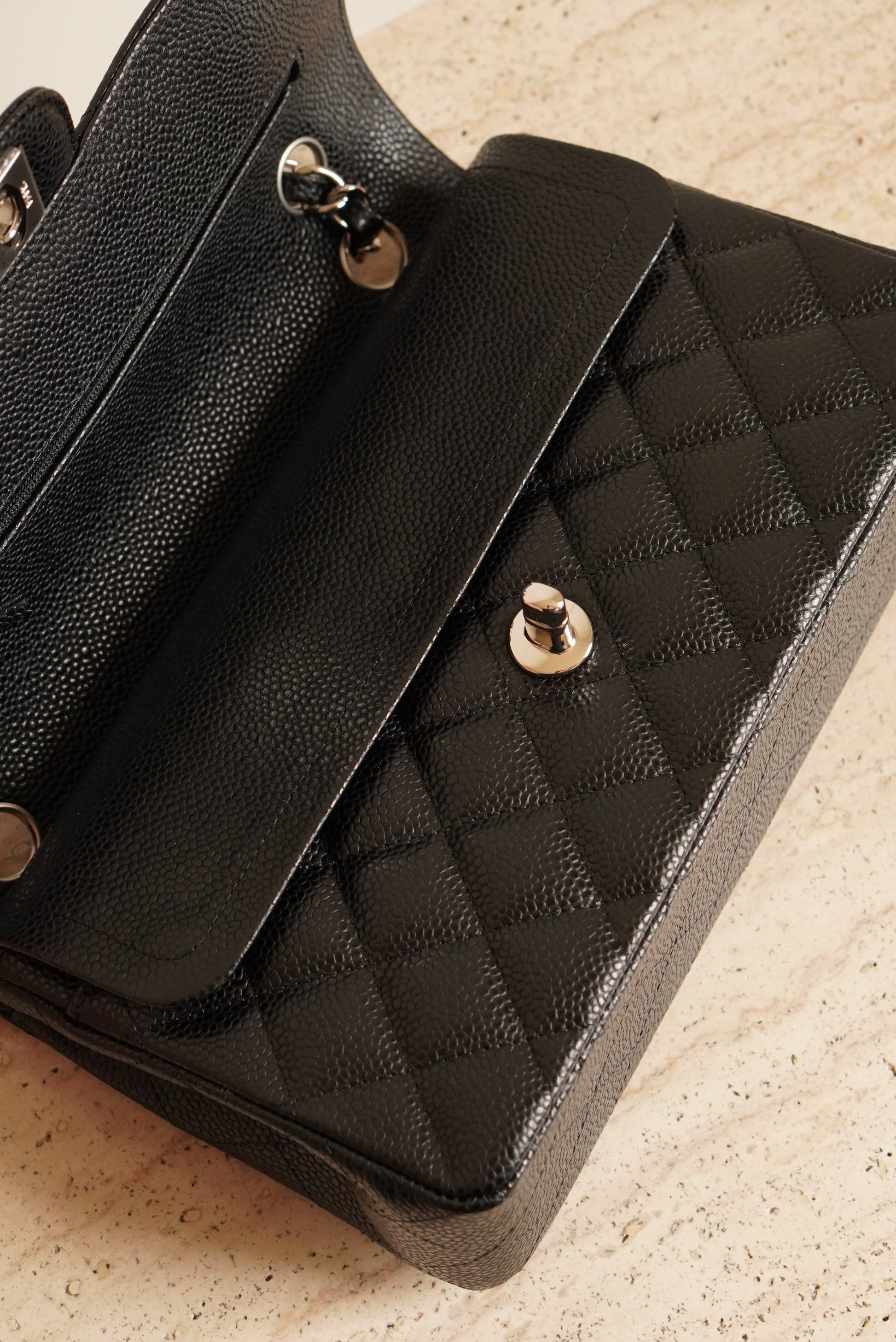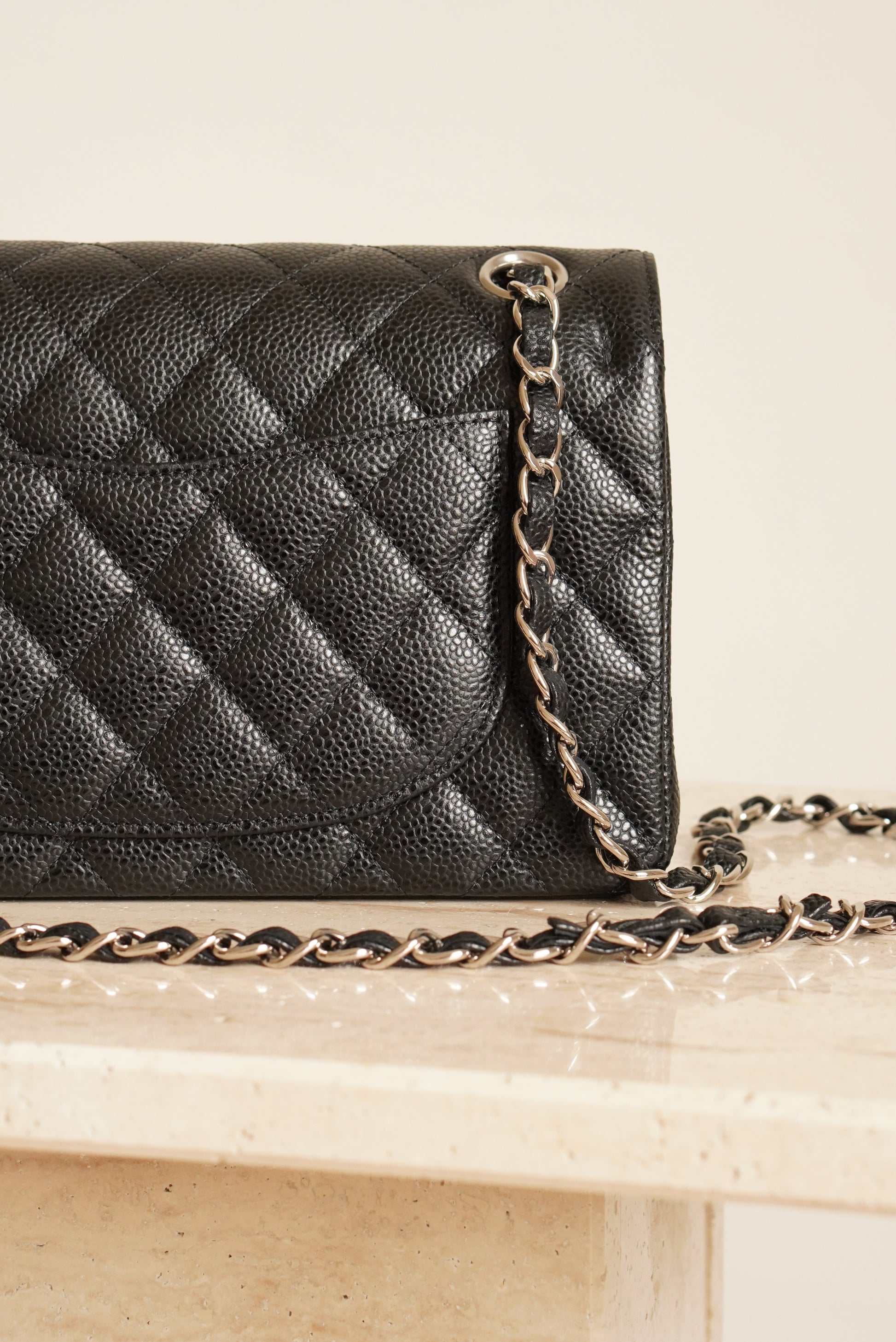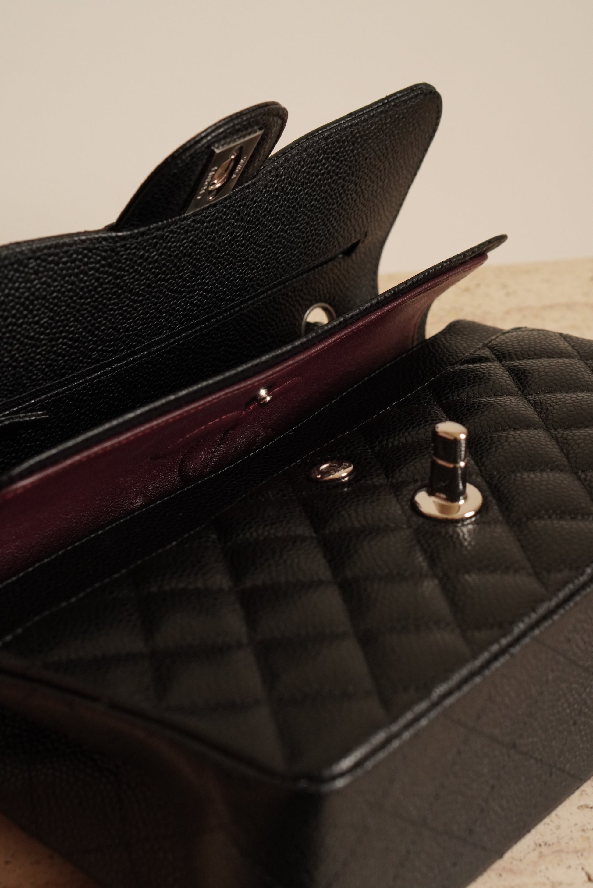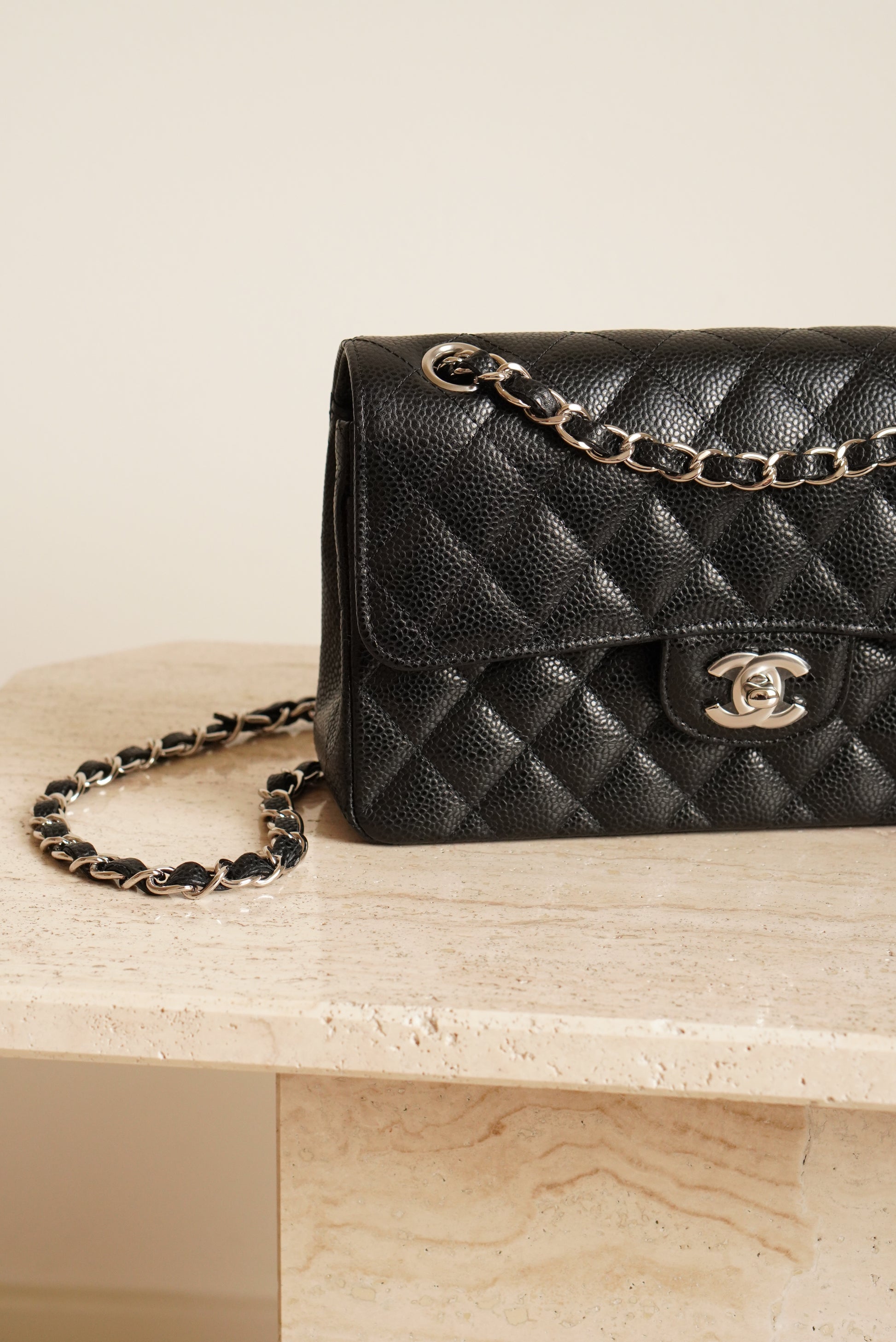 The Chanel Classic Small double flap in black caviar leather with silver hardware is a true classic. A Chanel Classic flap bag always refers to the flap bags with the CC lock and a leather-woven chain. This Chanel comes with a double flap. This means that the bag has an exterior flap closure, as well as an interior flap compartment. Other than the "main" pockets in the interior of this classic, there are a couple of extra pockets. First off, the biggest flap, that is used to close the bag, has a small inner pocket that can be closed with a zipper. Second, in between the two internal pockets, there is a space designed to hold a single lipstick. And third, on the outside of the bag there is a slip-in pocket. Inside of these Chanel Classic Small in black caviar leather you will find white leather with a Chanel logo on the biggest flap. The Chanel Classic Small comes with a silver metal chain, that can be used to wear the bag on the shoulder. The chain is not adjustable, but can also be worn folded to make the chain shorter. It's spacious enough to hold essentials including keys, a card holder and a smartphone.