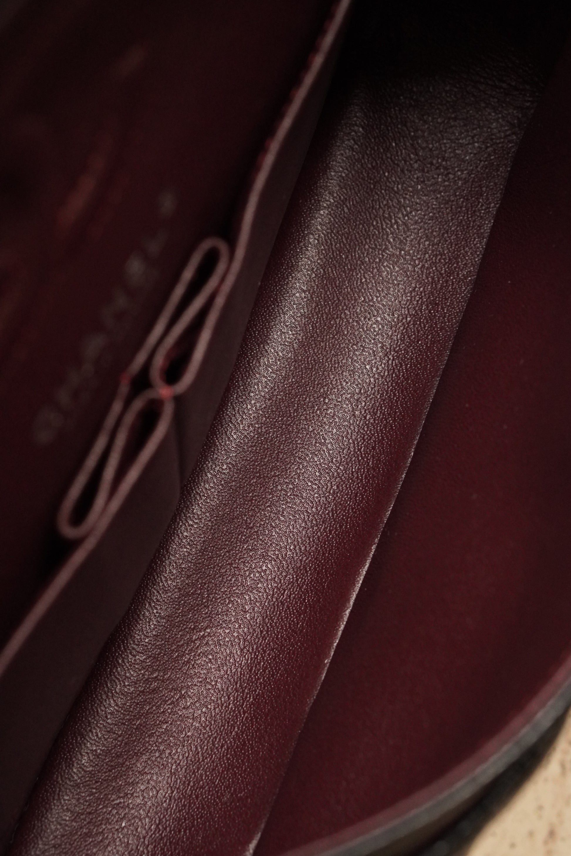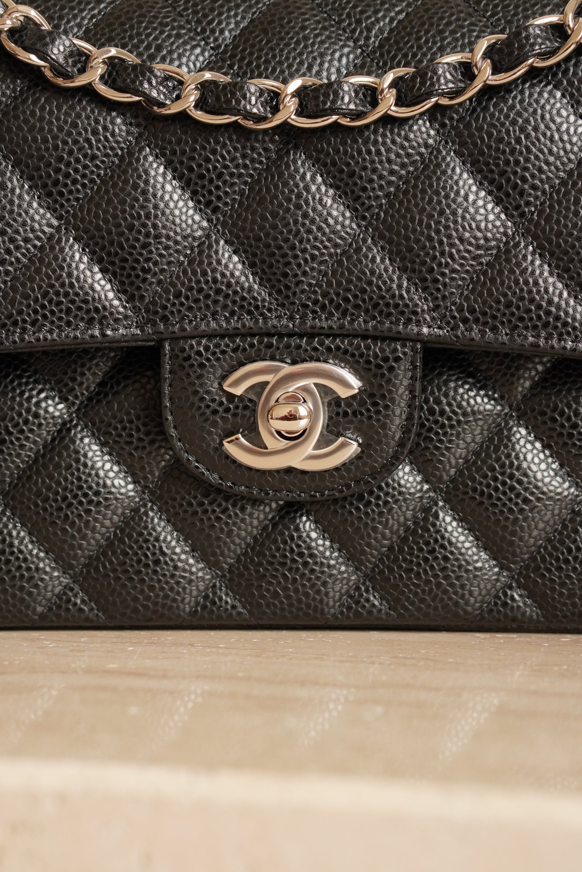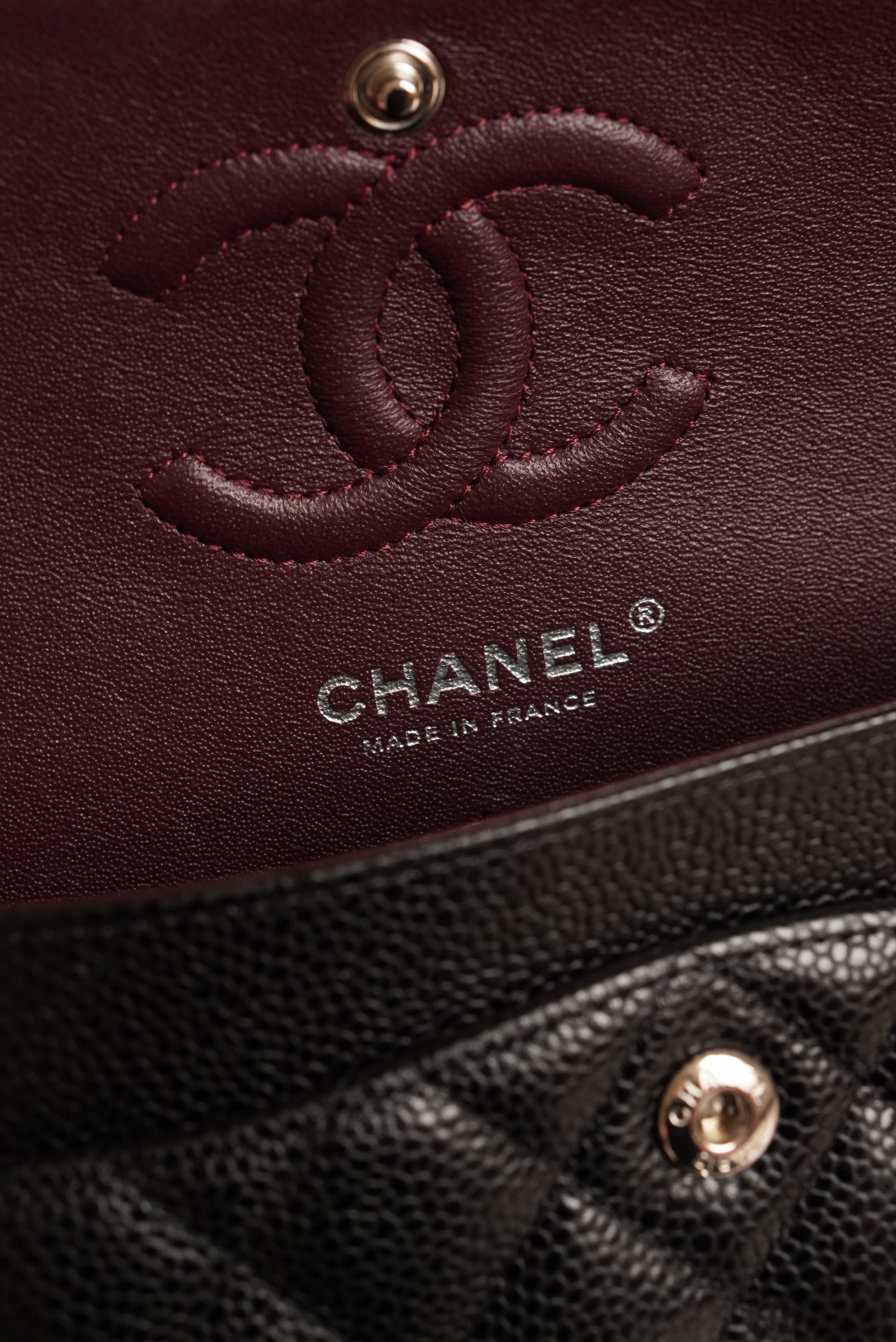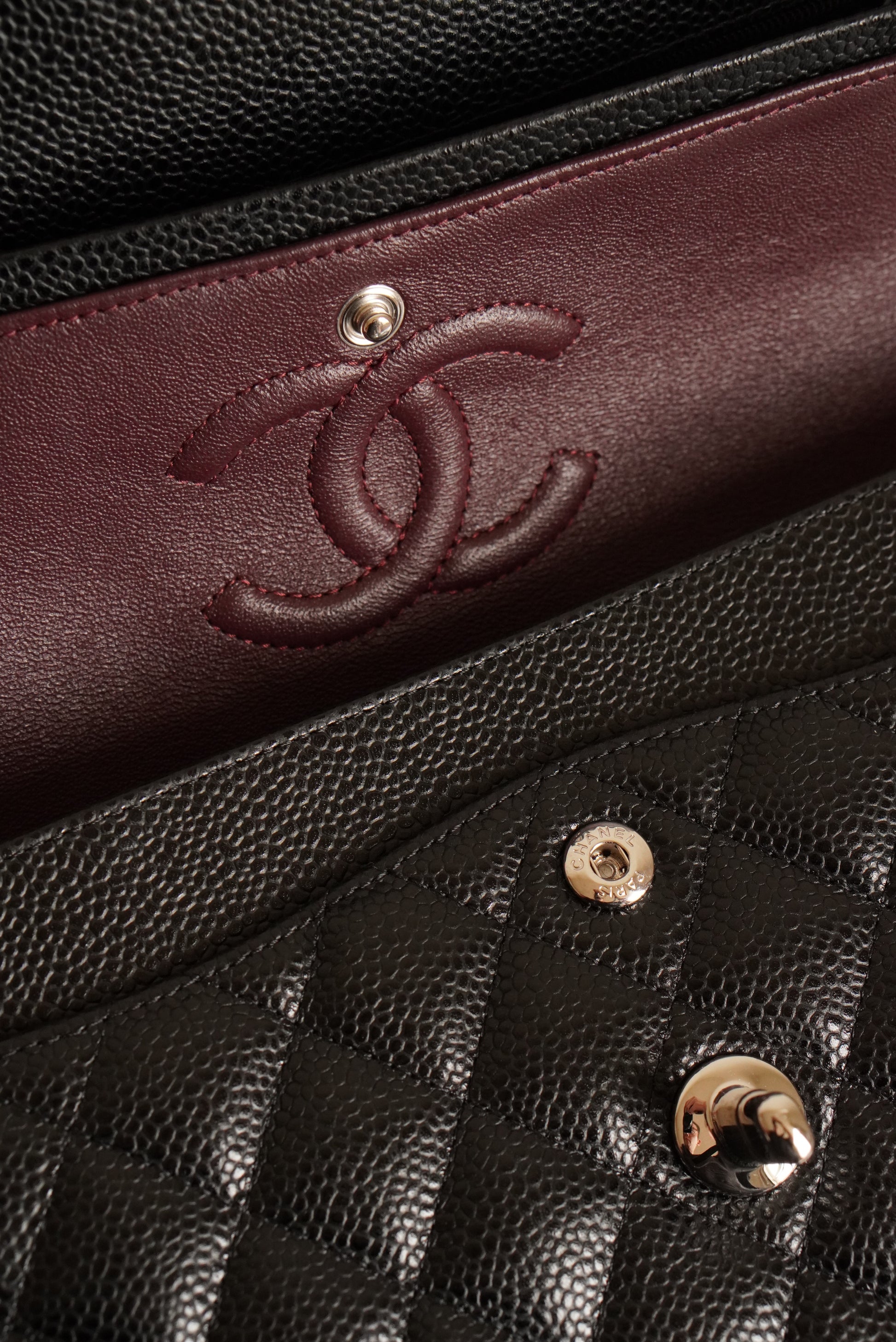 The Chanel Classic Small double flap in black caviar leather with silver hardware is a true classic. A Chanel Classic flap bag always refers to the flap bags with the CC lock and a leather-woven chain. This Chanel comes with a double flap. This means that the bag has an exterior flap closure, as well as an interior flap compartment. Other than the "main" pockets in the interior of this classic, there are a couple of extra pockets. First off, the biggest flap, that is used to close the bag, has a small inner pocket that can be closed with a zipper. Second, in between the two internal pockets, there is a space designed to hold a single lipstick. And third, on the outside of the bag there is a slip-in pocket. Inside of these Chanel Classic Small in black caviar leather you will find white leather with a Chanel logo on the biggest flap. The Chanel Classic Small comes with a silver metal chain, that can be used to wear the bag on the shoulder. The chain is not adjustable, but can also be worn folded to make the chain shorter. It's spacious enough to hold essentials including keys, a card holder and a smartphone.