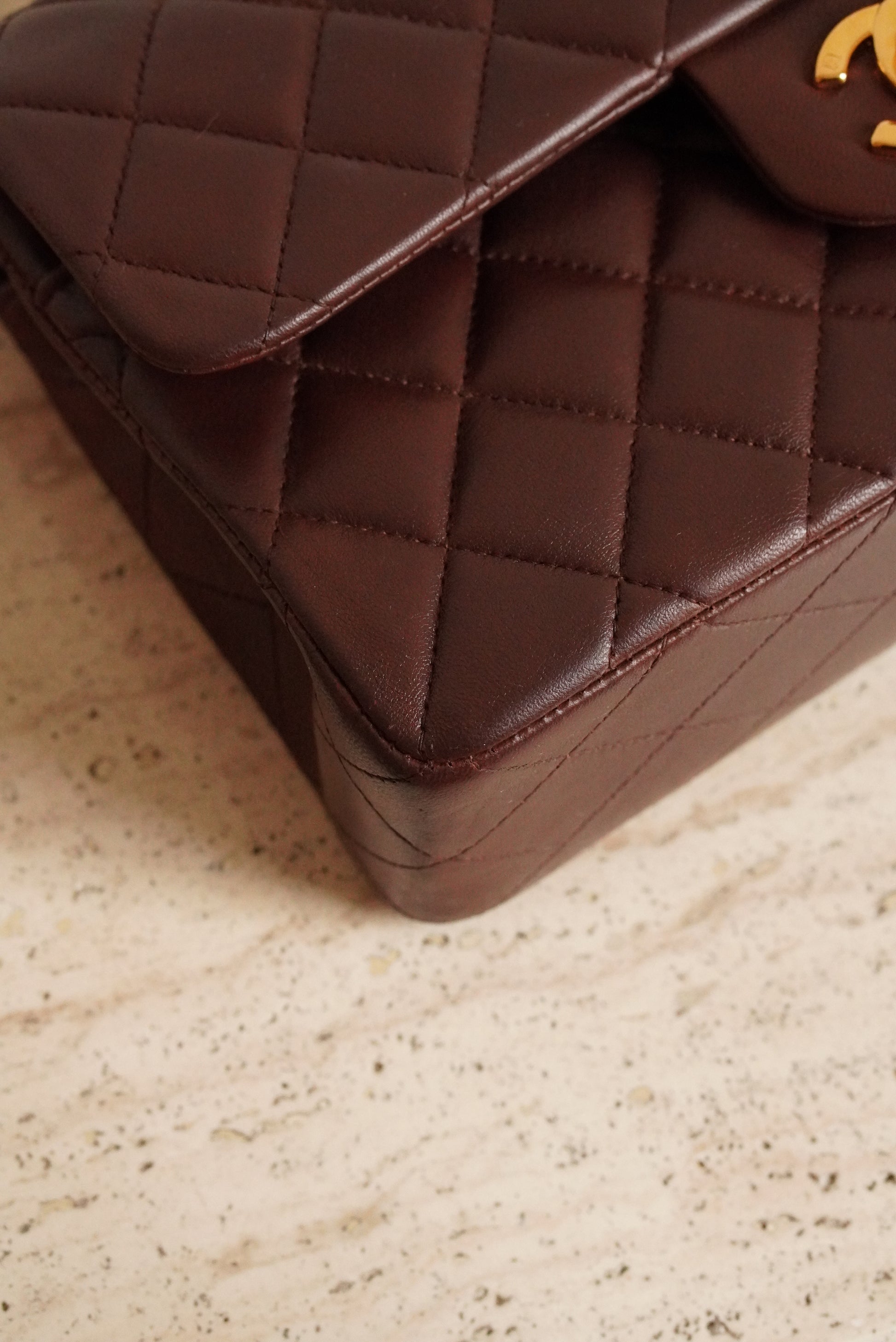In very good condition: overall, looking great, very puffy and beautiful 24k gold-plated hardware. Please be aware that it has some wear and tear on both side flap arches and on the right back corner. Furthermore, on top in the middle, there is a noticeable imperfection, as well as some wear on the chain's leather.