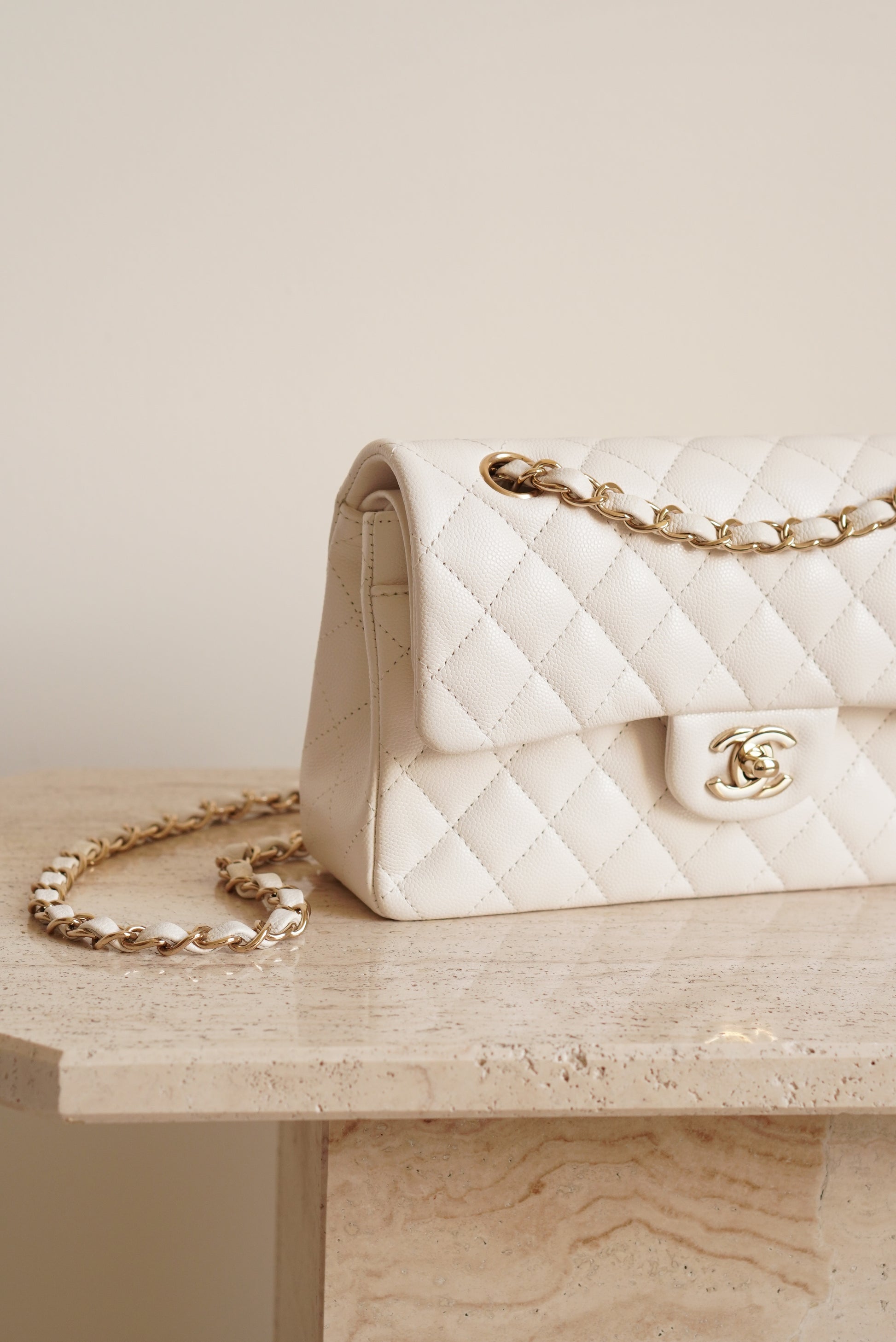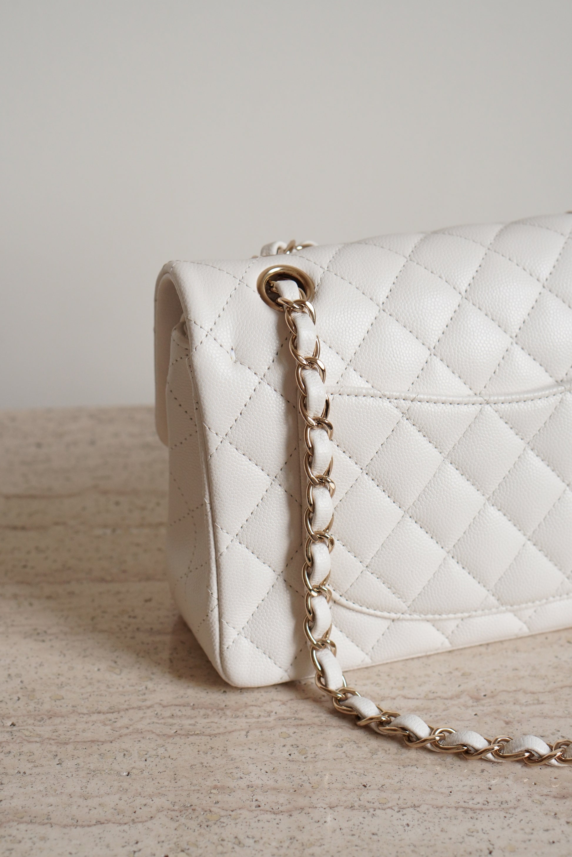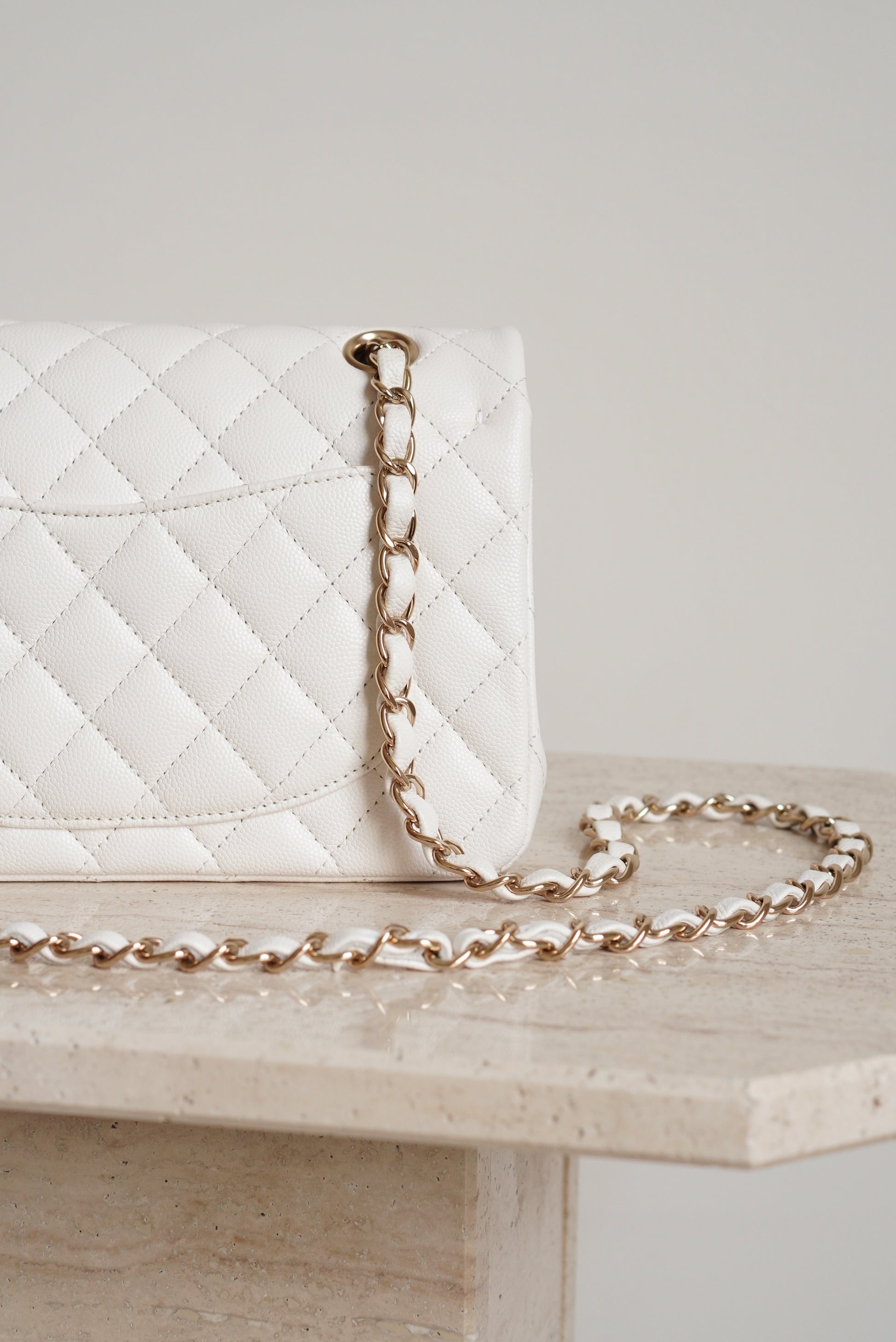 White caviar leather with light gold hardware