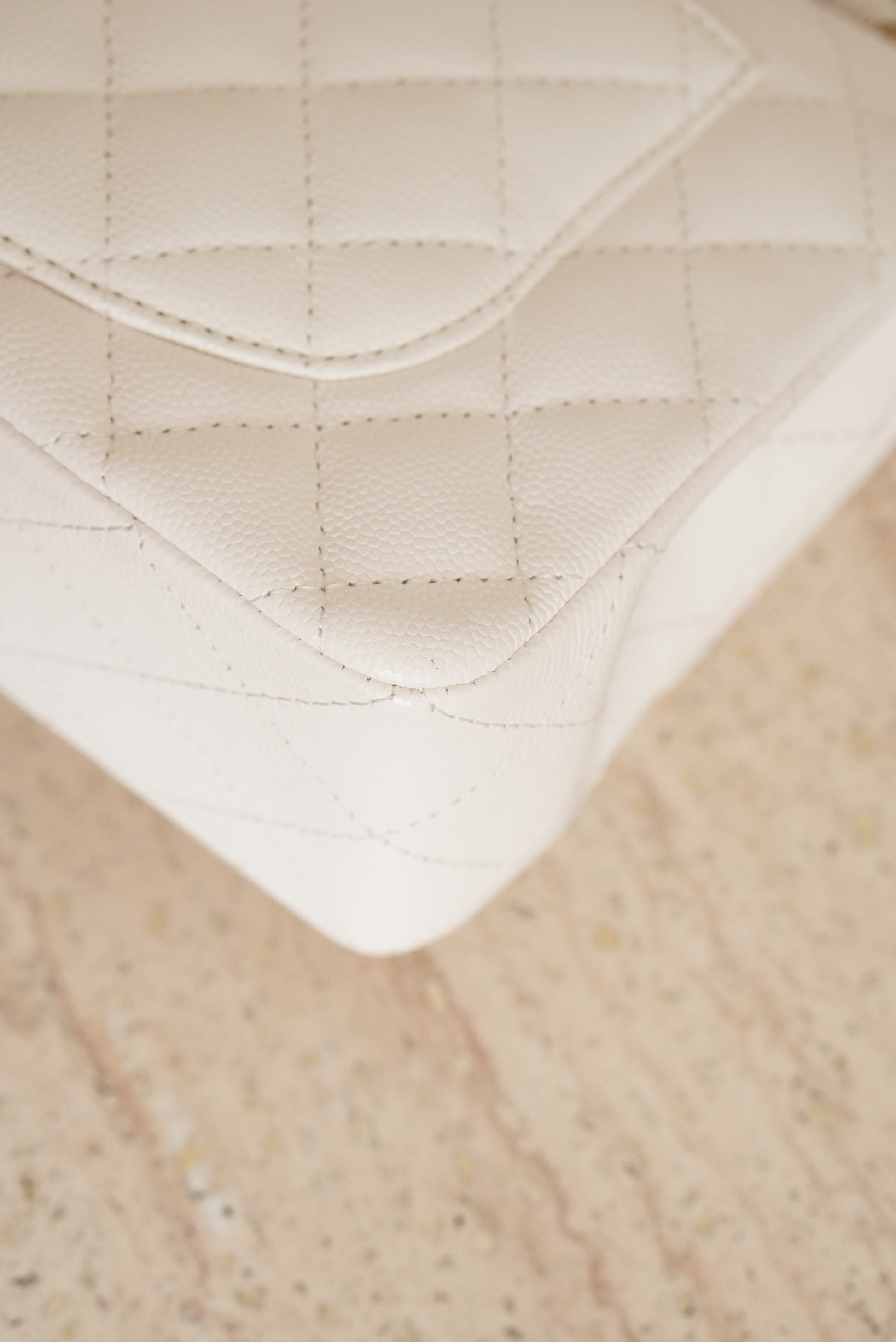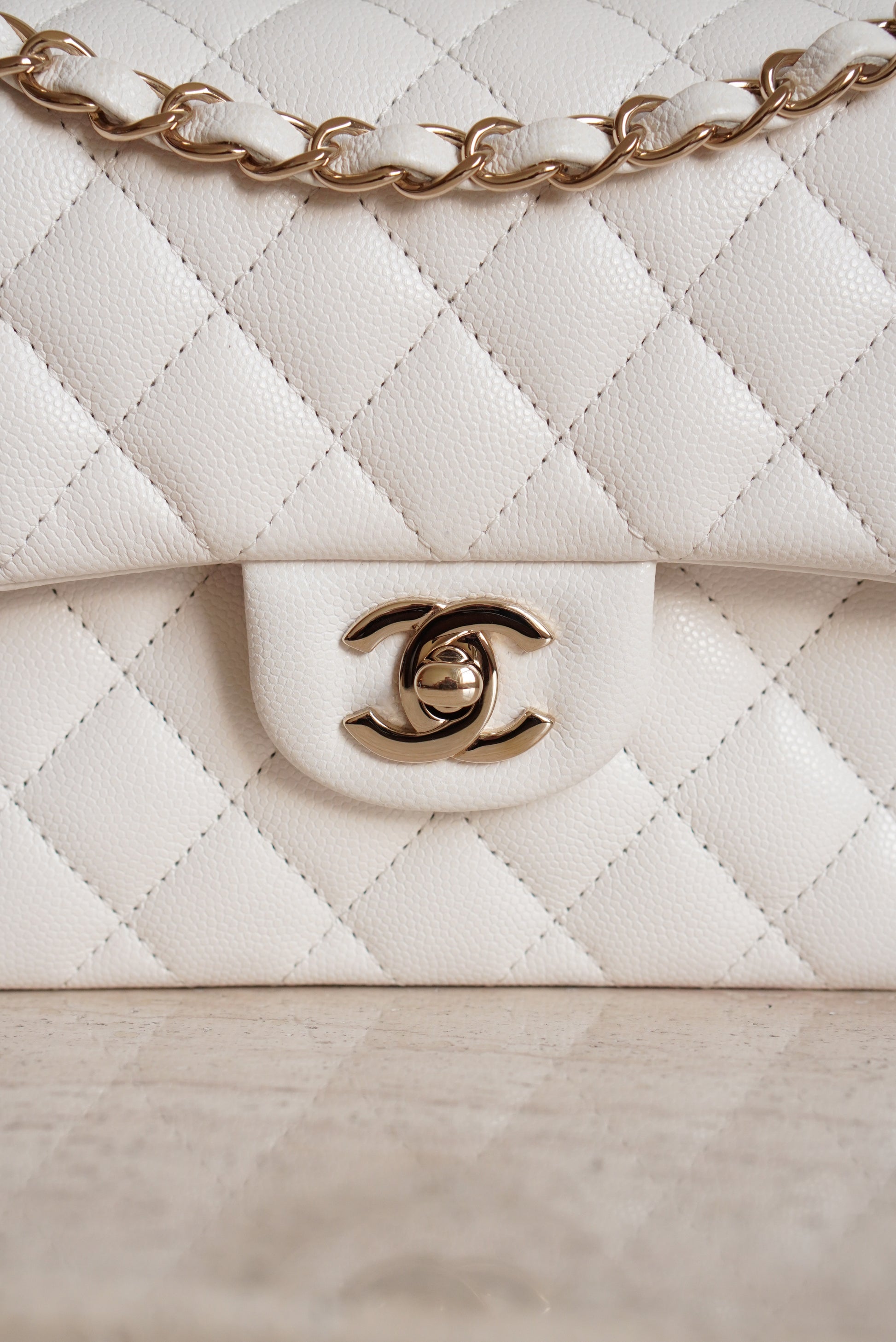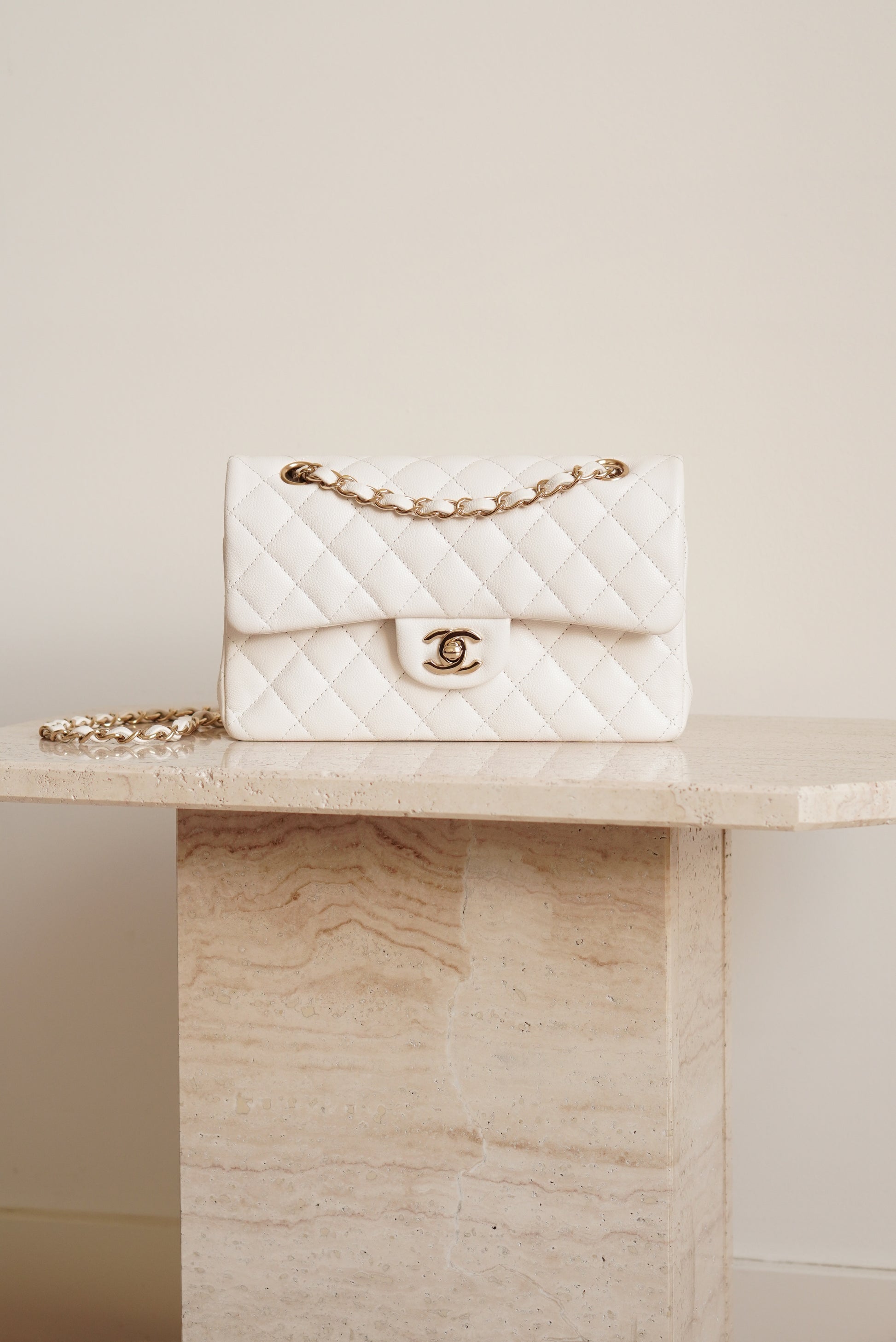 White caviar leather with light gold hardware