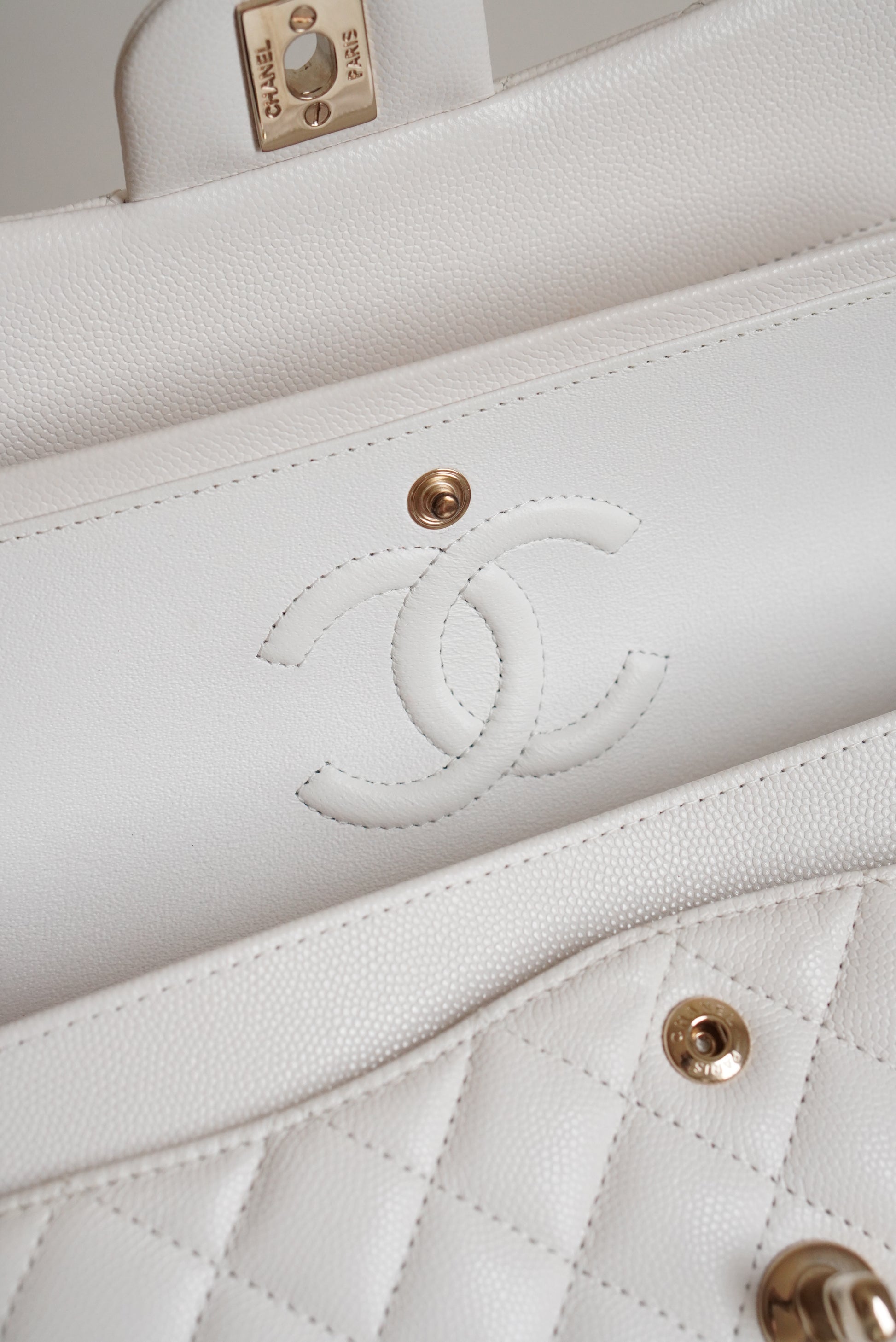 The Chanel Classic Small double flap in white caviar leather with light gold hardware is rare and a true classic. A Chanel Classic flap bag always refers to the flap bags with the CC lock and a leather-woven chain. This Chanel comes with a double flap. This means that the bag has an exterior flap closure, as well as an interior flap compartment. Other than the "main" pockets in the interior of this classic, there are a couple of extra pockets. First off, the biggest flap, that is used to close the bag, has a small inner pocket that can be closed with a zipper. Second, in between the two internal pockets, there is a space designed to hold a single lipstick. And third, on the outside of the bag there is a slip-in pocket. Inside of these Chanel Classic Small in white caviar leather you will find white leather with a Chanel logo on the biggest flap. The Chanel Classic Small comes with a gold-toned metal chain, that can be used to wear the bag on the shoulder. The chain is not adjustable, but can also be worn folded to make the chain shorter. It's spacious enough to hold essentials including keys, a card holder and a smartphone.