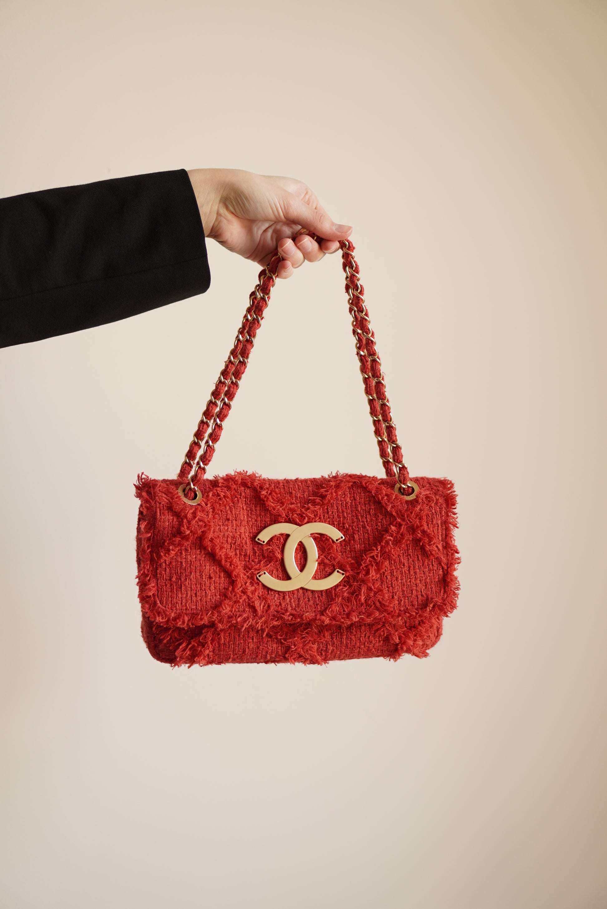 This rare Chanel flap bag is a bold reinterpretation of the House’s timeless elegance, crafted from thick, durable red tweed with an oversized diamond-quilted pattern and delicate fringe detailing. Striking in both texture and silhouette, it is a true statement piece that commands attention while staying rooted in classic Chanel craftsmanship. The front flap is adorned with an extra-large gold-tone CC logo, a signature emblem of the brand’s enduring prestige. Signature leather-woven chain straps add versatility, allowing the bag to be worn over the shoulder or across the body with effortless style. Inside, the spacious interior is lined in soft beige fabric and features a zipped back pocket, offering both practicality and refinement. It fits your daily necessities.