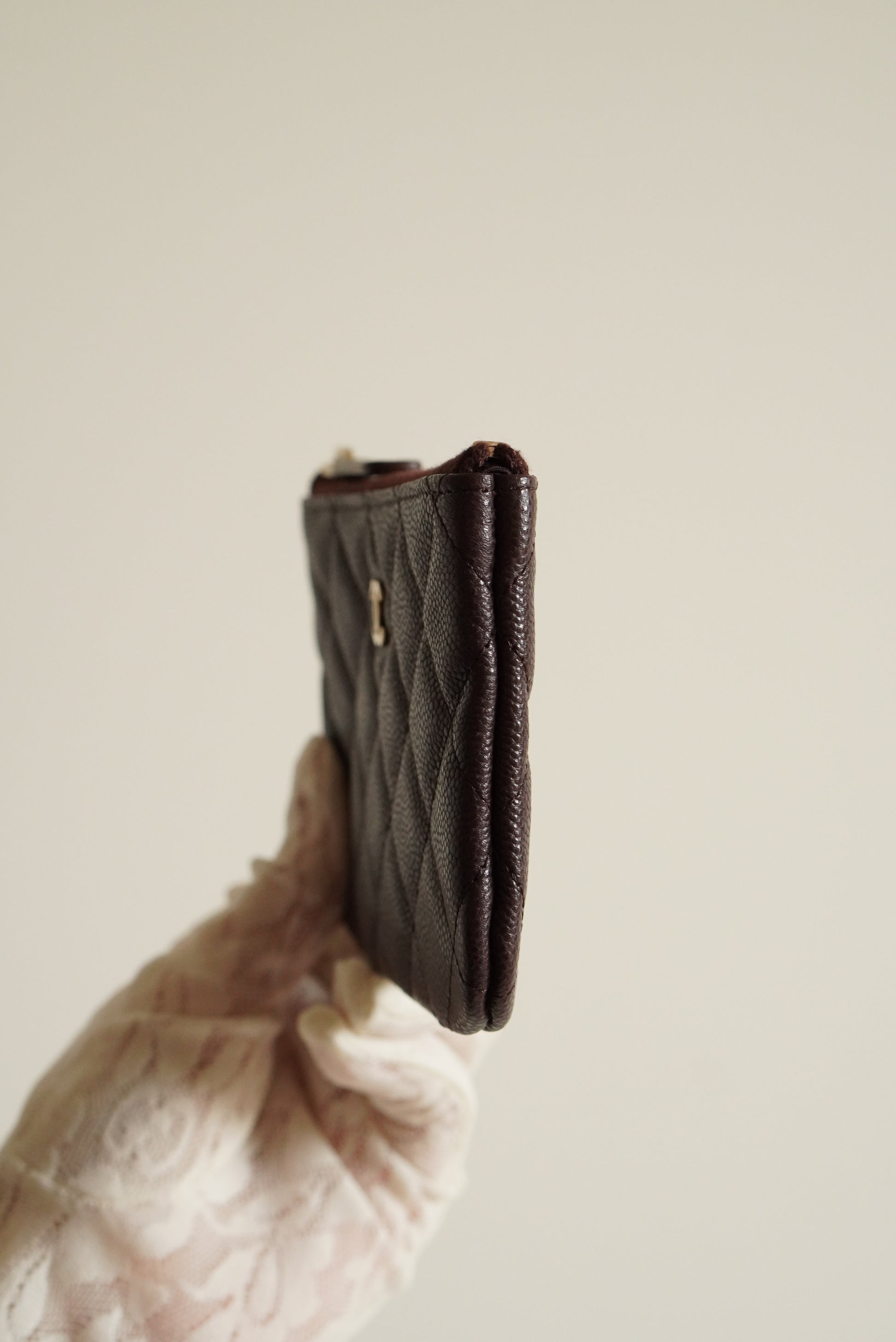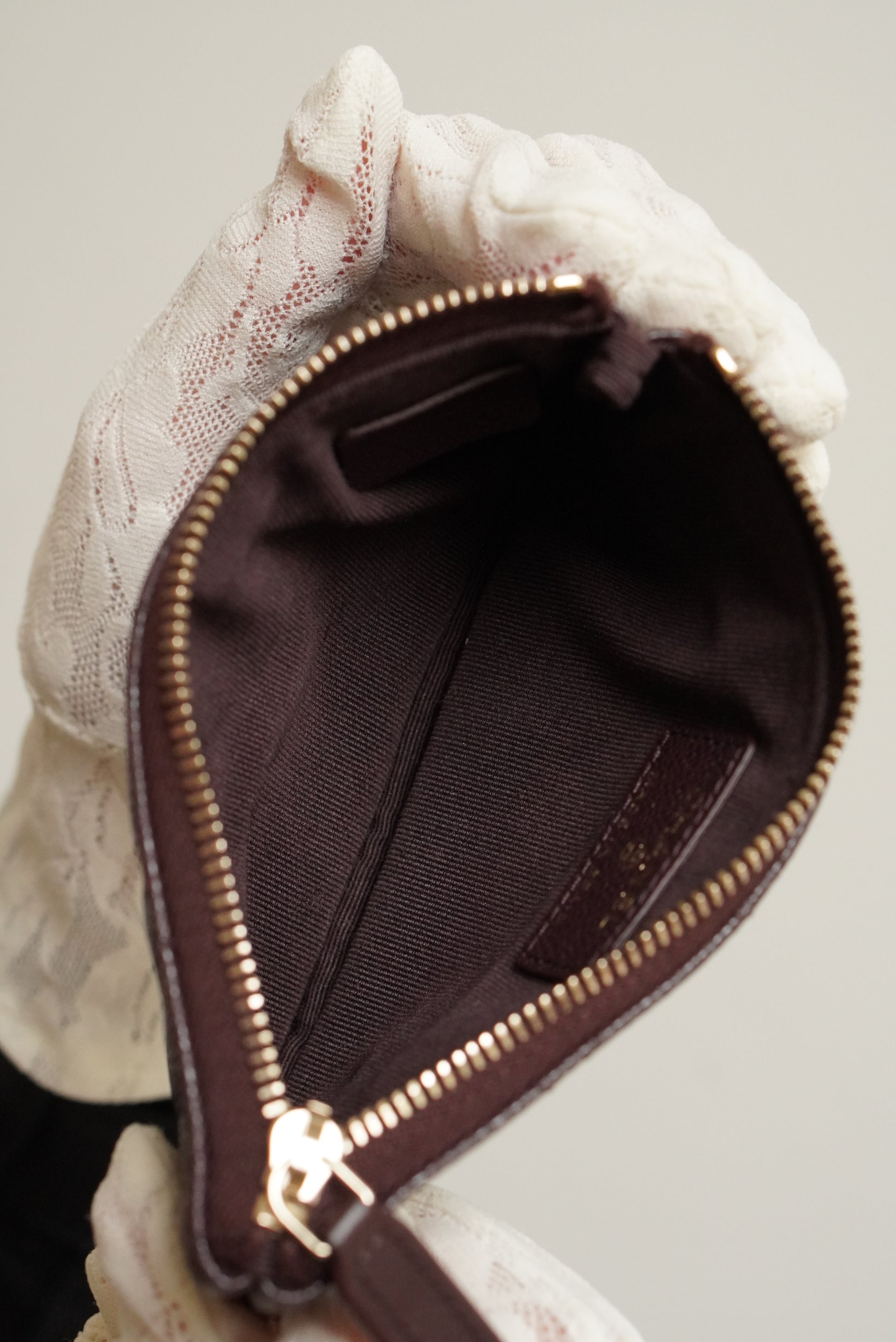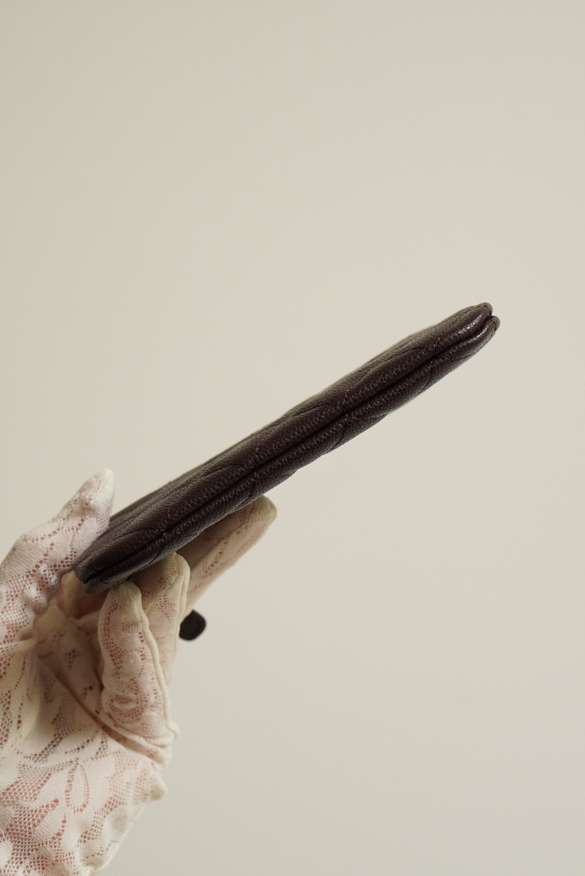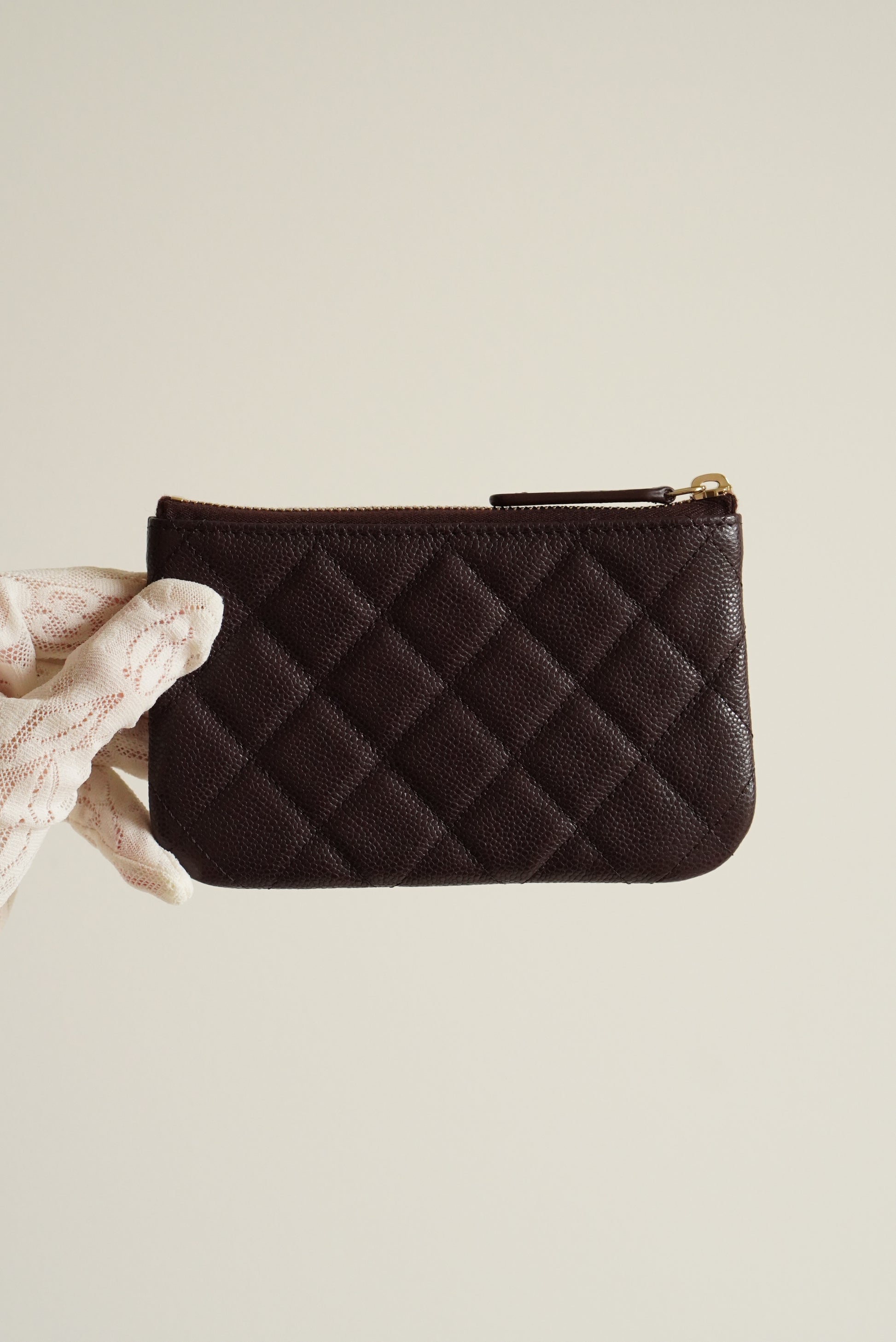 The Chanel Mini O Case pouch is a must-have accessory for any Chanel lover. Crafted from durable aubergine caviar leather and finished with luxurious gold-tone hardware, this compact pouch combines sophistication with functionality. The diamond-quilted exterior and signature CC logo offer an iconic Chanel look, while the secure top zip closure keeps your essentials safe. Perfect for carrying your cards, keys, lipstick or other small items, the mini O Case fits seamlessly into a larger bag.