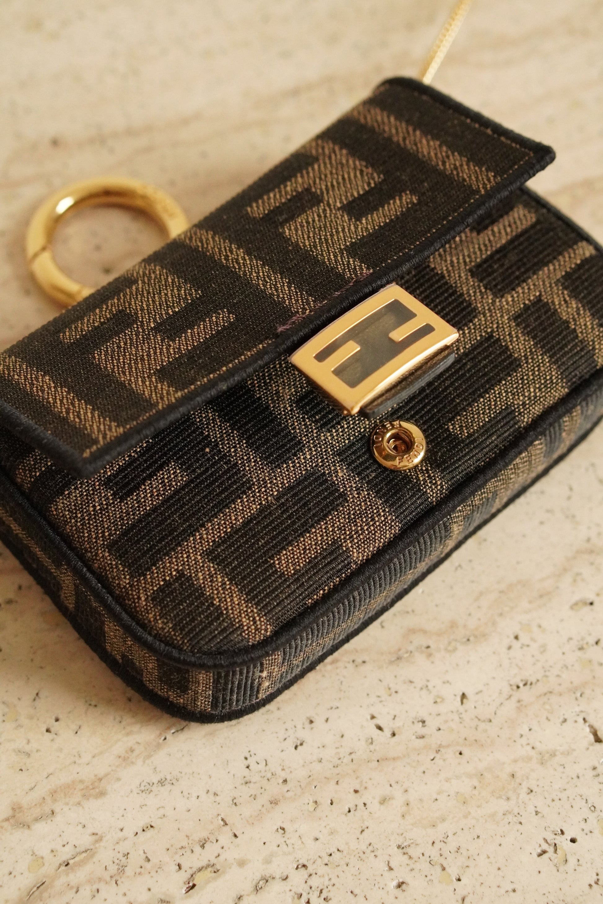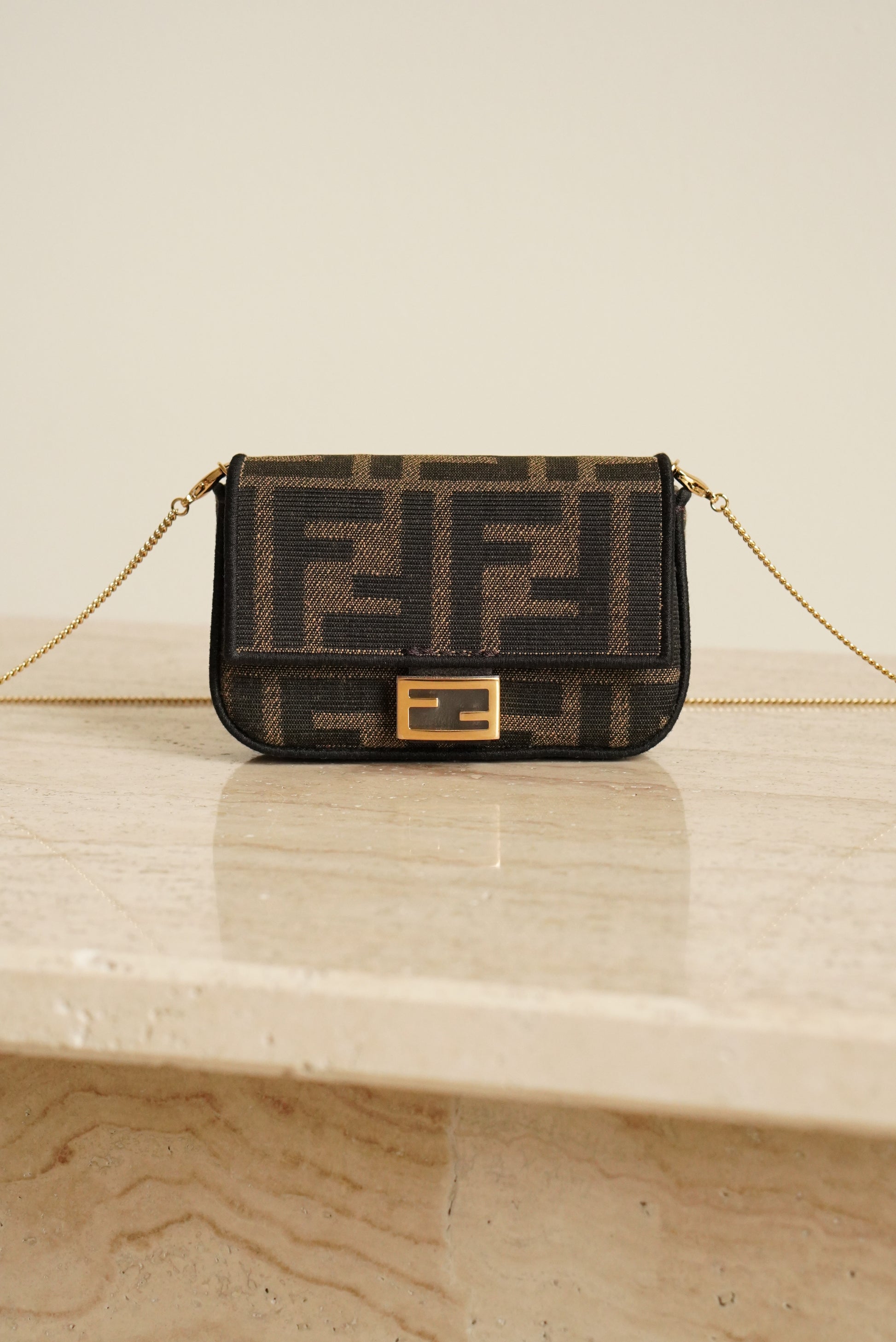 The Nano Baguette is a miniature version of the iconic Baguette bag, designed with a flap and FF fastening. It is made of jacquard fabric with iconic FF motif, complemented by a black lining, black calfskin leather and gold-finish metalware for a refined touch. The clip allows it to be attached like a charm to larger bags, worn on a belt or just as a mini pouch on your jeans, while the fine chain strap offers the option to carry it cross-body. Inside, there is a flat card pocket and enough space for a small essential such as keys or lipstick.