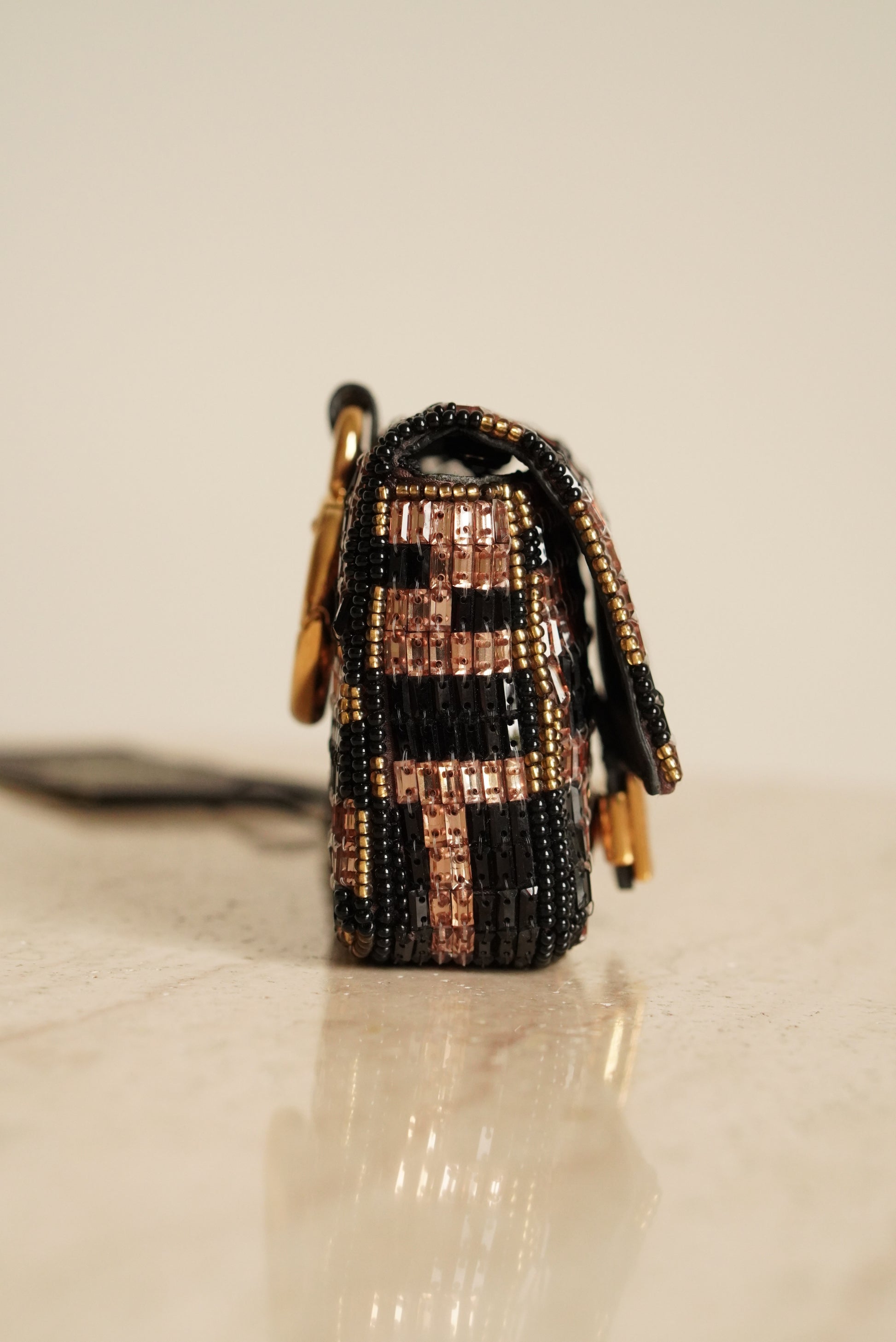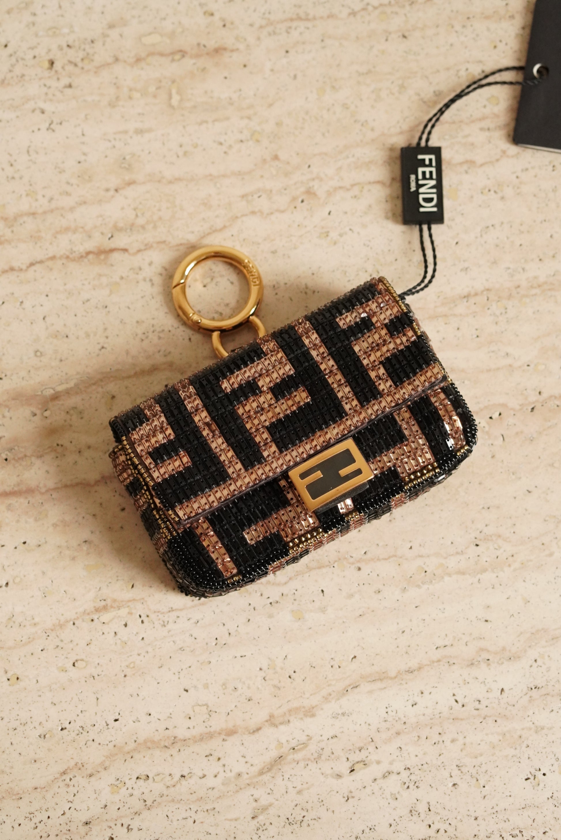 The Nano Baguette is a miniature version of the iconic Baguette bag, designed with a flap and FF fastening. It is embellished with black and brown beads in FF embroidery, complemented by a black lining, black calfskin leather and gold-finish metalware for a refined touch. The clip allows it to be attached like a charm to larger bags, worn on a belt or just as a mini pouch on your jeans, while the fine chain strap offers the option to carry it cross-body. Inside, there is a flat card pocket and enough space for a small essential such as keys or lipstick.