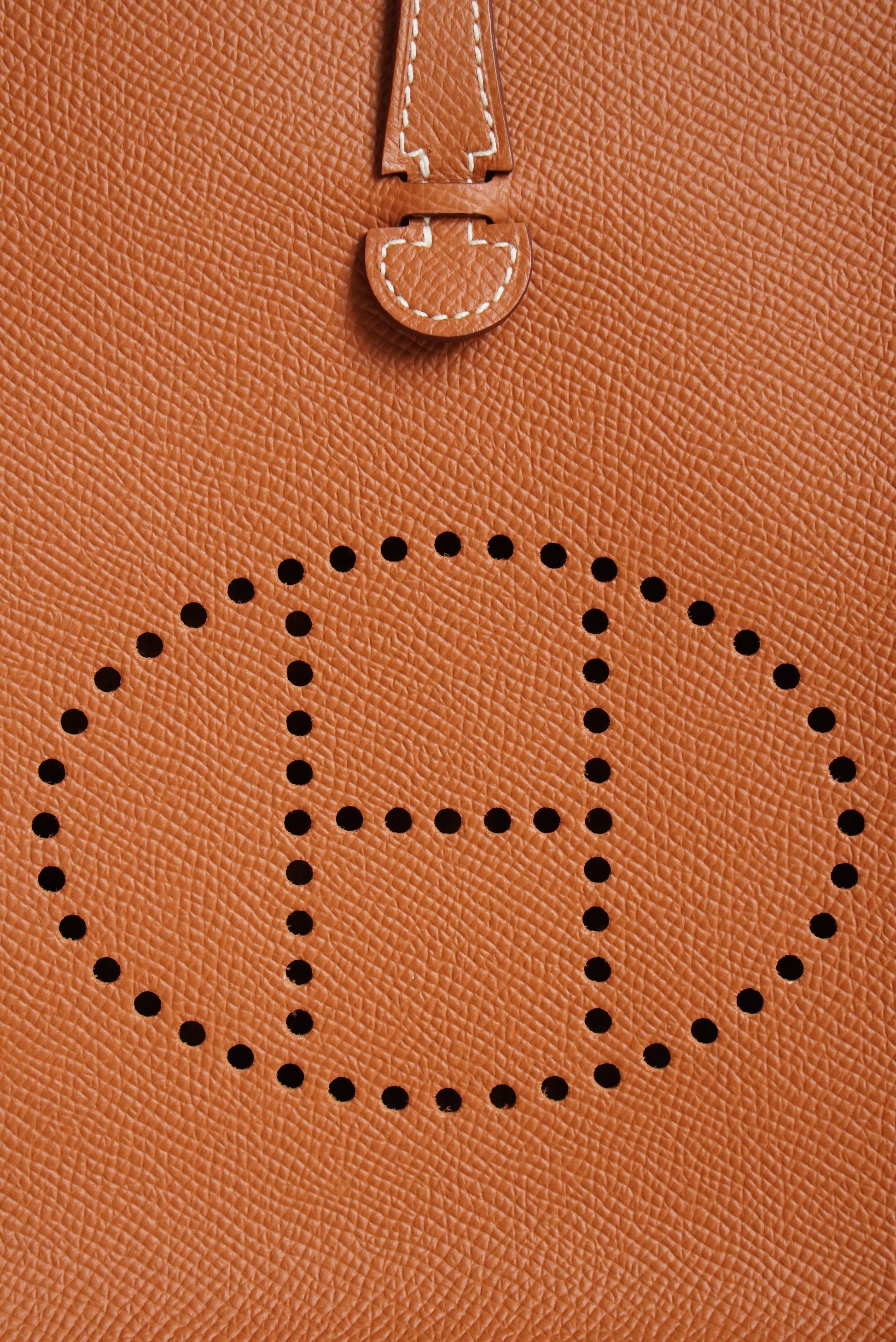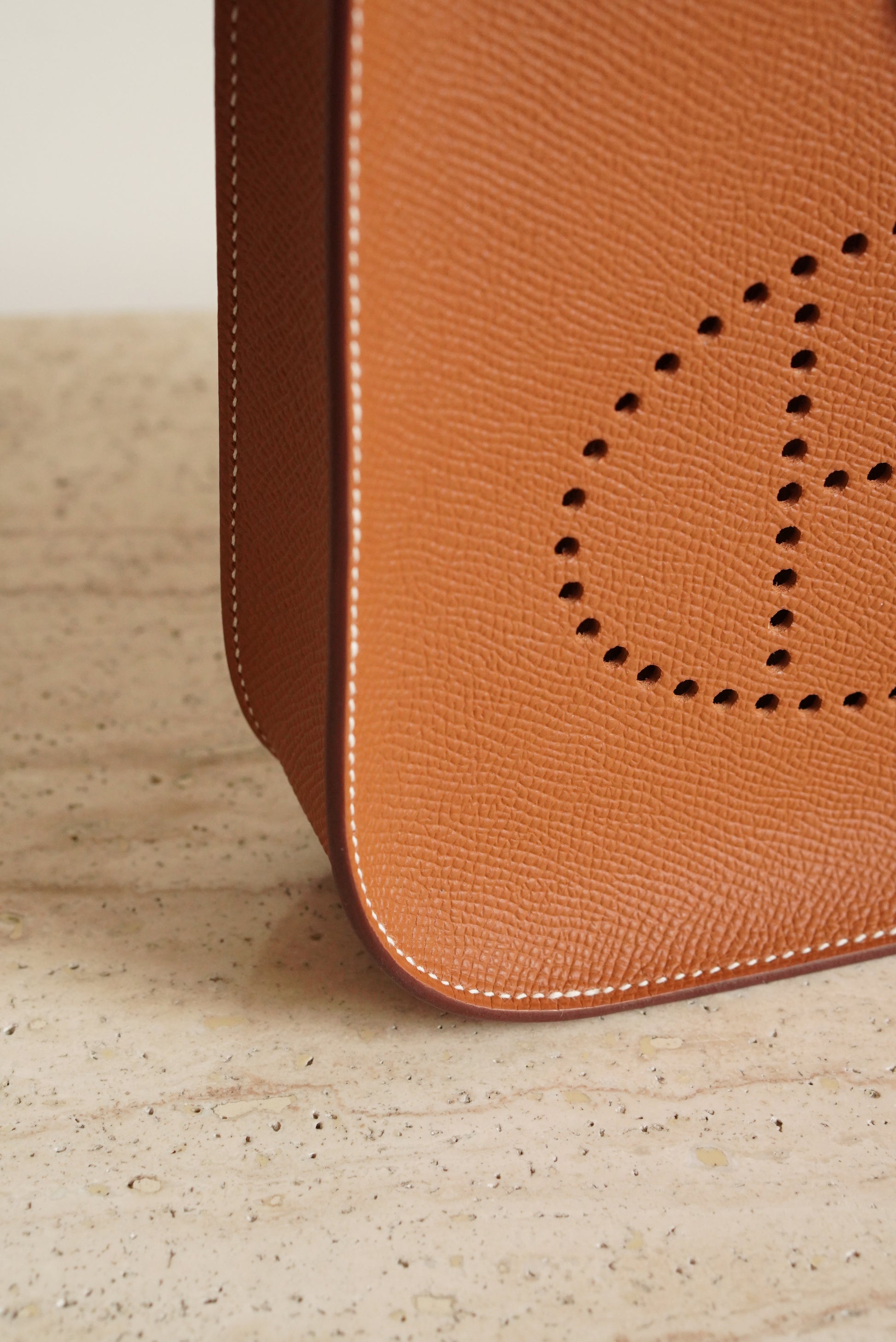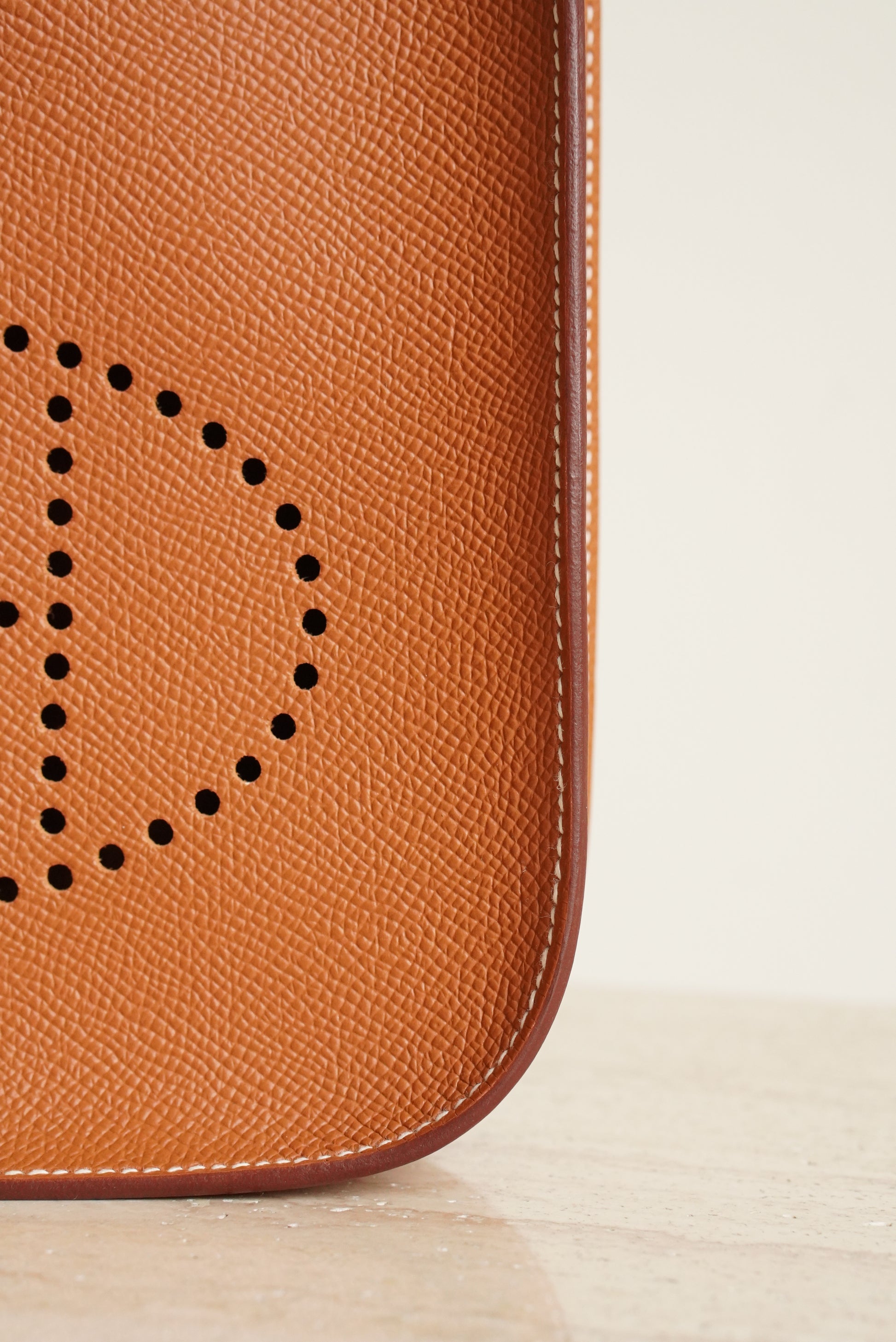 The newly re-released Hermès Evelyne 16 Sellier bag makes it the perfect everyday companion, keeping your essentials close at hand. It was originally designed to transport equestrian equipment, nowadays it strikes the perfect balance between function and fashion. The H-shaped perforation on the back, originally intended for drying grooming accessories, adds a unique touch of functionality. It has been handcrafted using Gold Epsom leather with palladium hardware. The shoulder strap can not be adjusted in length.