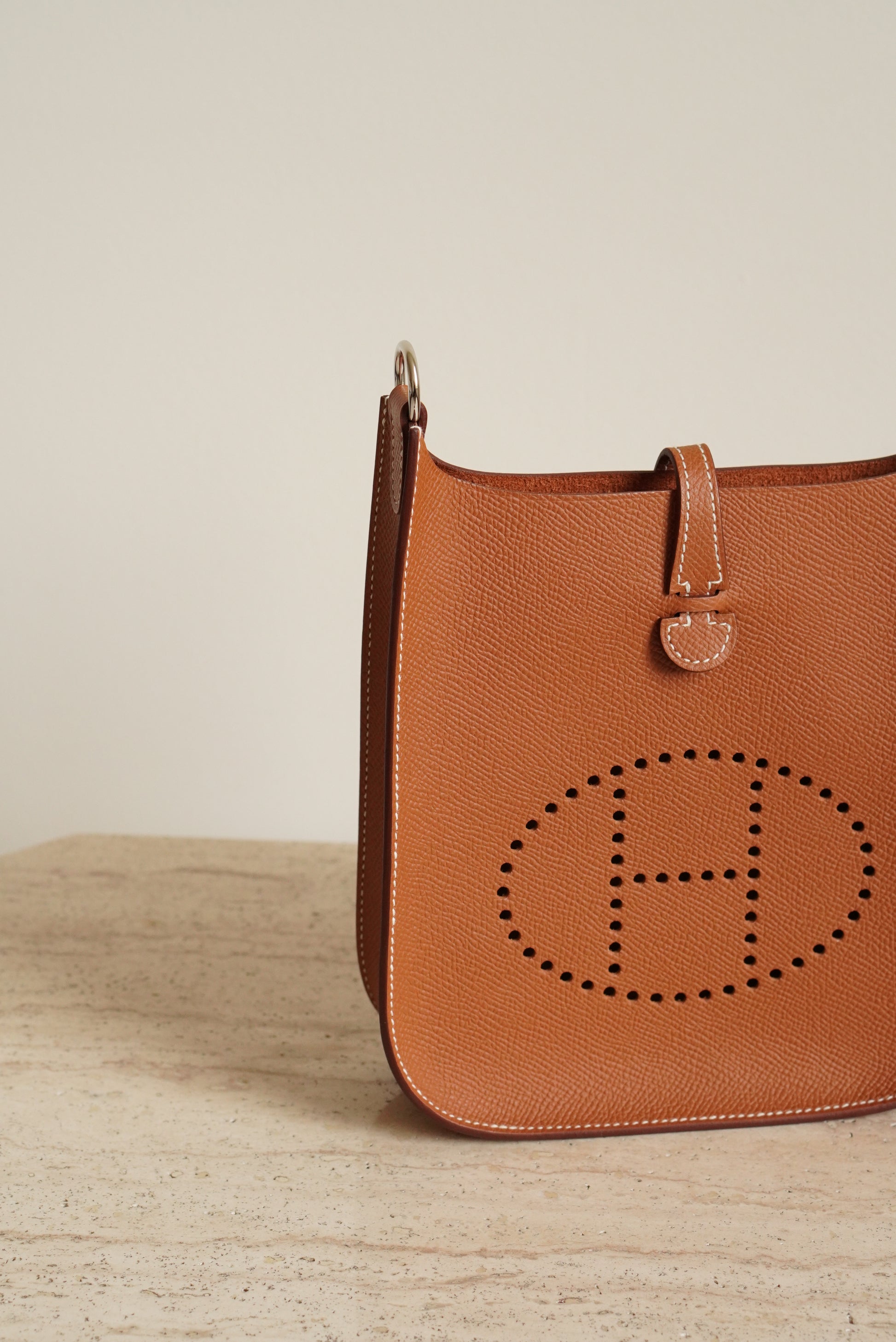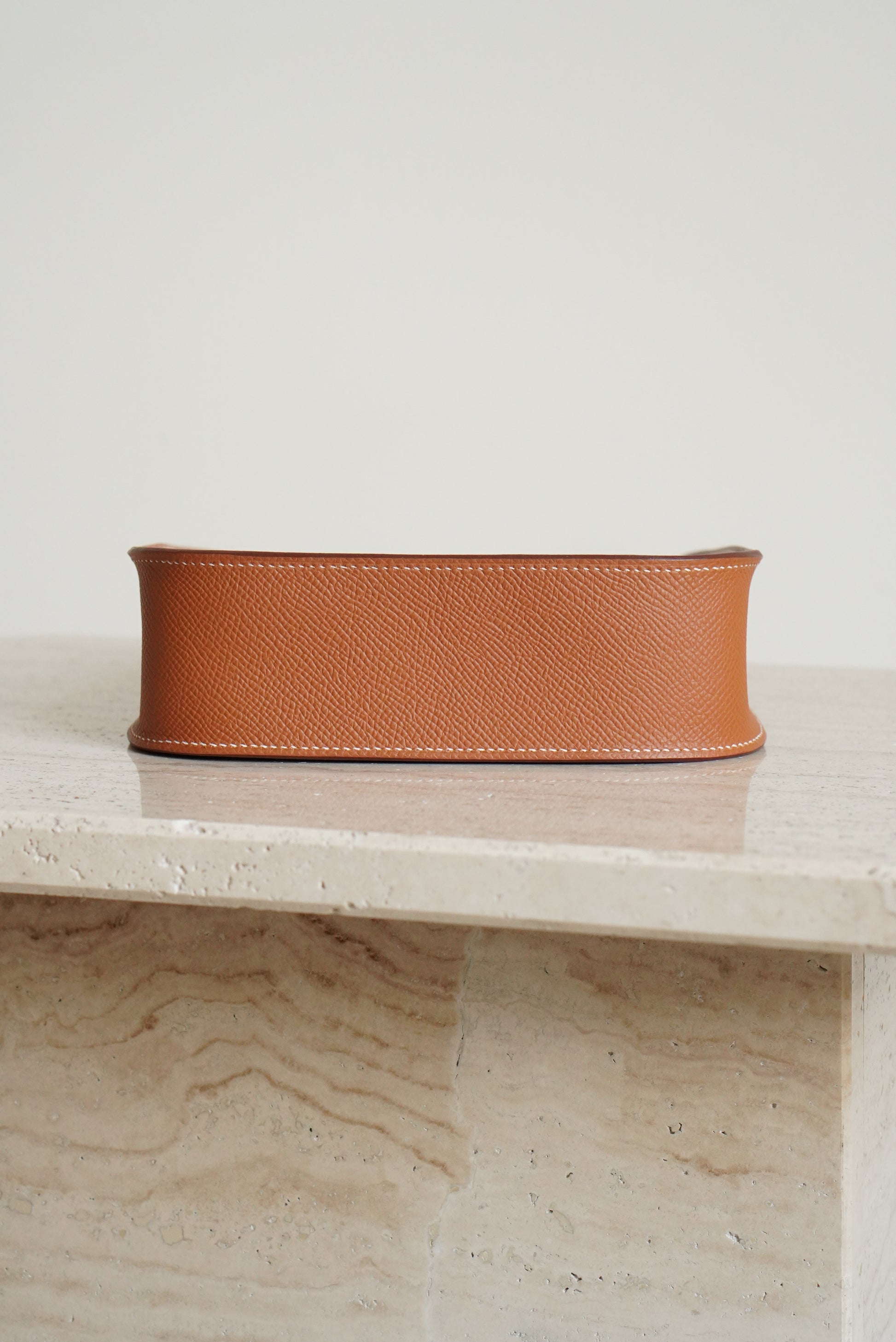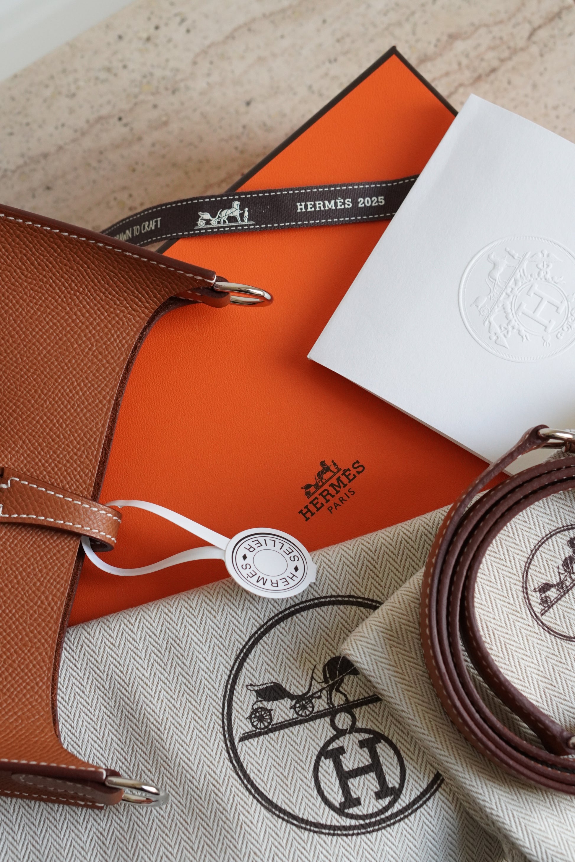 The newly re-released Hermès Evelyne 16 Sellier bag makes it the perfect everyday companion, keeping your essentials close at hand. It was originally designed to transport equestrian equipment, nowadays it strikes the perfect balance between function and fashion. The H-shaped perforation on the back, originally intended for drying grooming accessories, adds a unique touch of functionality. It has been handcrafted using Gold Epsom leather with palladium hardware. The shoulder strap can not be adjusted in length.