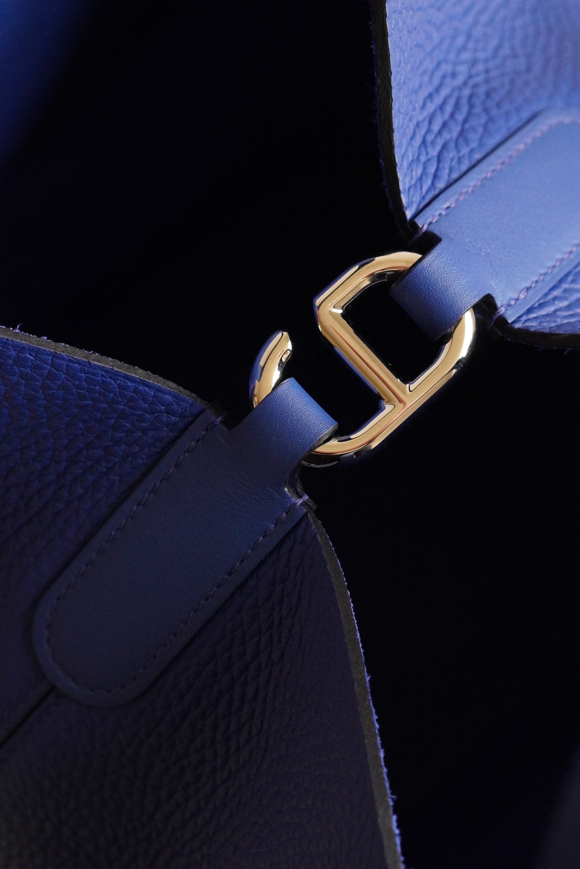 Introduced in December 2022, the Hermès In-the-Loop is one of the house’s newest and most elegant handbag designs. This model, in the rich shade of Bleu Royal, is a stunning example of Hermès craftsmanship and attention to detail. Inspired by Hermès’ iconic “Chaine d’Ancre” motif, most often seen in the brand’s jewelry, this signature design element is beautifully integrated into the bag’s handles, base, and palladium-finished closure. The handles are crafted from smooth Swift Calfskin, while the body features grained Taurillon Clémence leather, creating a refined contrast of textures. The interior includes a Swift Calfskin pocket for organization, and the bag can be carried by hand, either open or closed, offering an effortlessly chic silhouette. In size 23, the In-the-Loop is perfectly proportioned for everyday use, combining practicality with timeless Hermès elegance.