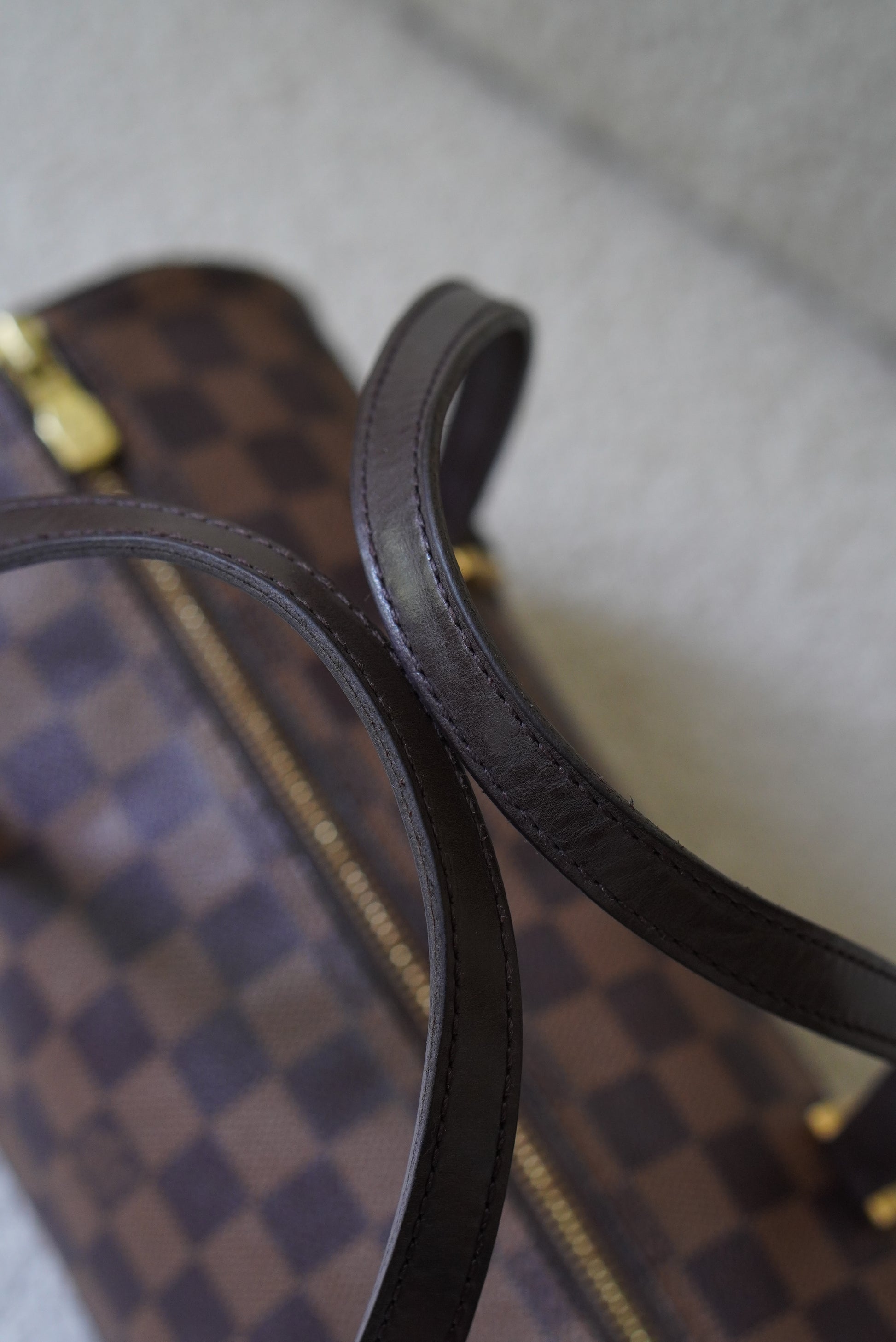 Damier Ebene canvas with gold colored hardware